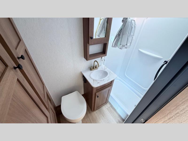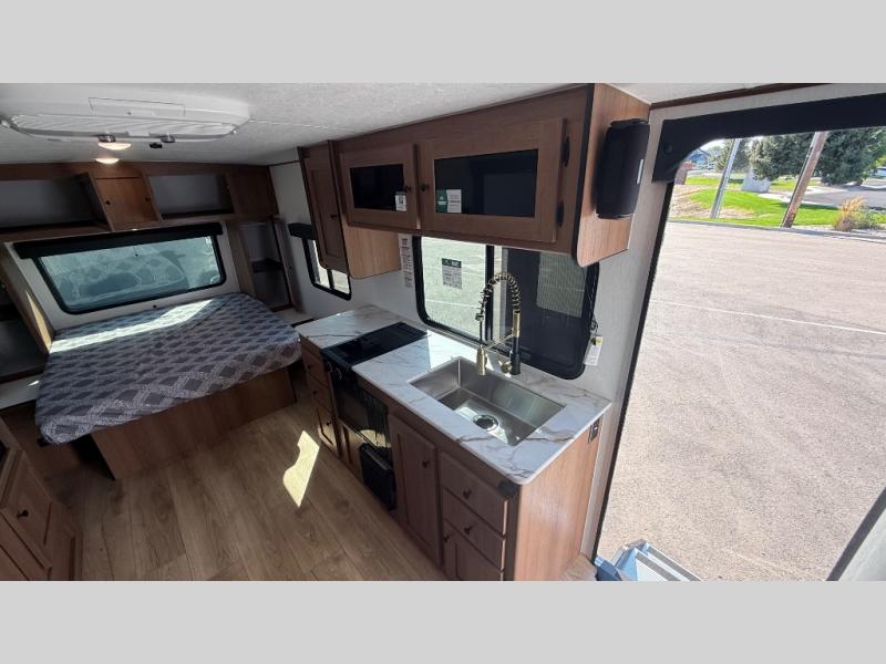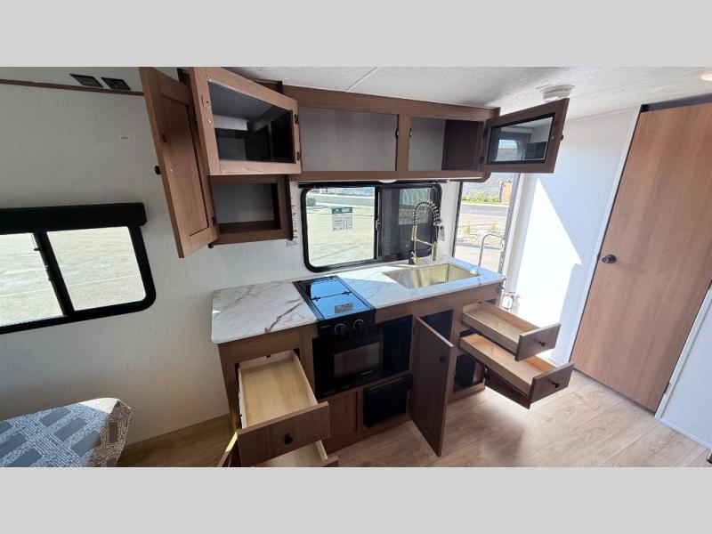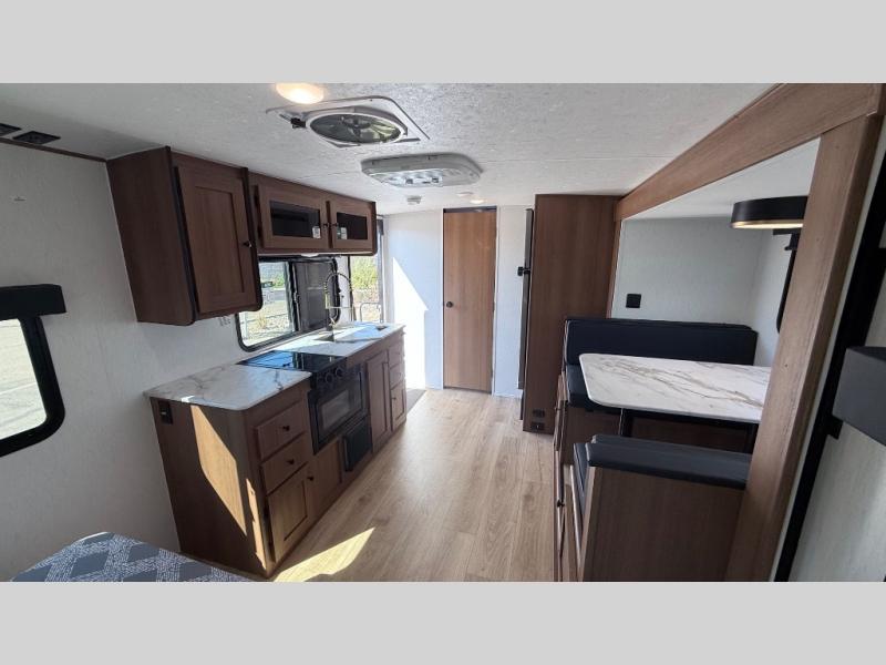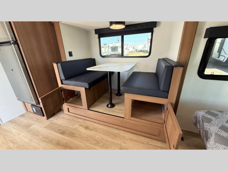 Whether you camp with friends, family or solo, this trailer gives you space for all with a spacious main living and kitchen area thanks to the booth dinette slide! The rear full bath offers a shower, sink, toilet and a wardrobe so you can get ready in privacy. A two burner cooktop and microwave underneath will let you make meals each day, and the 12V refrigerator will be perfect for perishables. The walk-around queen-size bed provides convenience when getting in and out of bed and there are two wardrobes and overhead cabinets to keep your belongings up and away. The power awning protects you from the elements when relaxing outside, and the exterior pass-through storage gives you a place to stow the outdoor equipment like camping chairs, tables, fishing poles and charcoal.