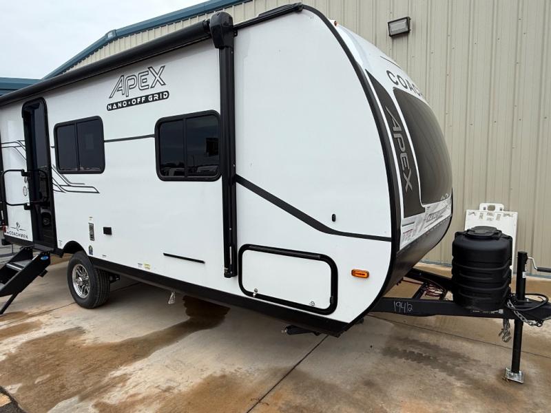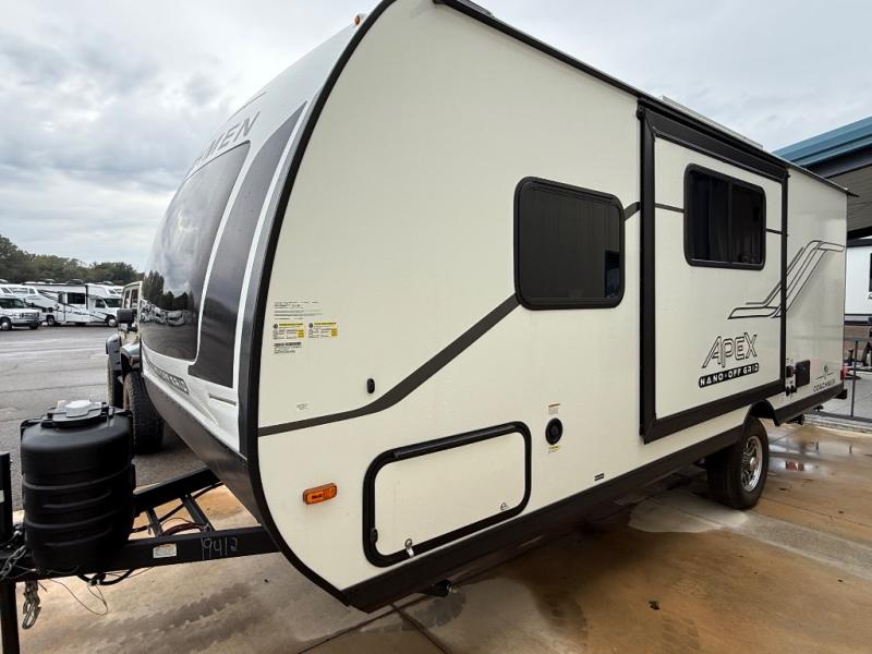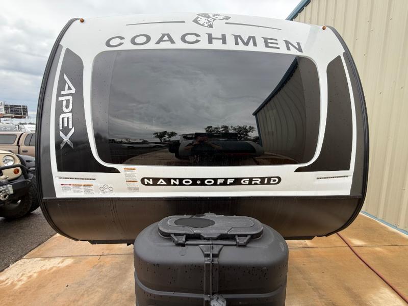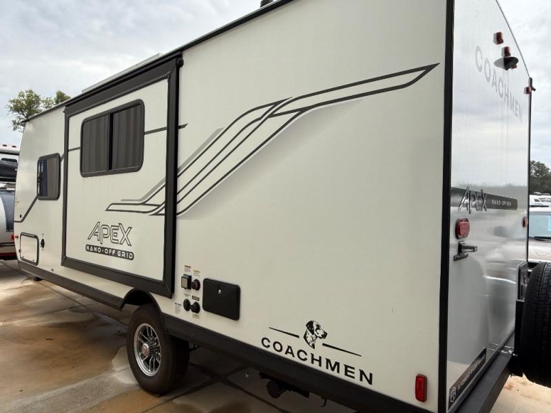 You will find comfort, convenience, and a sturdy construction with each of these Coachmen RV Apex Nano travel trailers! They are held together with an aluma-cage construction, an I-beam chassis, plus vacuum-bonded laminated dual Azdel fiberglass walls for double the protection against the elements. The 200-watt solar panel with a 30 amp control charger is included within the Off-Grid Package, along with two 20 lb. LP tanks, a high velocity power roof vent, plus 12V outlets to keep you powered up. More exterior feature include a hot/cold shower, four stabilizer jacks, a power awning with LED lighting, and magnetic baggage door catches to easily pack and unload your gear. You will love the interior of your Apex Nano with Congoleum residential flooring, one-piece seamless edge countertops, matte black hardware in the galley, and a hand-crafted wood medicine cabinet in the bath.