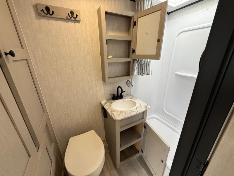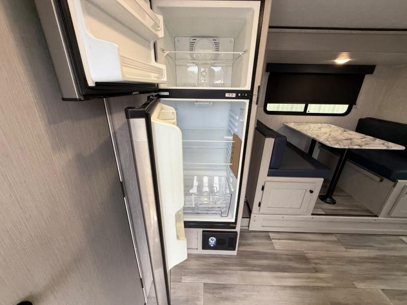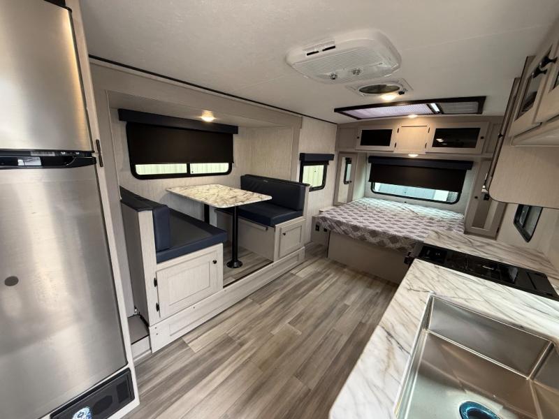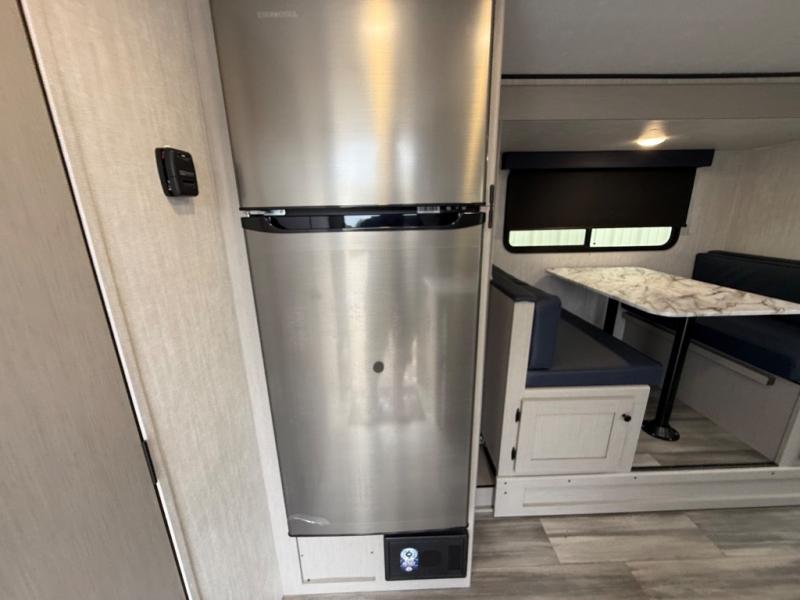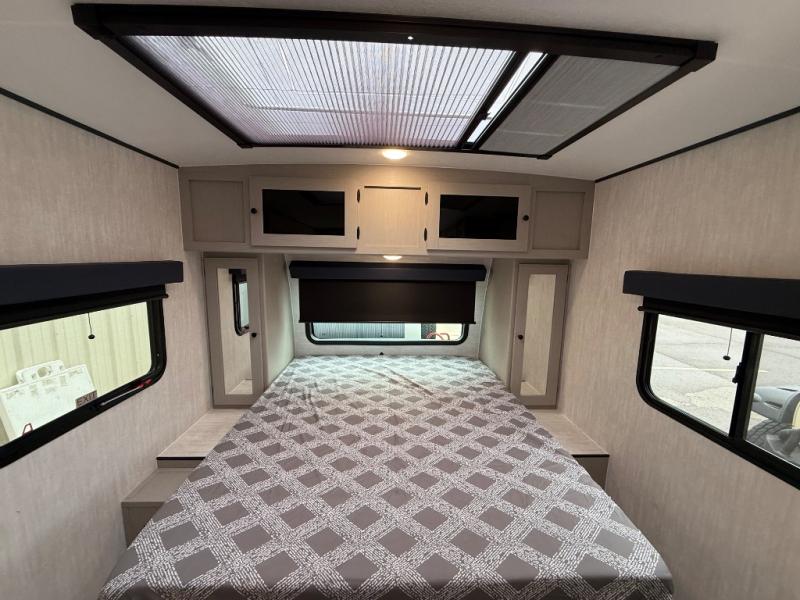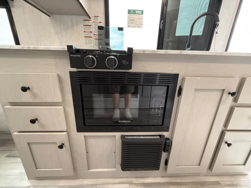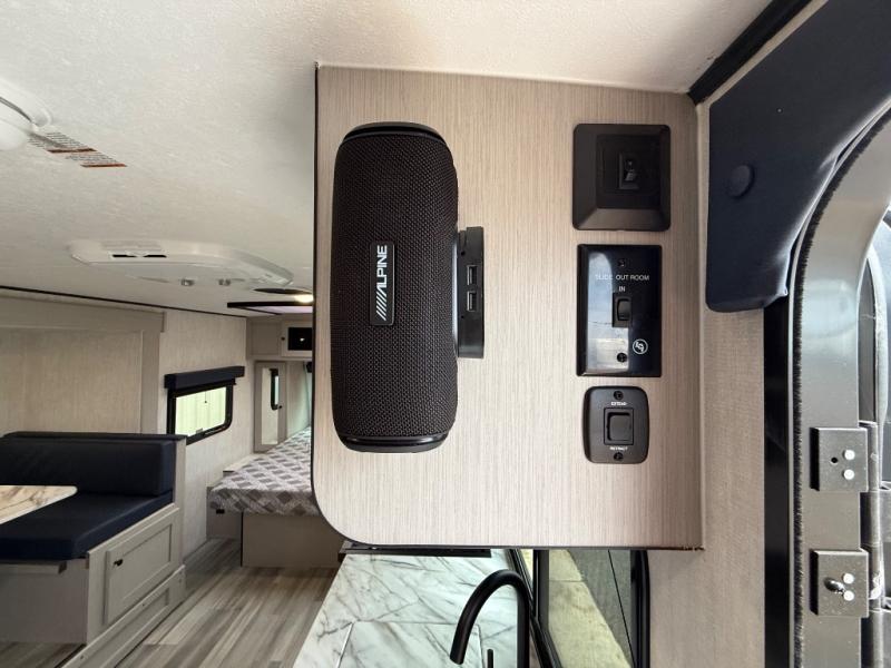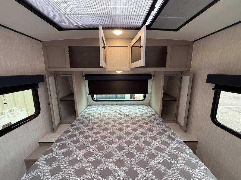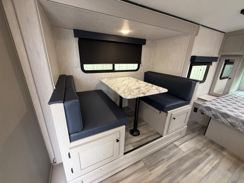 Whether you camp with friends, family or solo, this trailer gives you space for all with a spacious main living and kitchen area thanks to the booth dinette slide! The rear full bath offers a shower, sink, toilet and a wardrobe so you can get ready in privacy. A two burner cooktop and microwave underneath will let you make meals each day, and the 12V refrigerator will be perfect for perishables. The walk-around queen-size bed provides convenience when getting in and out of bed and there are two wardrobes and overhead cabinets to keep your belongings up and away. The power awning protects you from the elements when relaxing outside, and the exterior pass-through storage gives you a place to stow the outdoor equipment like camping chairs, tables, fishing poles and charcoal.