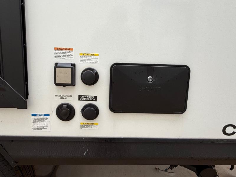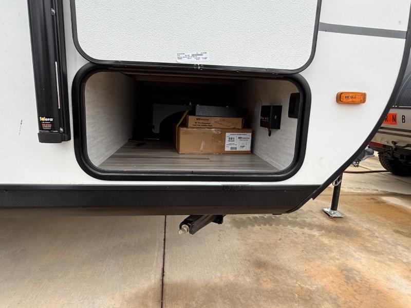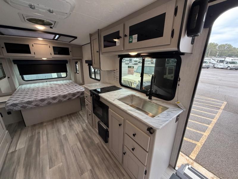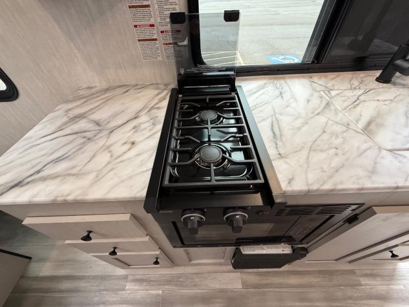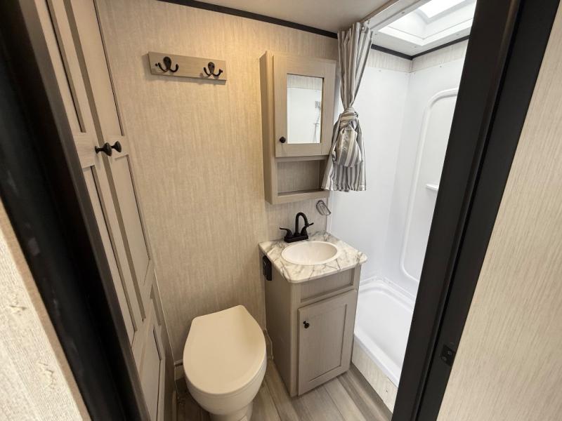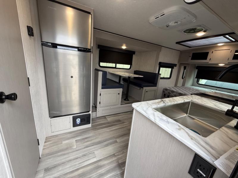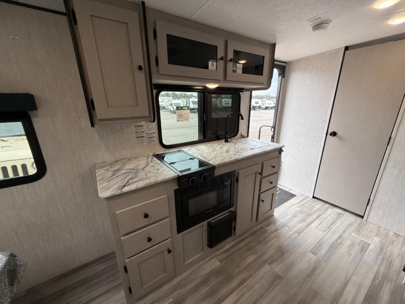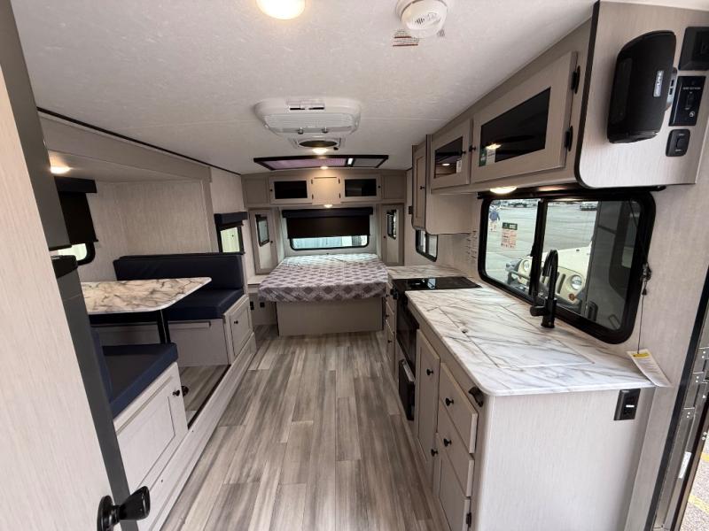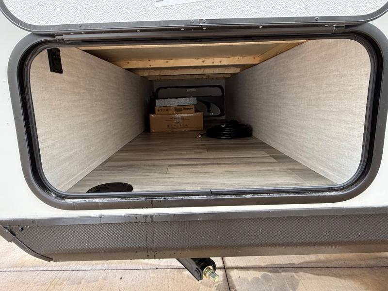 Whether you camp with friends, family or solo, this trailer gives you space for all with a spacious main living and kitchen area thanks to the booth dinette slide! The rear full bath offers a shower, sink, toilet and a wardrobe so you can get ready in privacy. A two burner cooktop and microwave underneath will let you make meals each day, and the 12V refrigerator will be perfect for perishables. The walk-around queen-size bed provides convenience when getting in and out of bed and there are two wardrobes and overhead cabinets to keep your belongings up and away. The power awning protects you from the elements when relaxing outside, and the exterior pass-through storage gives you a place to stow the outdoor equipment like camping chairs, tables, fishing poles and charcoal.