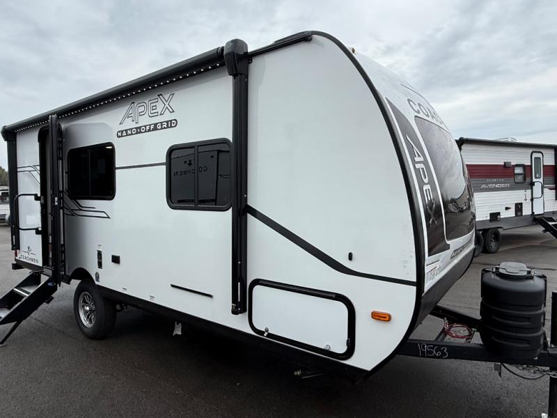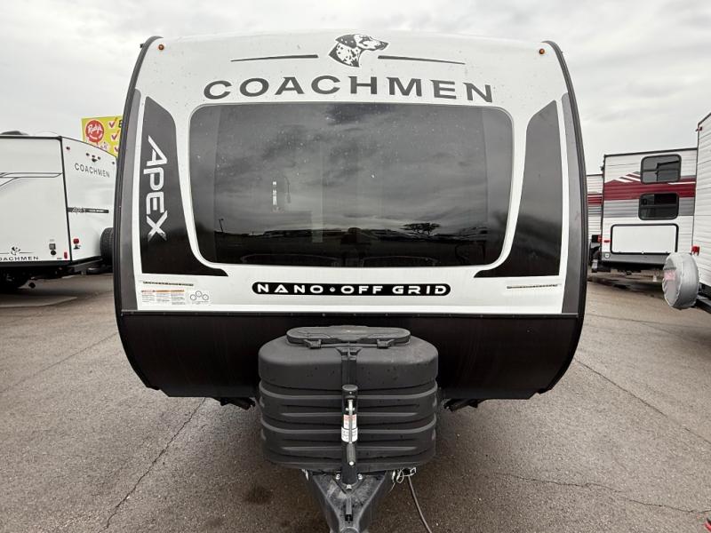 You will find comfort, convenience, and a sturdy construction with each of these Coachmen RV Apex Nano travel trailers! They are held together with an aluma-cage construction, an I-beam chassis, plus vacuum-bonded laminated dual Azdel fiberglass walls for double the protection against the elements. The 200-watt solar panel with a 30 amp control charger is included within the Off-Grid Package, along with two 20 lb. LP tanks, a high velocity power roof vent, plus 12V outlets to keep you powered up. More exterior feature include a hot/cold shower, four stabilizer jacks, a power awning with LED lighting, and magnetic baggage door catches to easily pack and unload your gear. You will love the interior of your Apex Nano with Congoleum residential flooring, one-piece seamless edge countertops, matte black hardware in the galley, and a hand-crafted wood medicine cabinet in the bath.