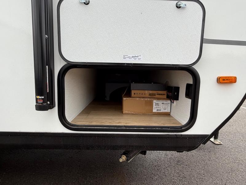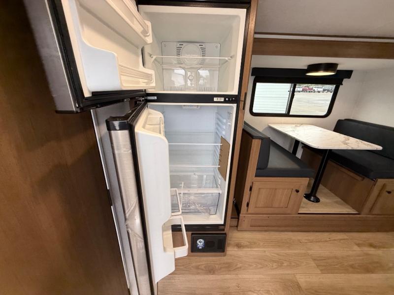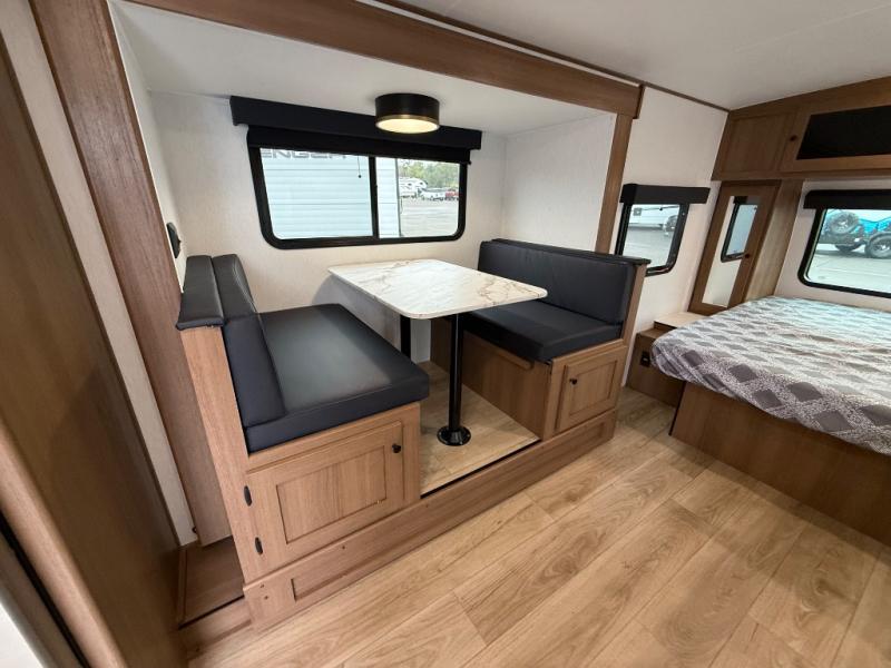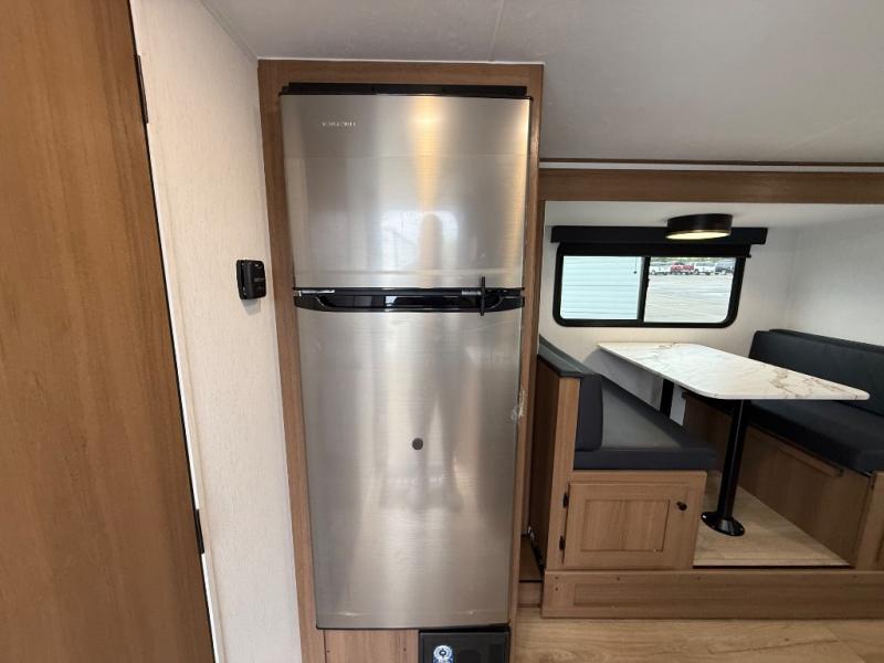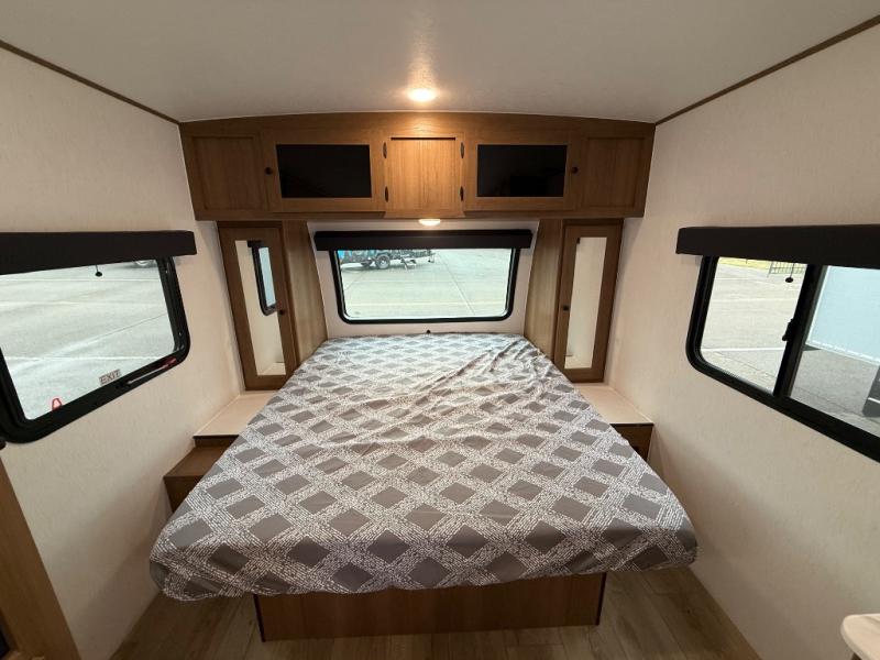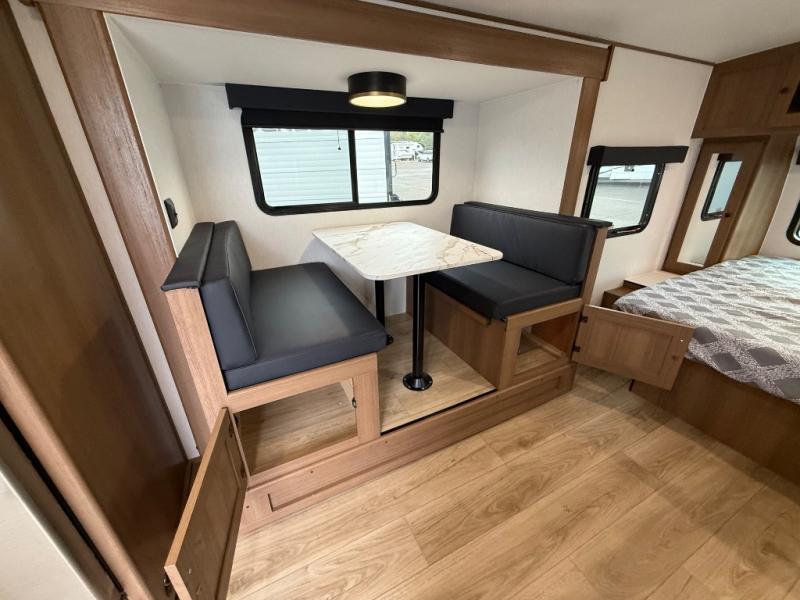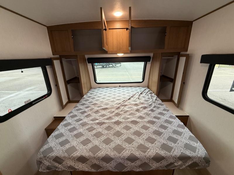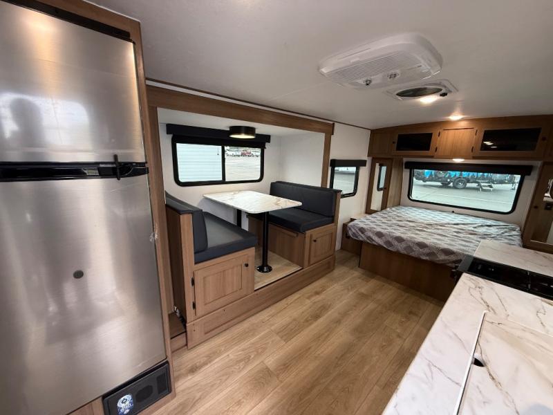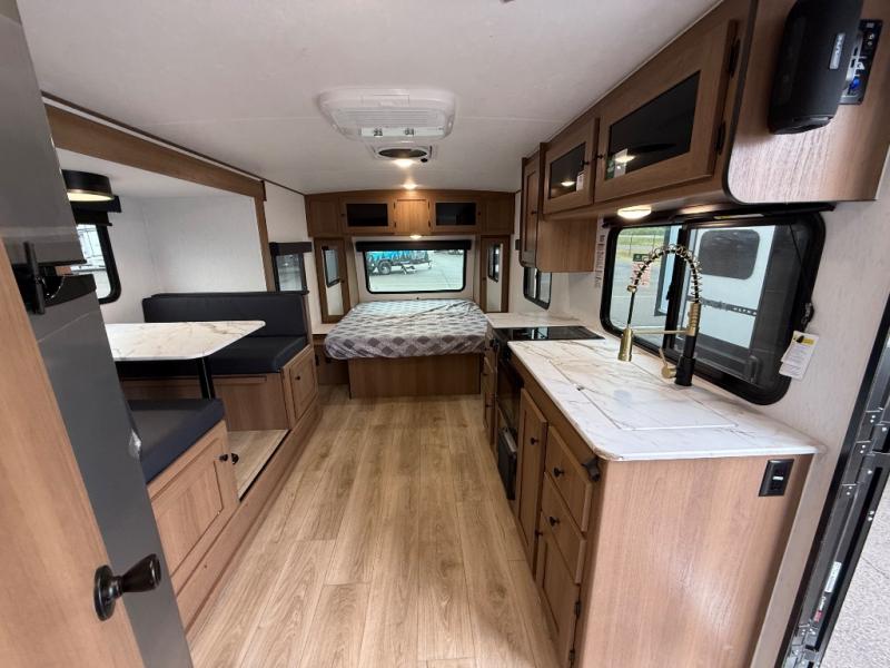 Whether you camp with friends, family or solo, this trailer gives you space for all with a spacious main living and kitchen area thanks to the booth dinette slide! The rear full bath offers a shower, sink, toilet and a wardrobe so you can get ready in privacy. A two burner cooktop and microwave underneath will let you make meals each day, and the 12V refrigerator will be perfect for perishables. The walk-around queen-size bed provides convenience when getting in and out of bed and there are two wardrobes and overhead cabinets to keep your belongings up and away. The power awning protects you from the elements when relaxing outside, and the exterior pass-through storage gives you a place to stow the outdoor equipment like camping chairs, tables, fishing poles and charcoal.