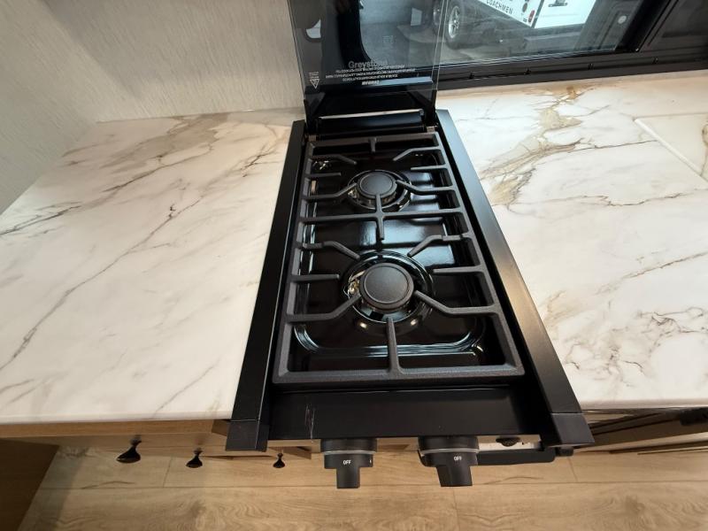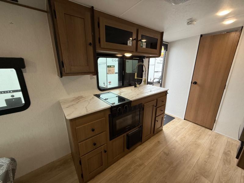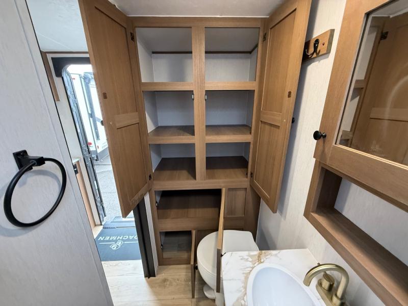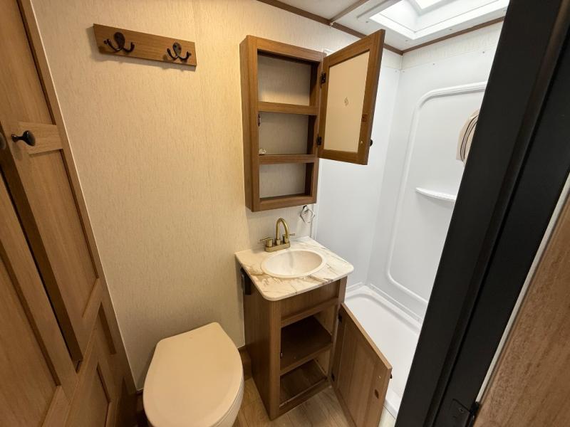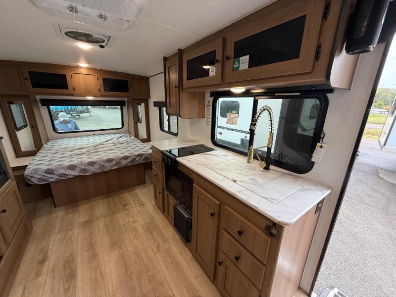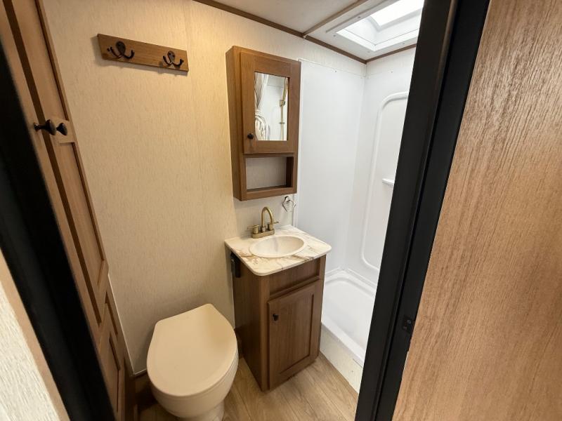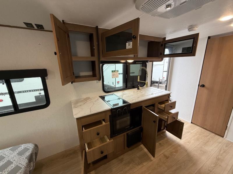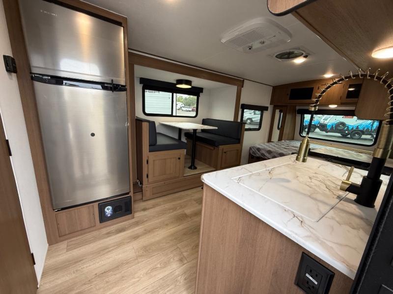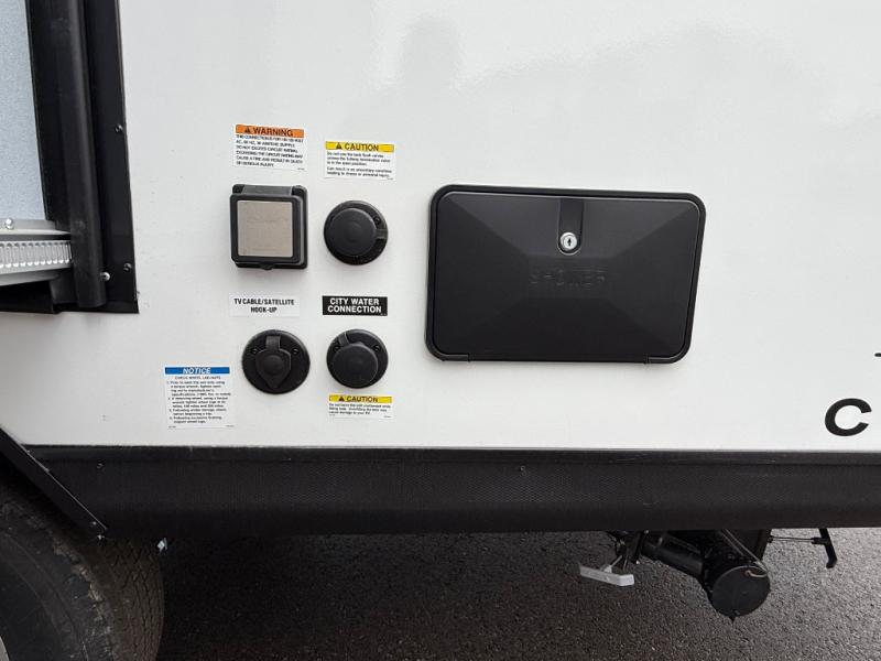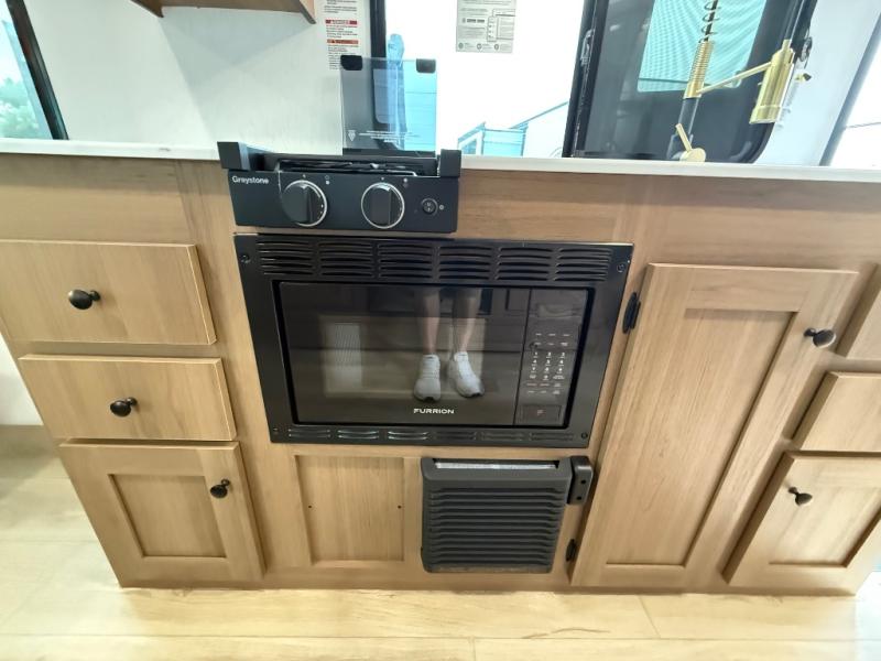 Whether you camp with friends, family or solo, this trailer gives you space for all with a spacious main living and kitchen area thanks to the booth dinette slide! The rear full bath offers a shower, sink, toilet and a wardrobe so you can get ready in privacy. A two burner cooktop and microwave underneath will let you make meals each day, and the 12V refrigerator will be perfect for perishables. The walk-around queen-size bed provides convenience when getting in and out of bed and there are two wardrobes and overhead cabinets to keep your belongings up and away. The power awning protects you from the elements when relaxing outside, and the exterior pass-through storage gives you a place to stow the outdoor equipment like camping chairs, tables, fishing poles and charcoal.