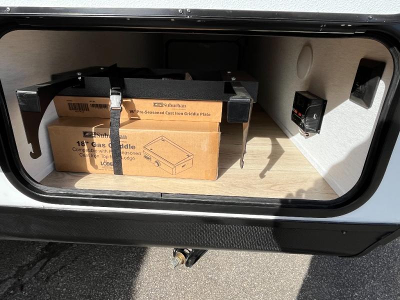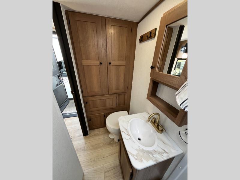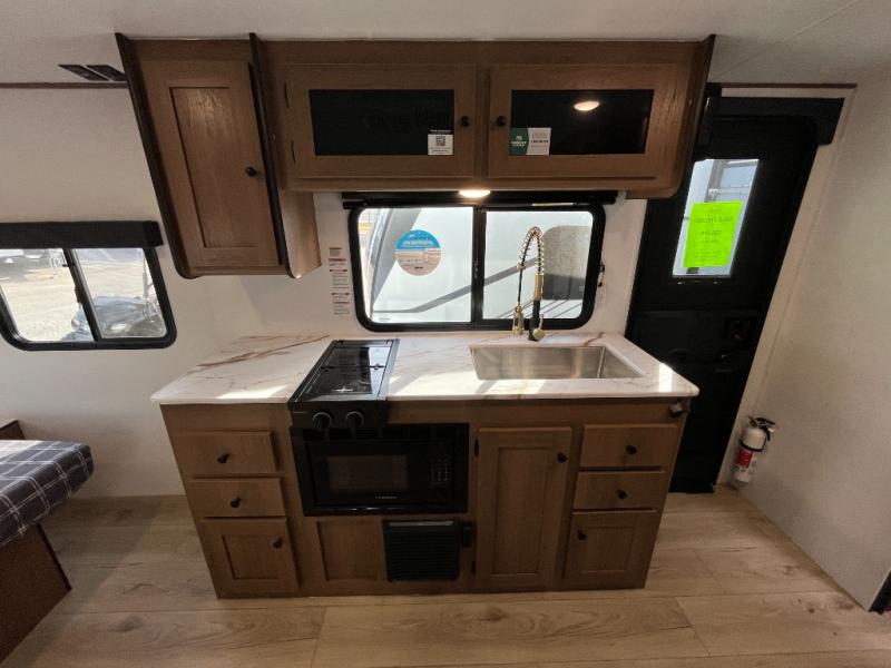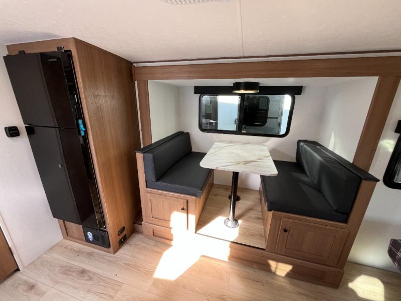 Whether you camp with friends, family or solo, this trailer gives you space for all with a spacious main living and kitchen area thanks to the booth dinette slide! The rear full bath offers a shower, sink, toilet and a wardrobe so you can get ready in privacy. A two-burner cooktop and microwave underneath will let you make meals each day, and the 12V refrigerator will be perfect for perishables. The walk-around queen-size bed provides convenience when getting in and out of bed and there are two wardrobes and overhead cabinets to keep your belongings up and away. The power awning protects you from the elements when relaxing outside, and the exterior pass-through storage gives you a place to stow the outdoor equipment like camping chairs, tables, fishing poles and charcoal.