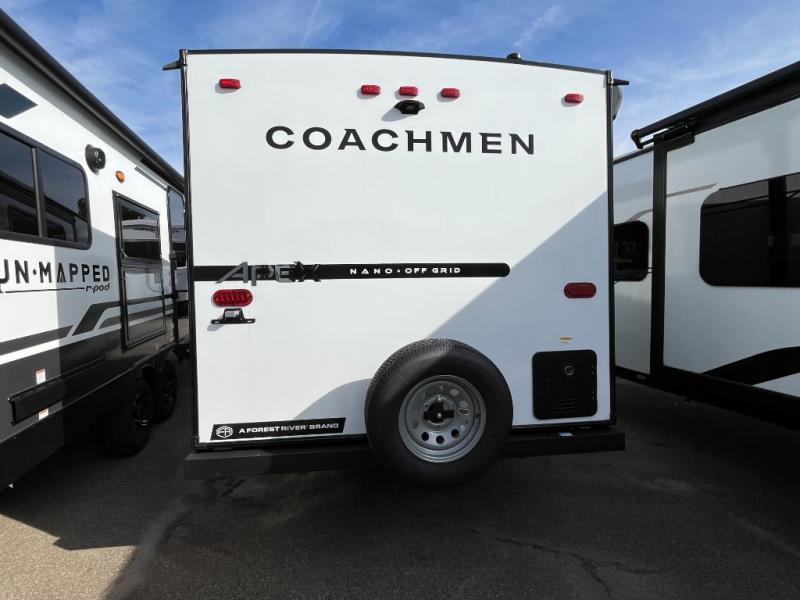 You will find comfort, convenience, and a sturdy construction with each of these Coachmen RV Apex Nano travel trailers! They are held together with an aluma-cage construction, an I-beam chassis, plus vacuum-bonded laminated dual Azdel fiberglass walls for double the protection against the elements. The 400-watt solar panel with a 30 amp control charger is included, along with two 20 lb. LP tanks, a high velocity power roof vent, plus 12V outlets to keep you powered up. More exterior features include a hot/cold shower, four stabilizer jacks, a power awning with LED lighting, and radius thumb latch baggage doors to easily pack and unload your gear. You will love the interior of your Apex Nano with Congoleum residential flooring, one-piece seamless edge countertops, matte black hardware in the galley, and a hand-crafted wood medicine cabinet in the bath.