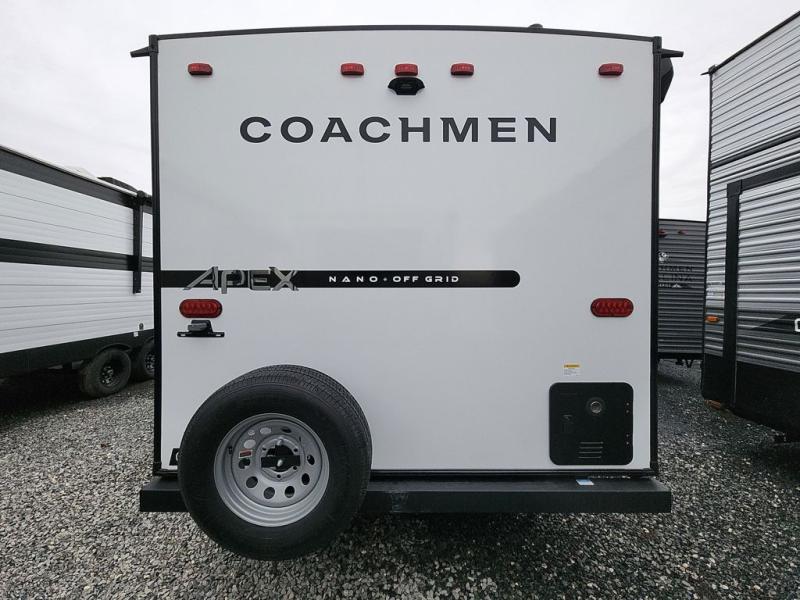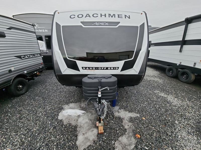 You will find comfort, convenience, and a sturdy construction with each of these Coachmen RV Apex Nano travel trailers! They are held together with an aluma-cage construction, an I-beam chassis, plus vacuum-bonded laminated dual Azdel fiberglass walls for double the protection against the elements. The 400-watt solar panel with a 30 amp control charger is included, along with two 20 lb. LP tanks, a high velocity power roof vent, plus 12V outlets to keep you powered up. More exterior features include a hot/cold shower, four stabilizer jacks, a power awning with LED lighting, and radius thumb latch baggage doors to easily pack and unload your gear. You will love the interior of your Apex Nano with Congoleum residential flooring, one-piece seamless edge countertops, matte black hardware in the galley, and a hand-crafted wood medicine cabinet in the bath.
