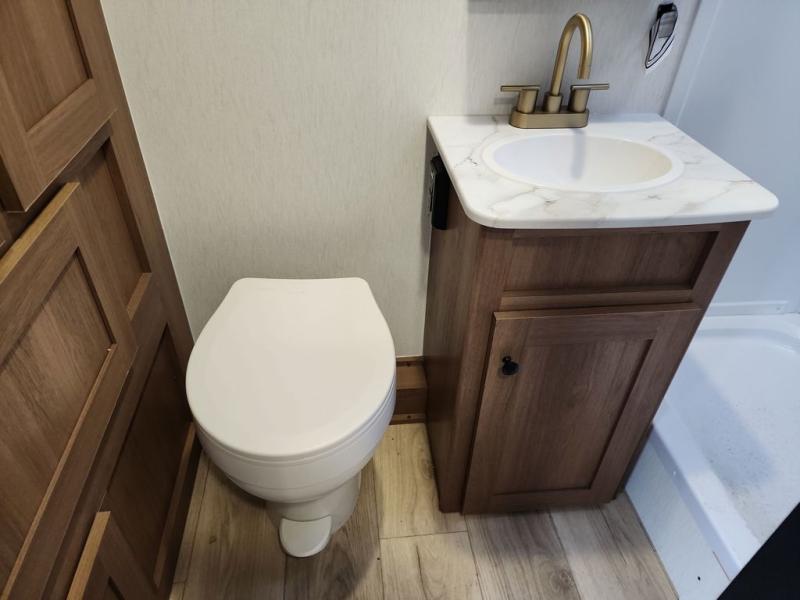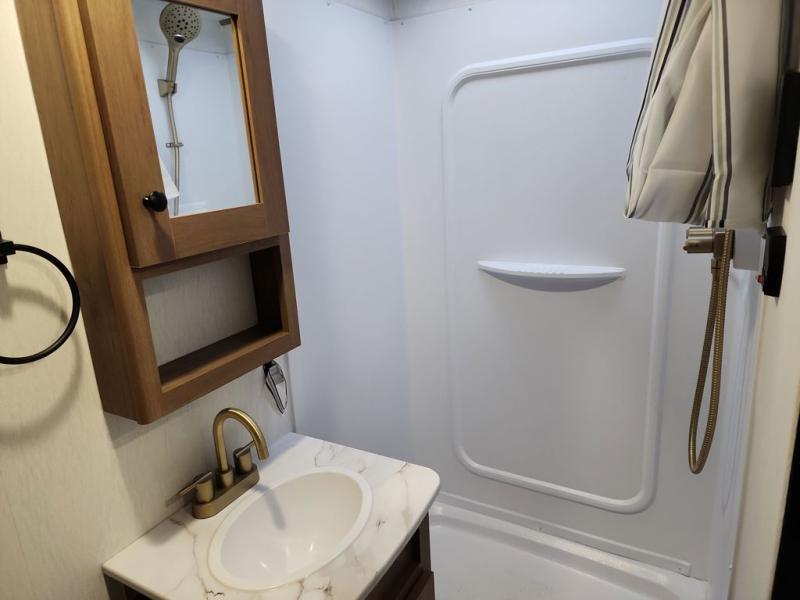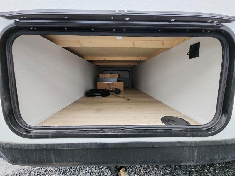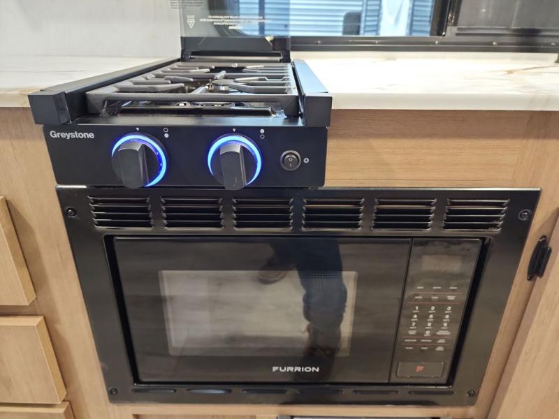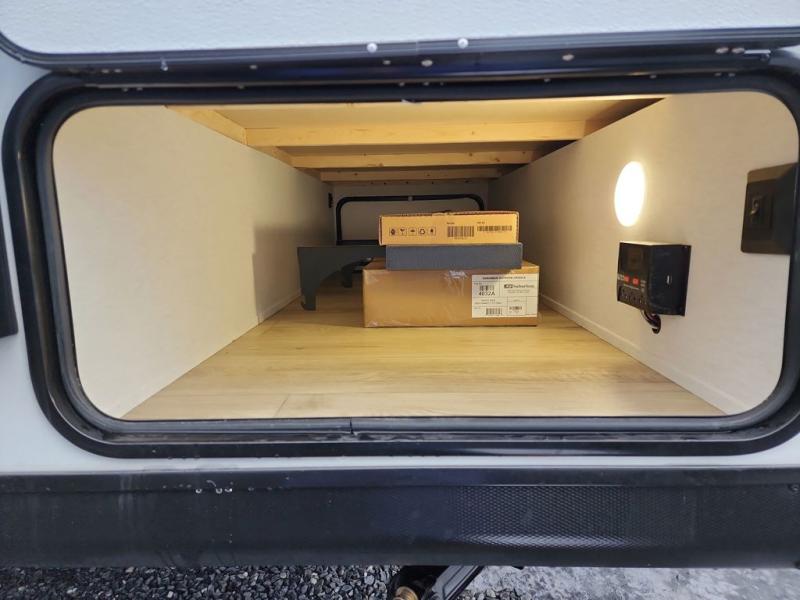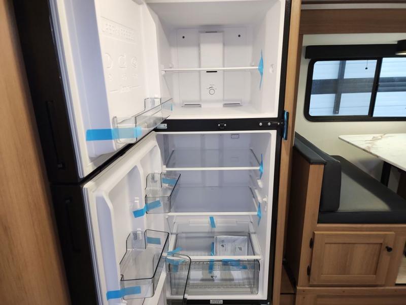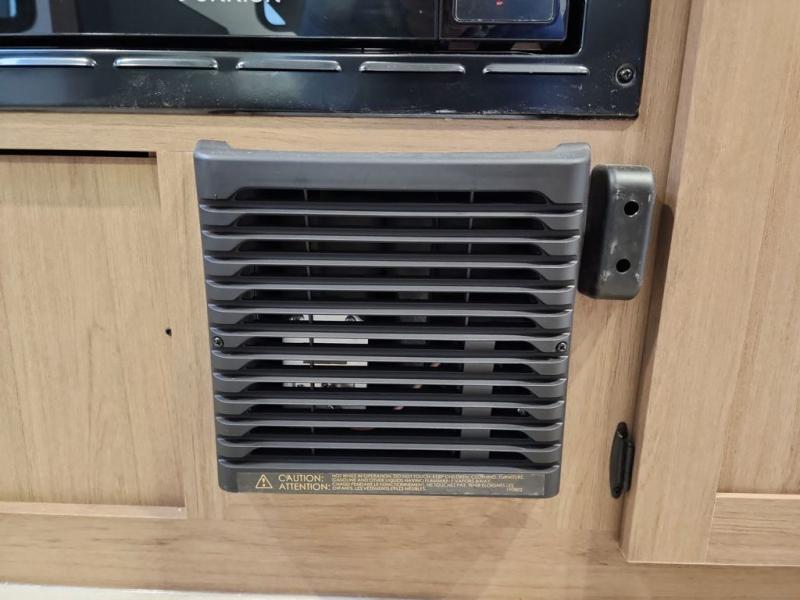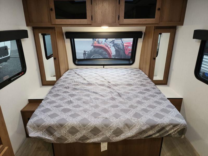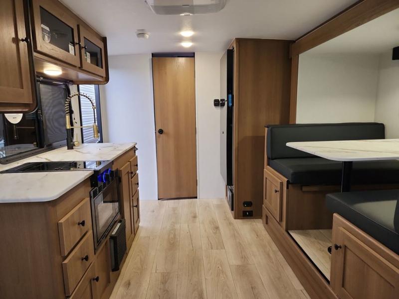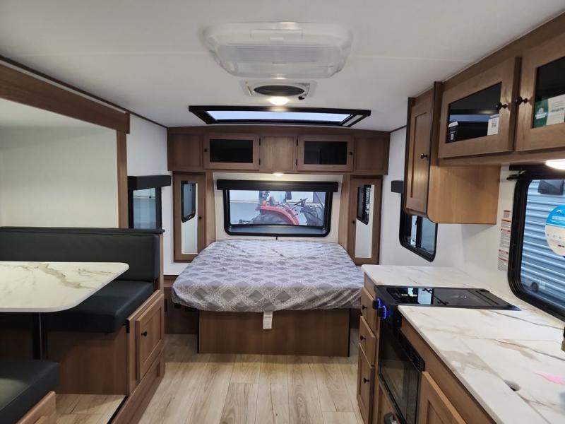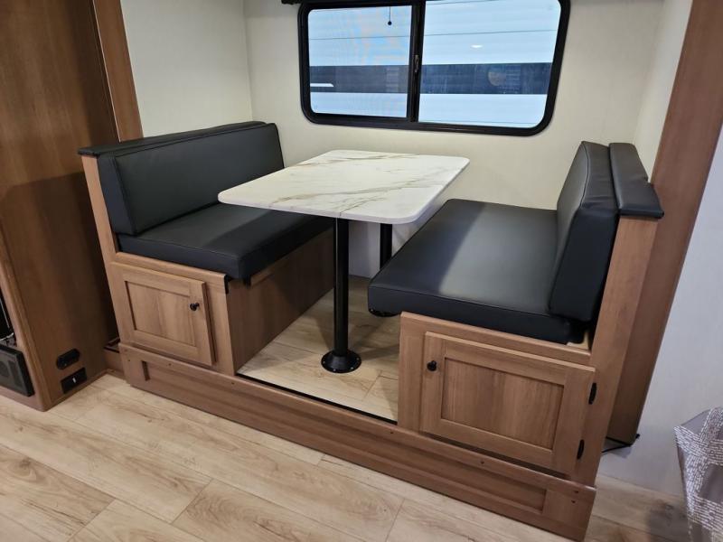 Whether you camp with friends, family or solo, this trailer gives you space for all with a spacious main living and kitchen area thanks to the booth dinette slide! The rear full bath offers a shower, sink, toilet and a wardrobe so you can get ready in privacy. A two-burner cooktop and microwave underneath will let you make meals each day, and the 12V refrigerator will be perfect for perishables. The walk-around queen-size bed provides convenience when getting in and out of bed and there are two wardrobes and overhead cabinets to keep your belongings up and away. The power awning protects you from the elements when relaxing outside, and the exterior pass-through storage gives you a place to stow the outdoor equipment like camping chairs, tables, fishing poles and charcoal.