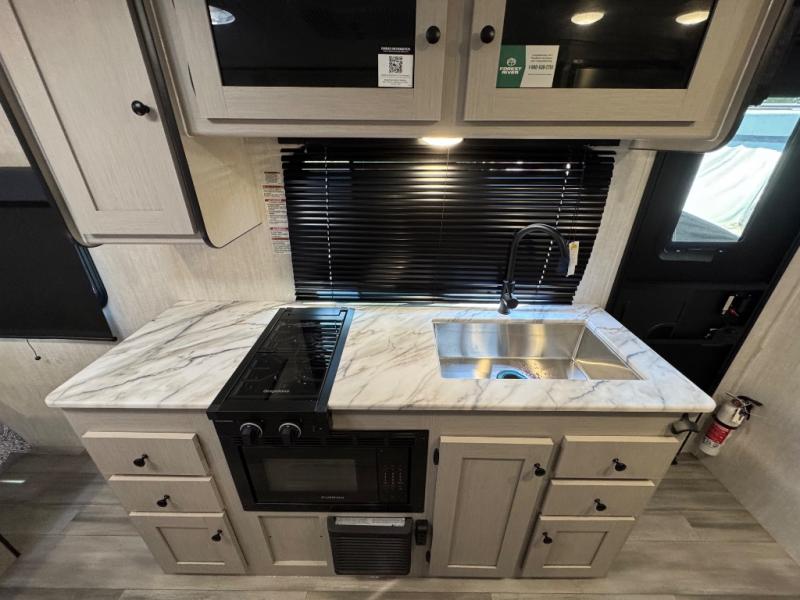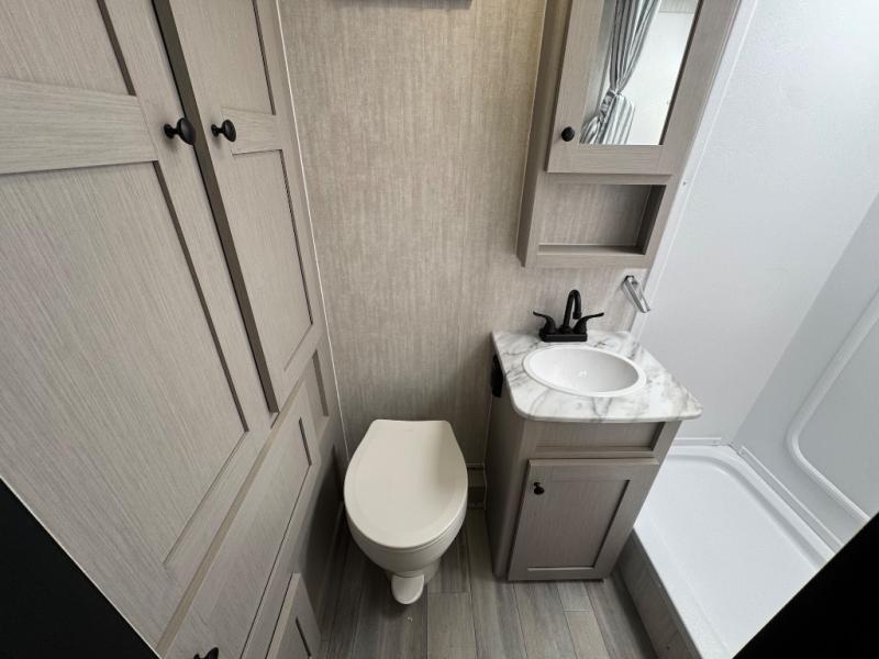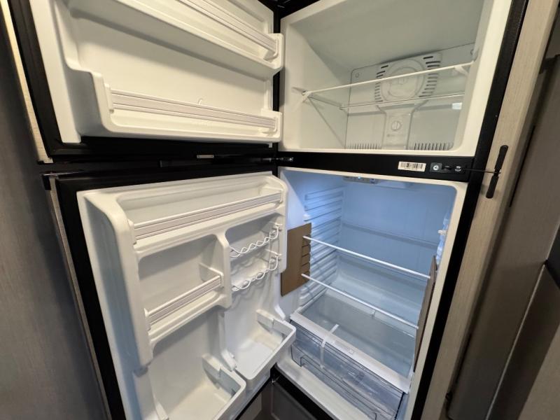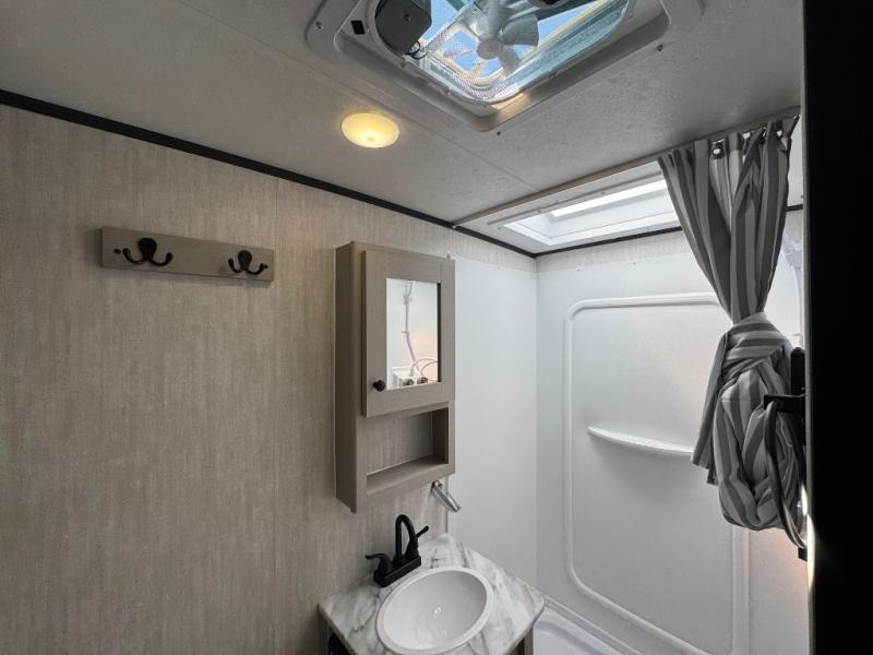 Whether you camp with friends, family or solo, this trailer gives you space for all with a spacious main living and kitchen area thanks to the booth dinette slide! The rear full bath offers a shower, sink, toilet and a wardrobe so you can get ready in privacy. A two-burner cooktop and microwave underneath will let you make meals each day, and the 12V refrigerator will be perfect for perishables. The walk-around queen-size bed provides convenience when getting in and out of bed and there are two wardrobes and overhead cabinets to keep your belongings up and away. The power awning protects you from the elements when relaxing outside, and the exterior pass-through storage gives you a place to stow the outdoor equipment like camping chairs, tables, fishing poles and charcoal.
