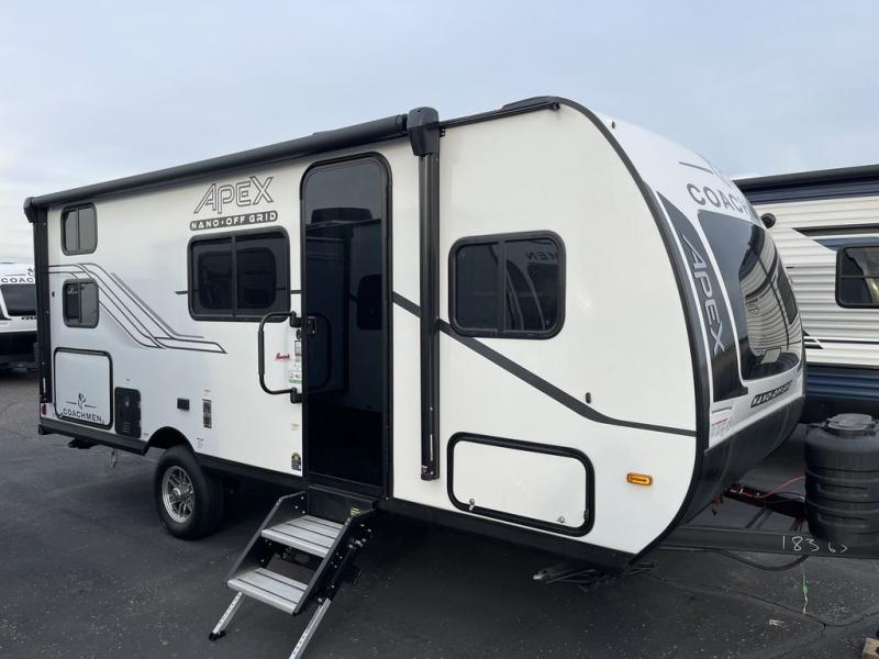 You will find comfort, convenience, and a sturdy construction with each of these Coachmen RV Apex Nano travel trailers! They are held together with an aluma-cage construction, an I-beam chassis, plus vacuum-bonded laminated dual Azdel fiberglass walls for double the protection against the elements. The 200-watt solar panel with a 30 amp control charger is included within the Off-Grid Package, along with two 20 lb. LP tanks, a high velocity power roof vent, plus 12V outlets to keep you powered up. More exterior feature include a hot/cold shower, four stabilizer jacks, a power awning with LED lighting, and magnetic baggage door catches to easily pack and unload your gear. You will love the interior of your Apex Nano with Congoleum residential flooring, one-piece seamless edge countertops, matte black hardware in the galley, and a hand-crafted wood medicine cabinet in the bath.