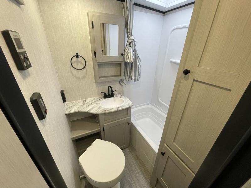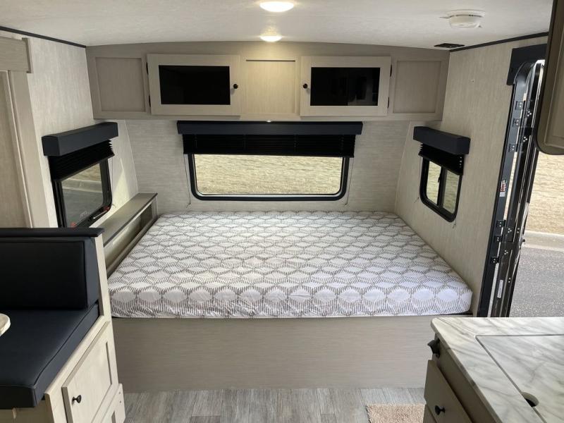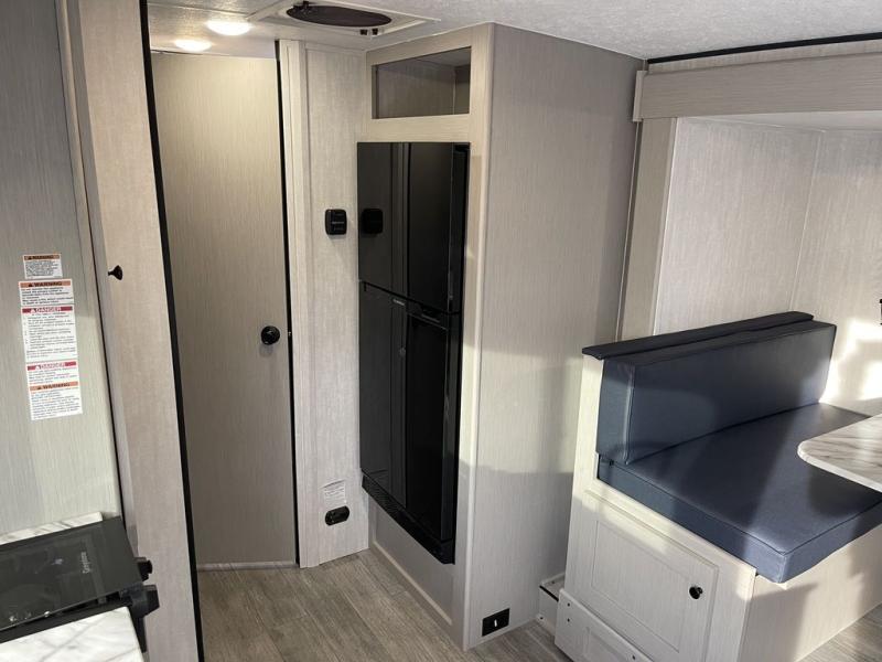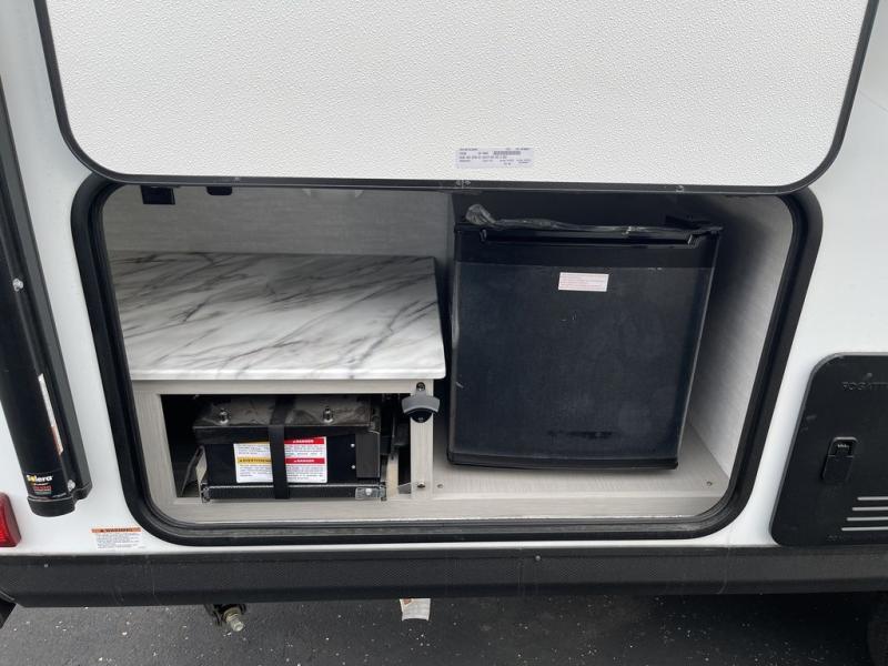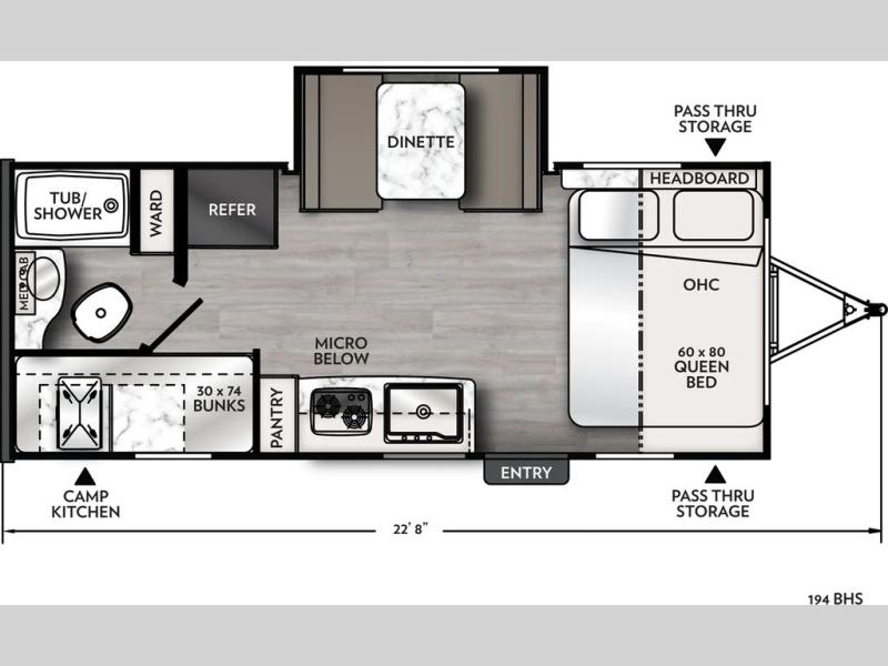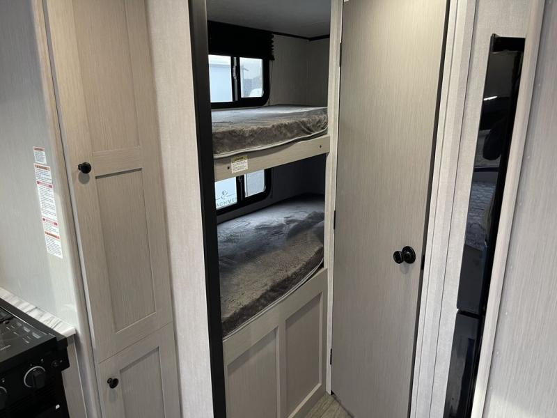 You will have more interior space with a booth dinette slide in this travel trailer! The chef will love cooking indoors with the two burner cooktop, microwave, and 8 cu. ft. 12V refrigerator, as well as outdoors with the exterior camp kitchen. Start each morning feeling clean and refreshed after sleeping on the front queen bed with a headboard and showering in the tub/shower inside the rear corner bathroom, plus the bathroom has a wardrobe to keep your towels close. The kids will love sleeping on the rear corner set of 30" x 74" bunk beds too!
