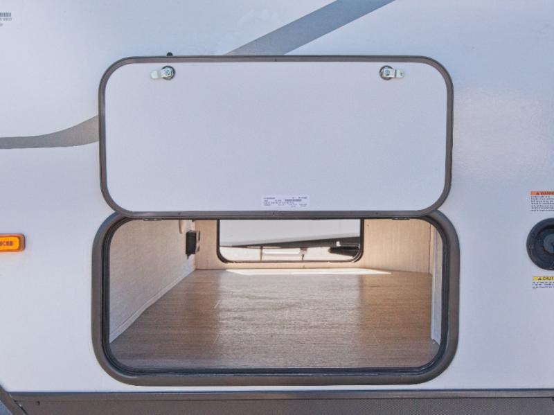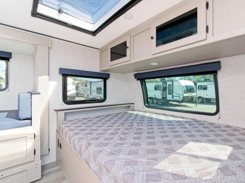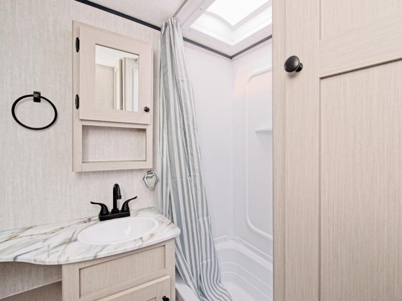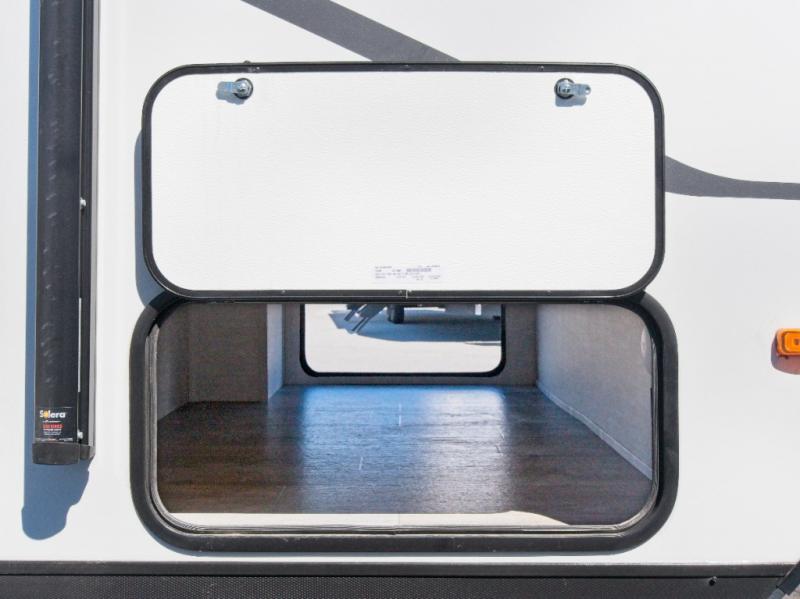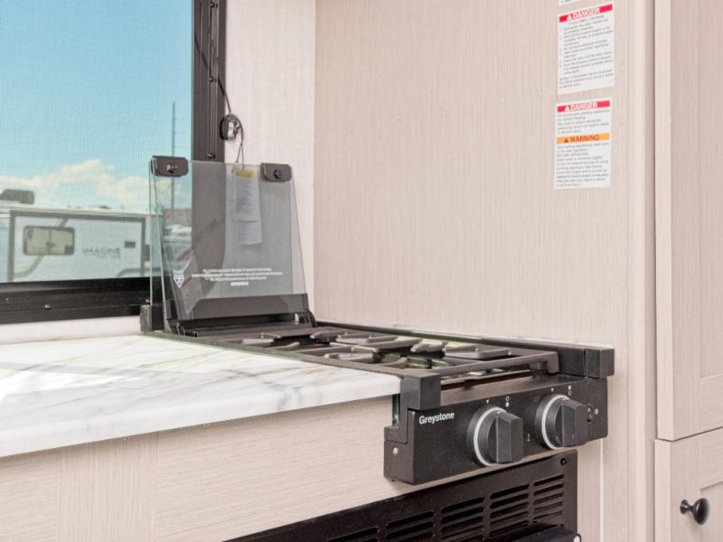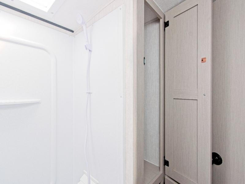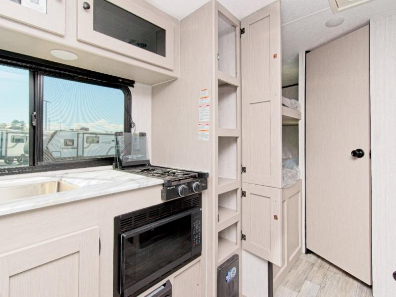 The fully equipped kitchen includes a 2-burner cooktop, microwave, and 8 cu. ft. 12V refrigerator, while the exterior camp kitchen lets you cook outdoors and enjoy the fresh air. Start your day with a hot shower in the rear corner bathroom, which also features a wardrobe for convenient towel and toiletry storage.
