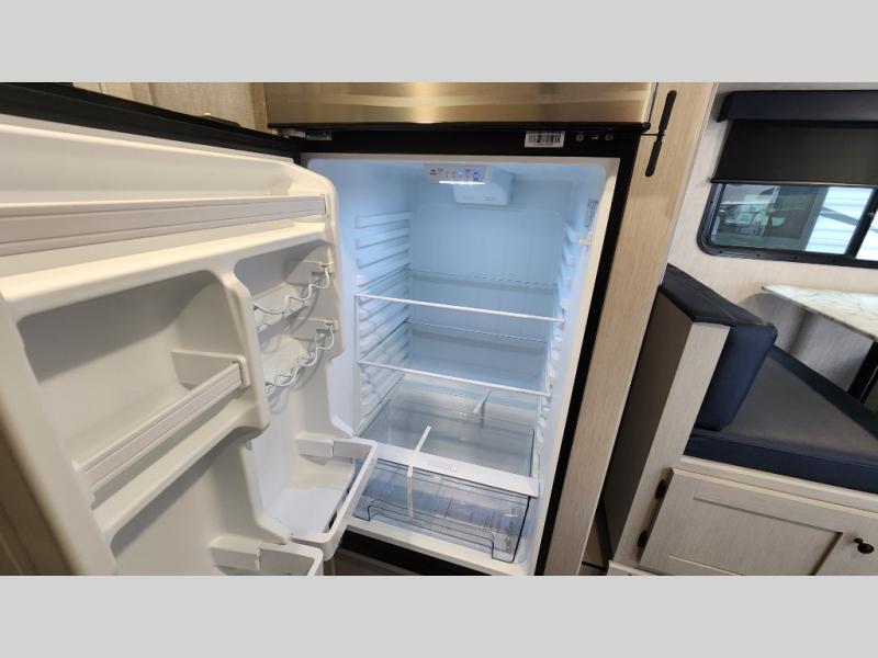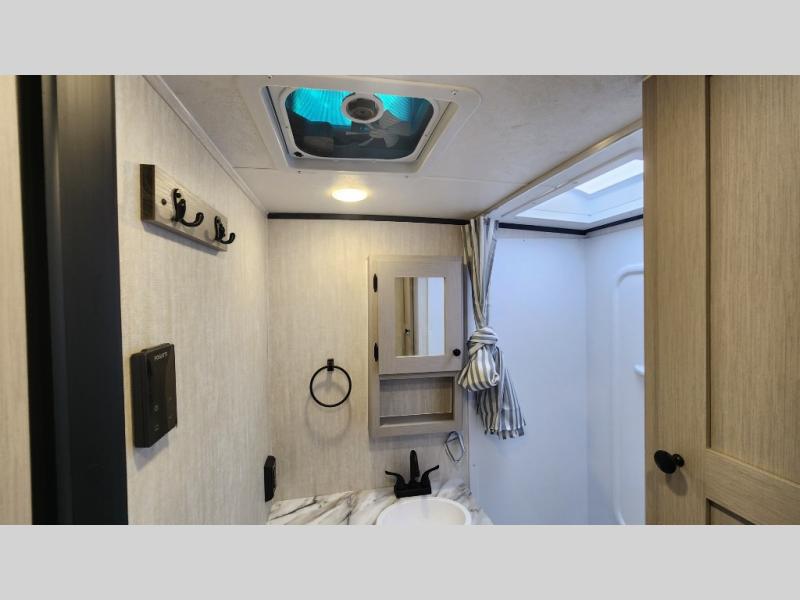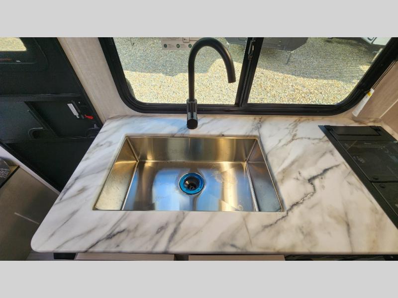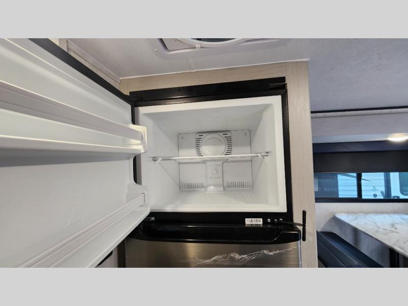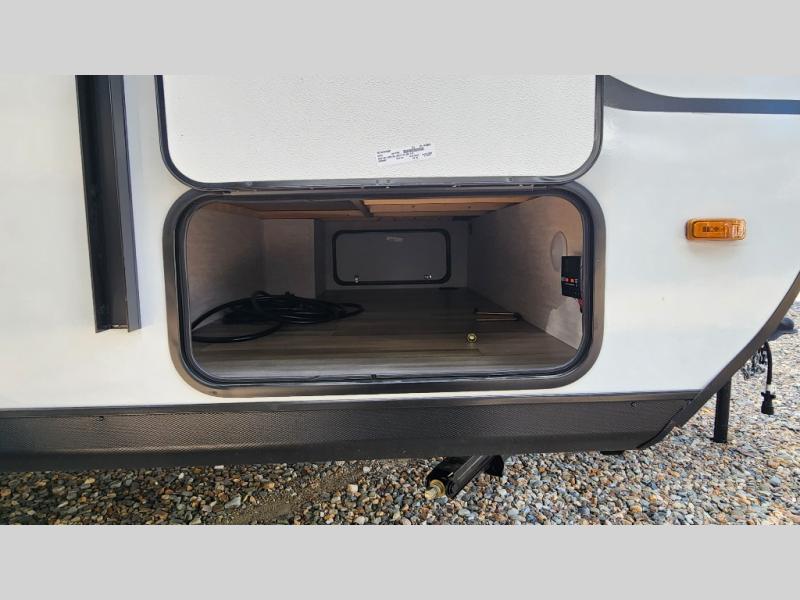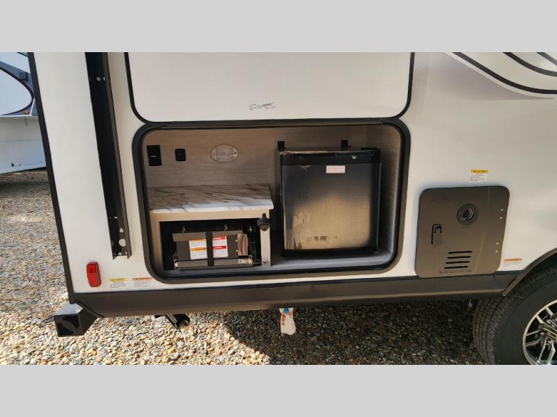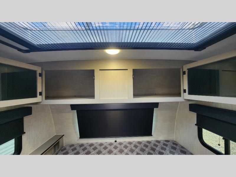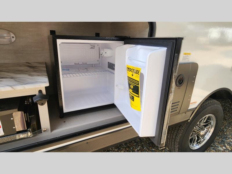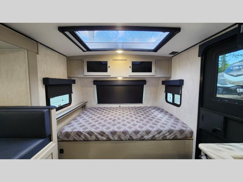 This model is off-grid ready, with Azdel composite construction, a 100-watt solar panel, enclosed underbelly, and rugged all-terrain tires — built to explore far beyond the campground.