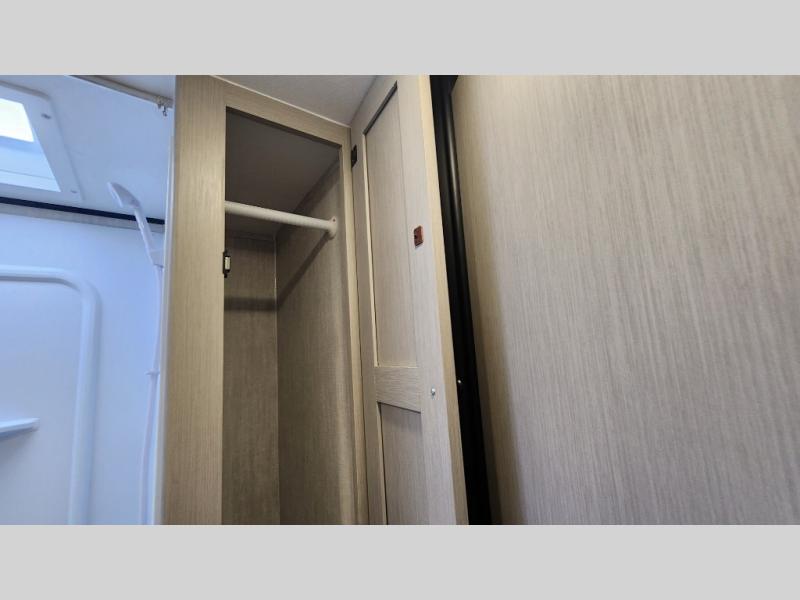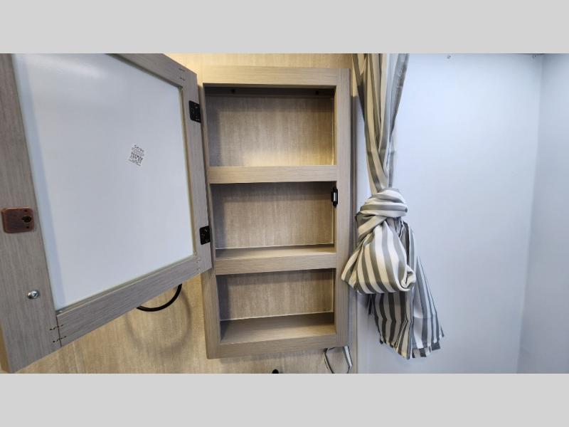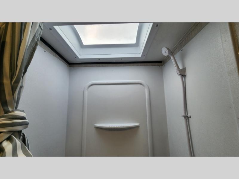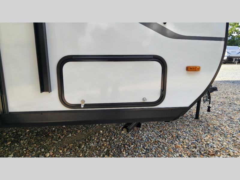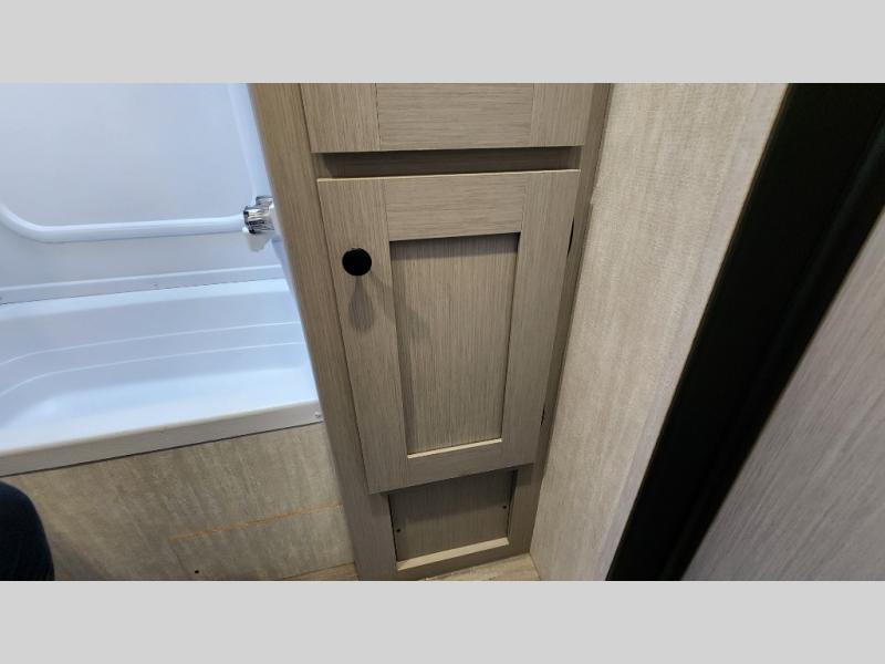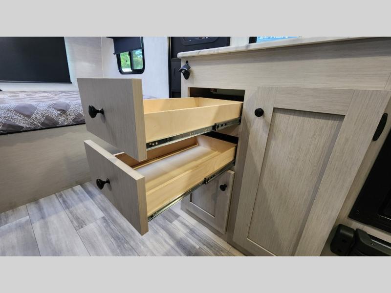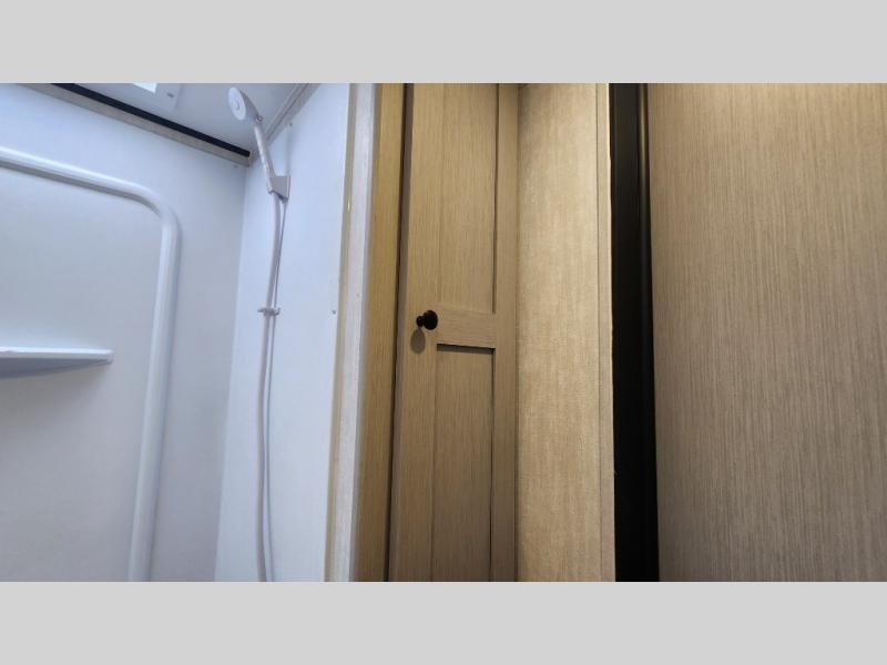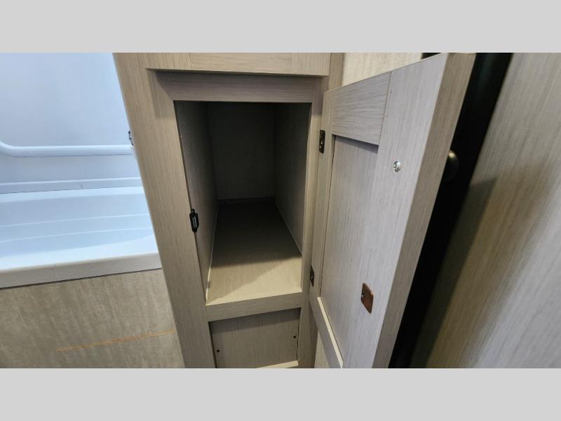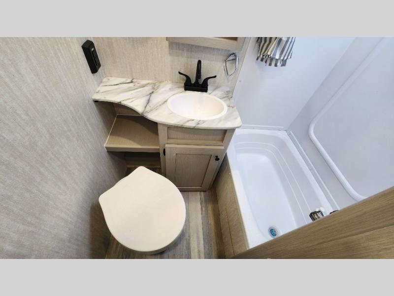 This model is off-grid ready, with Azdel composite construction, a 100-watt solar panel, enclosed underbelly, and rugged all-terrain tires — built to explore far beyond the campground.
