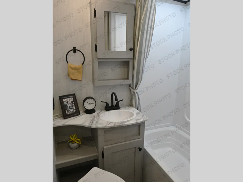 You will have more interior space with a booth dinette slide in this travel trailer! The chef will love cooking indoors with the two burner cooktop, microwave, and 8 cu. ft. 12V refrigerator, as well as outdoors with the exterior camp kitchen. Start each morning feeling clean and refreshed after sleeping on the front queen bed with a headboard and showering in the tub/shower inside the rear corner bathroom, plus the bathroom has a wardrobe to keep your towels close. The kids will love sleeping on the rear corner set of 30" x 74" bunk beds too!