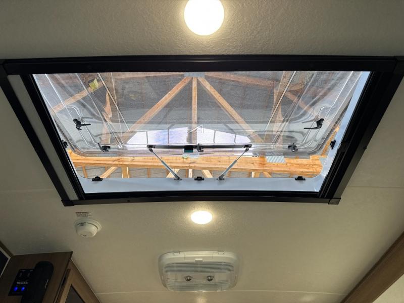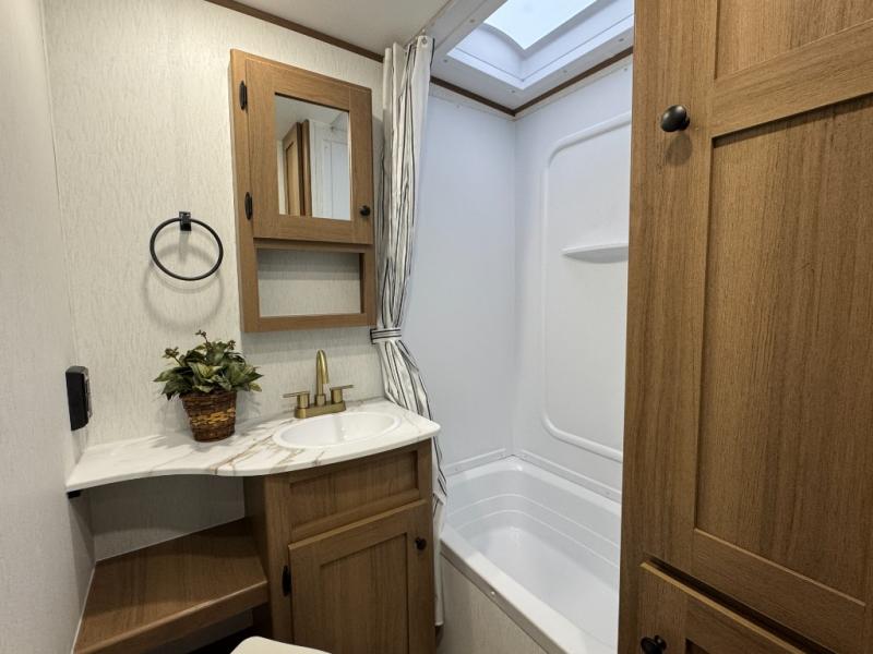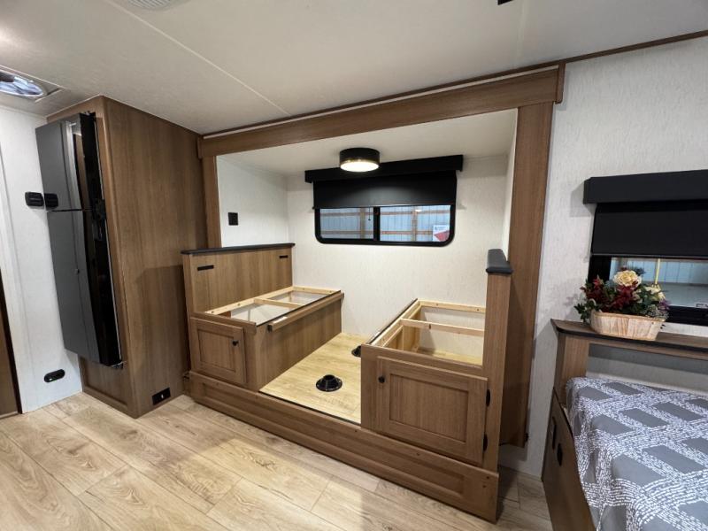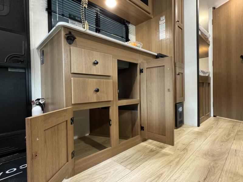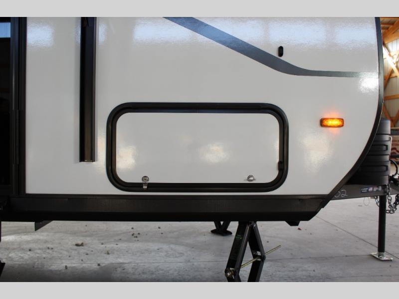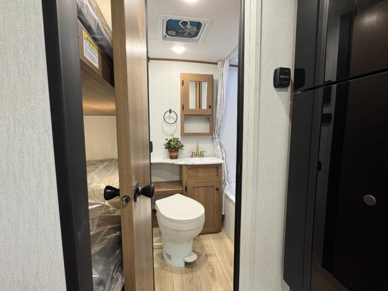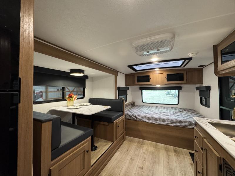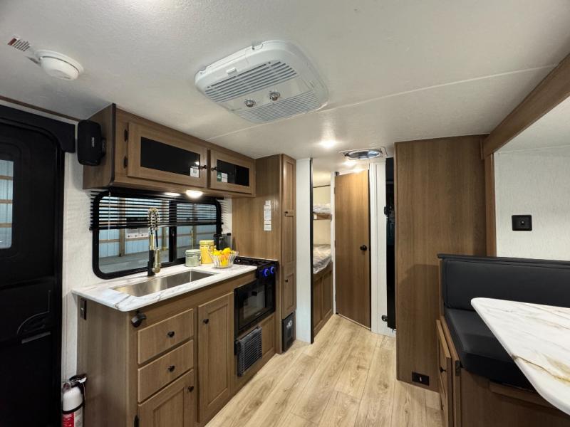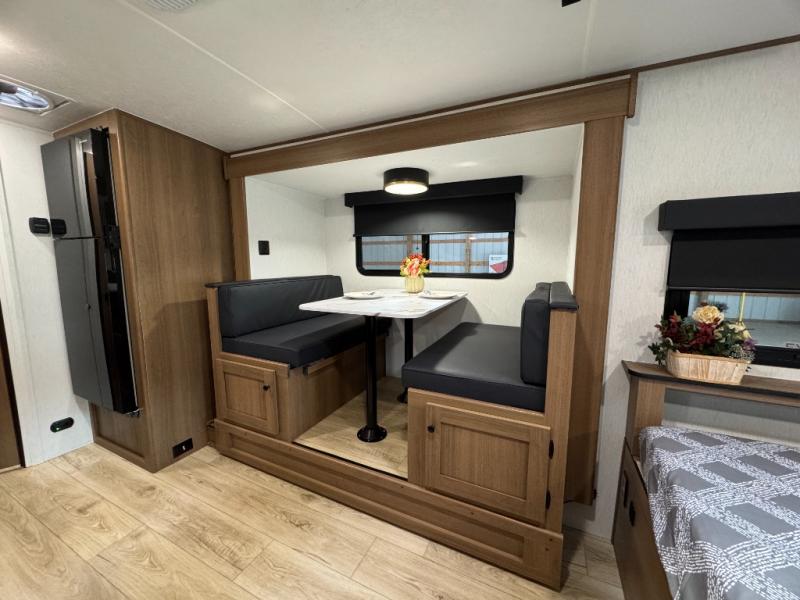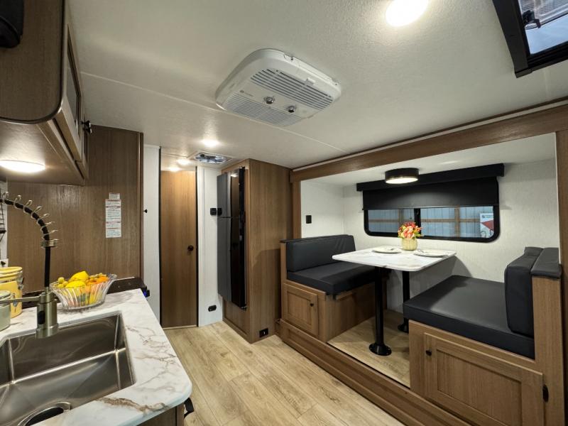 You will have more interior space with a booth dinette slide in this travel trailer! The chef will love cooking indoors with the two burner cooktop, microwave, and 10 cu. ft. 12V refrigerator, as well as outdoors with the exterior camp kitchen. Start each morning feeling clean and refreshed after sleeping on the front queen bed with a headboard and showering in the tub/shower inside the rear corner bathroom, plus the bathroom has a wardrobe to keep your towels close. The kids will love sleeping on the rear corner set of 30" x 74" bunk beds too!