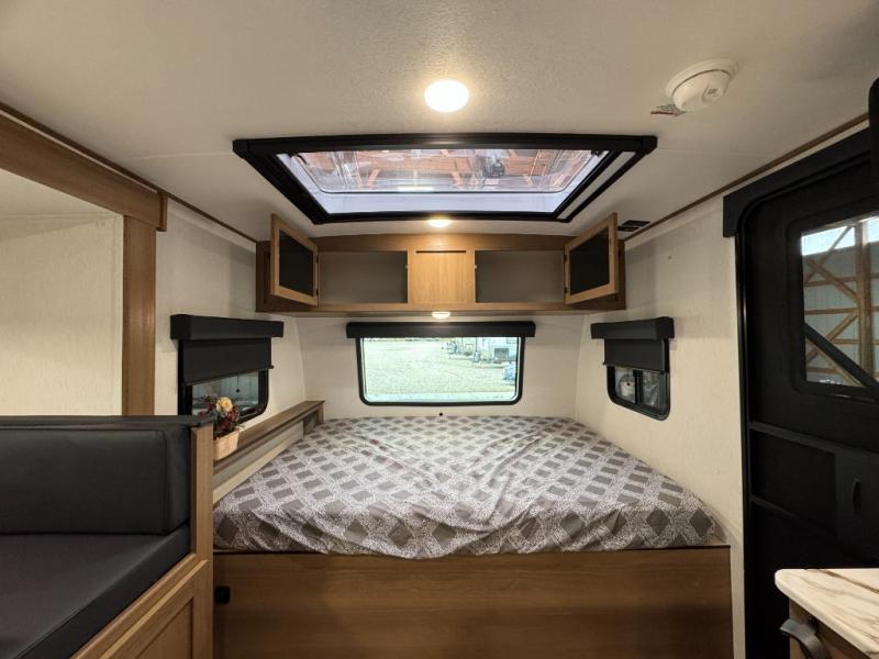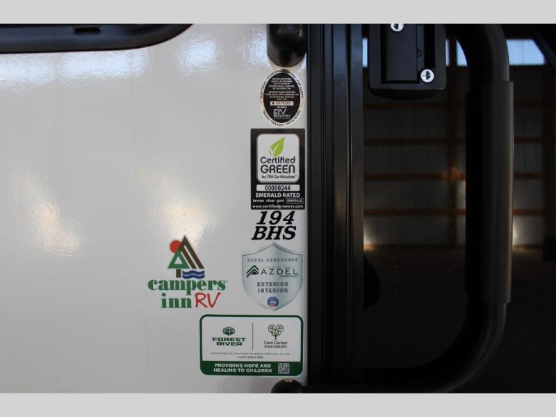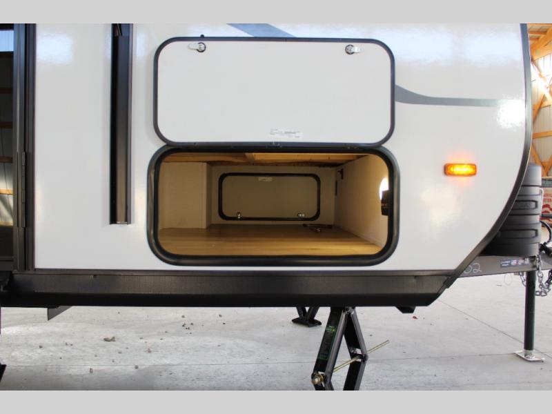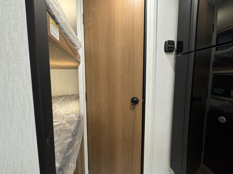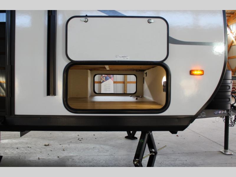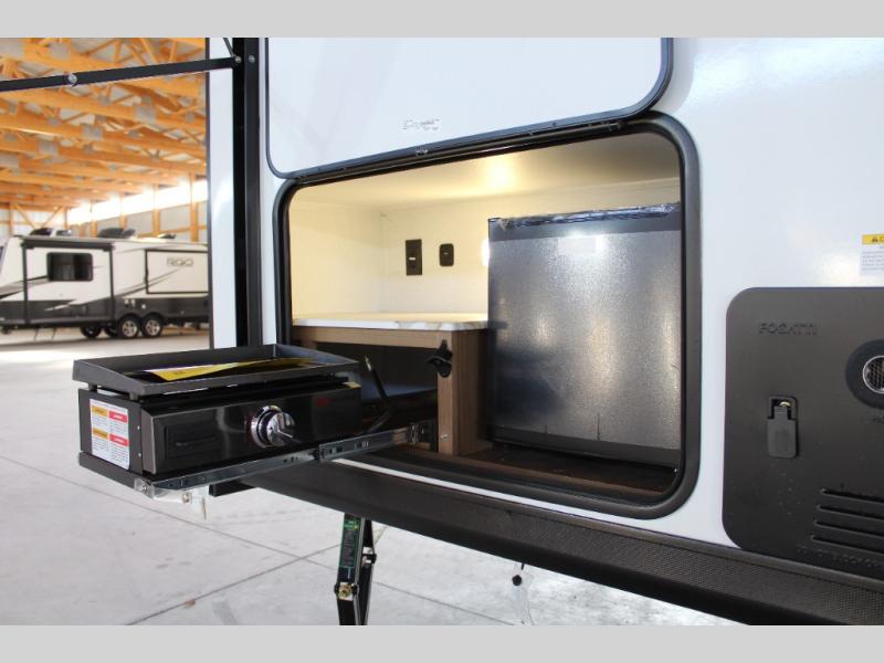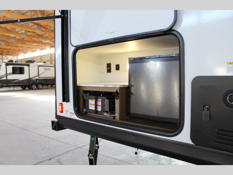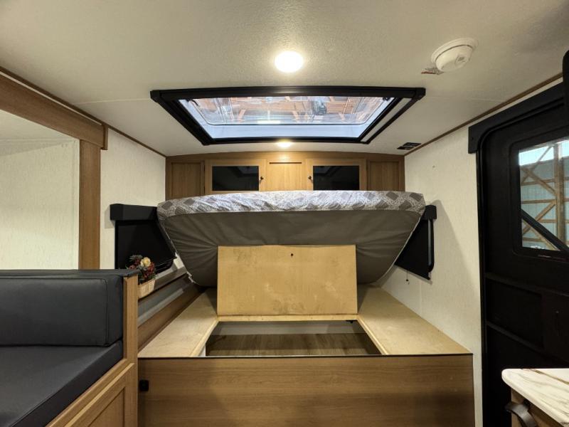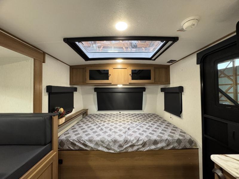 You will have more interior space with a booth dinette slide in this travel trailer! The chef will love cooking indoors with the two burner cooktop, microwave, and 10 cu. ft. 12V refrigerator, as well as outdoors with the exterior camp kitchen. Start each morning feeling clean and refreshed after sleeping on the front queen bed with a headboard and showering in the tub/shower inside the rear corner bathroom, plus the bathroom has a wardrobe to keep your towels close. The kids will love sleeping on the rear corner set of 30" x 74" bunk beds too!