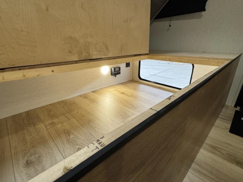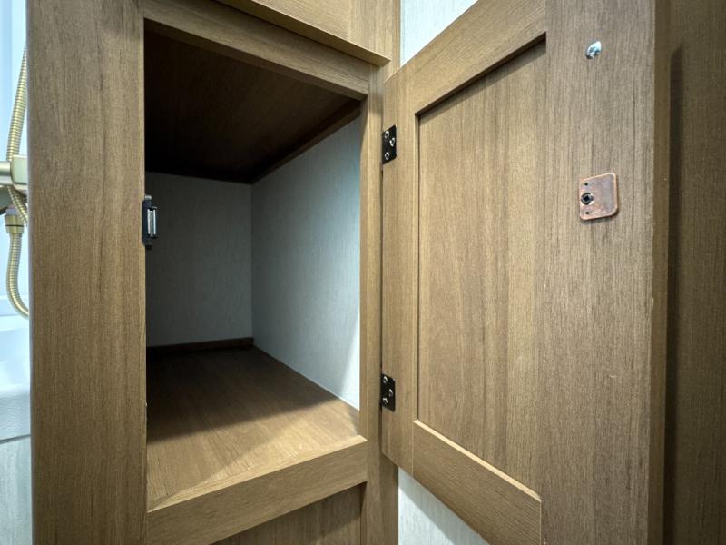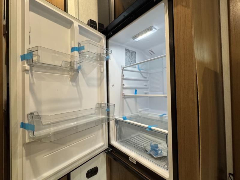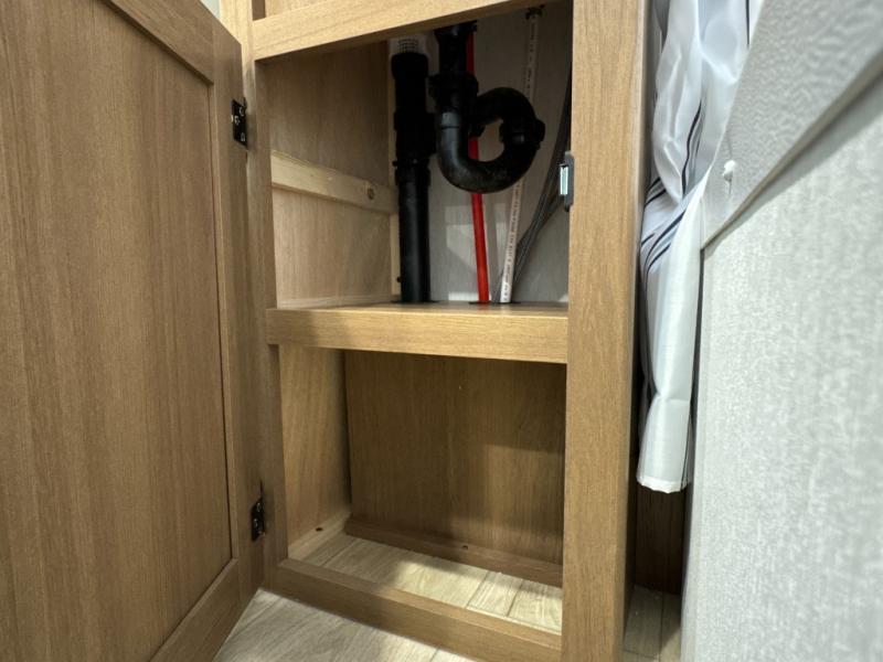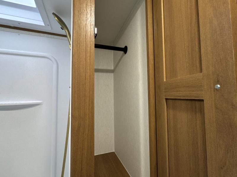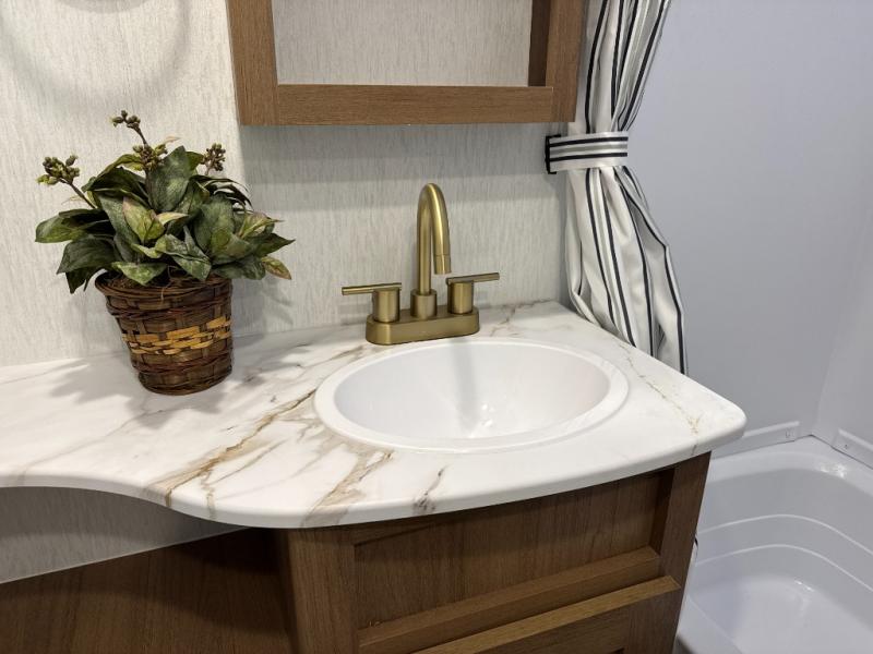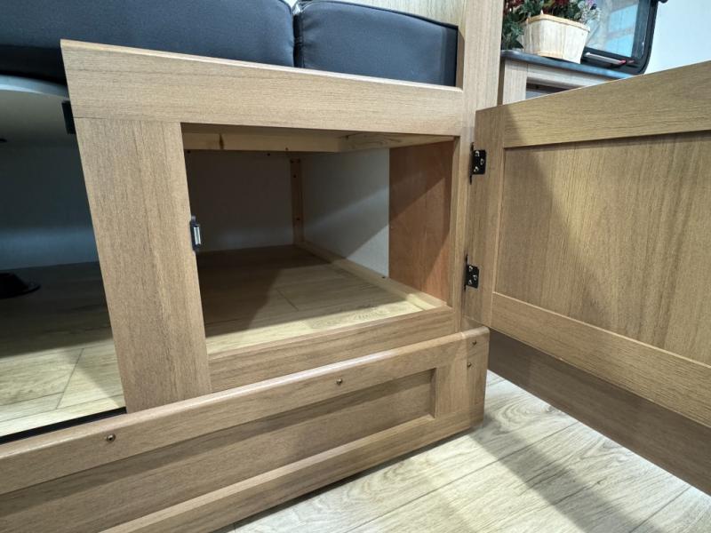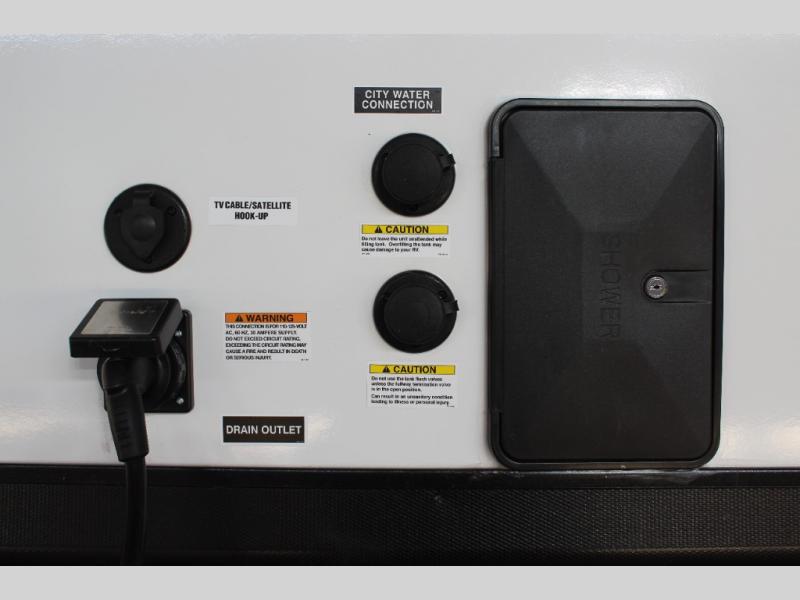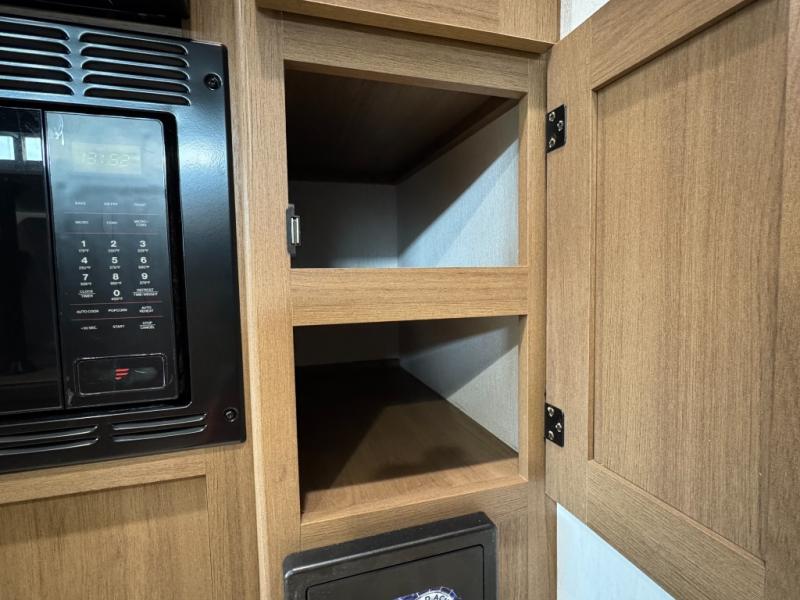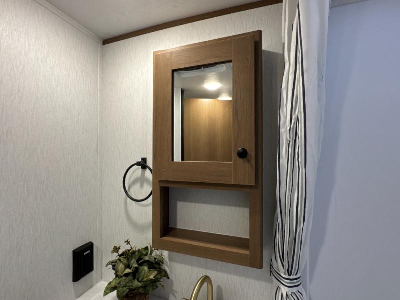 You will have more interior space with a booth dinette slide in this travel trailer! The chef will love cooking indoors with the two burner cooktop, microwave, and 10 cu. ft. 12V refrigerator, as well as outdoors with the exterior camp kitchen. Start each morning feeling clean and refreshed after sleeping on the front queen bed with a headboard and showering in the tub/shower inside the rear corner bathroom, plus the bathroom has a wardrobe to keep your towels close. The kids will love sleeping on the rear corner set of 30" x 74" bunk beds too!