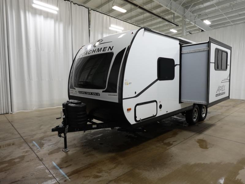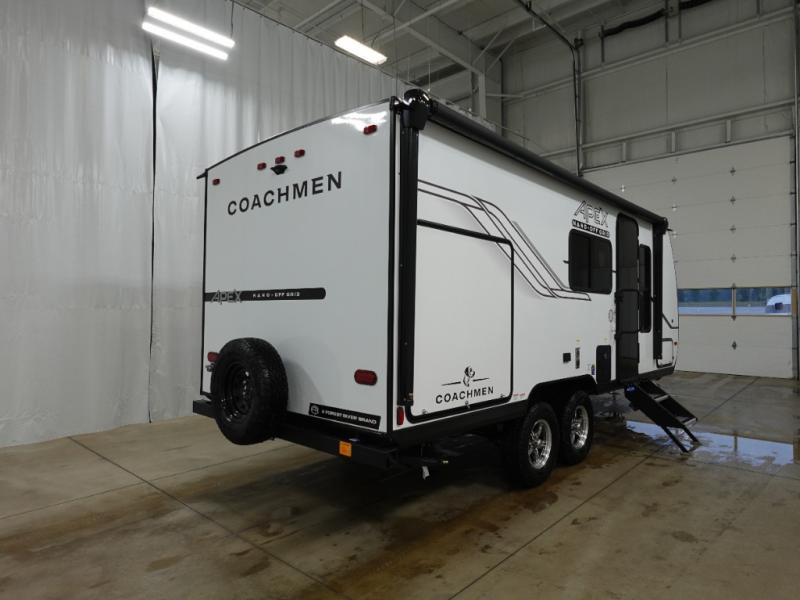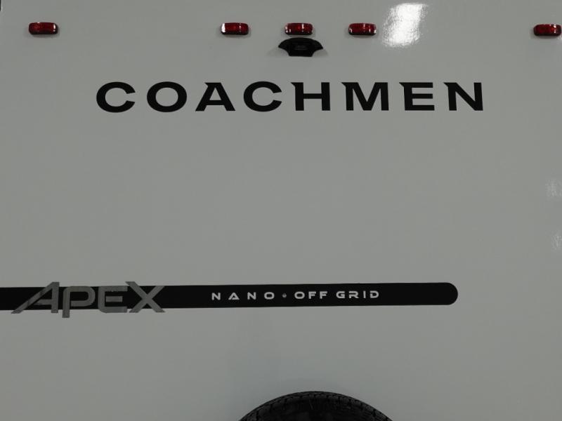 You will find comfort, convenience, and a sturdy construction with each of these Coachmen RV Apex Nano travel trailers! They are held together with an aluma-cage construction, an I-beam chassis, plus vacuum-bonded laminated dual Azdel fiberglass walls for double the protection against the elements. The 200-watt solar panel with a 30 amp control charger is included within the Off-Grid Package, along with two 20 lb. LP tanks, a high velocity power roof vent, plus 12V outlets to keep you powered up. More exterior feature include a hot/cold shower, four stabilizer jacks, a power awning with LED lighting, and magnetic baggage door catches to easily pack and unload your gear. You will love the interior of your Apex Nano with Congoleum residential flooring, one-piece seamless edge countertops, matte black hardware in the galley, and a hand-crafted wood medicine cabinet in the bath.