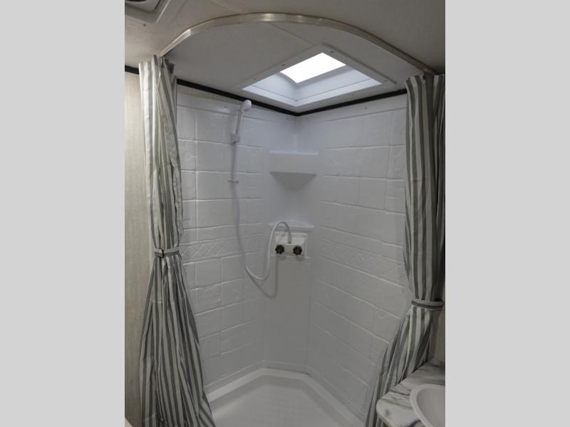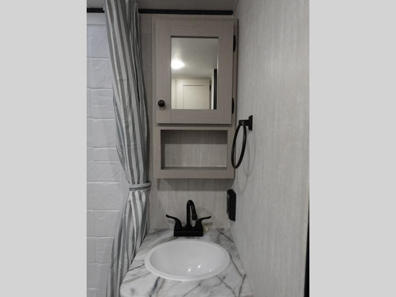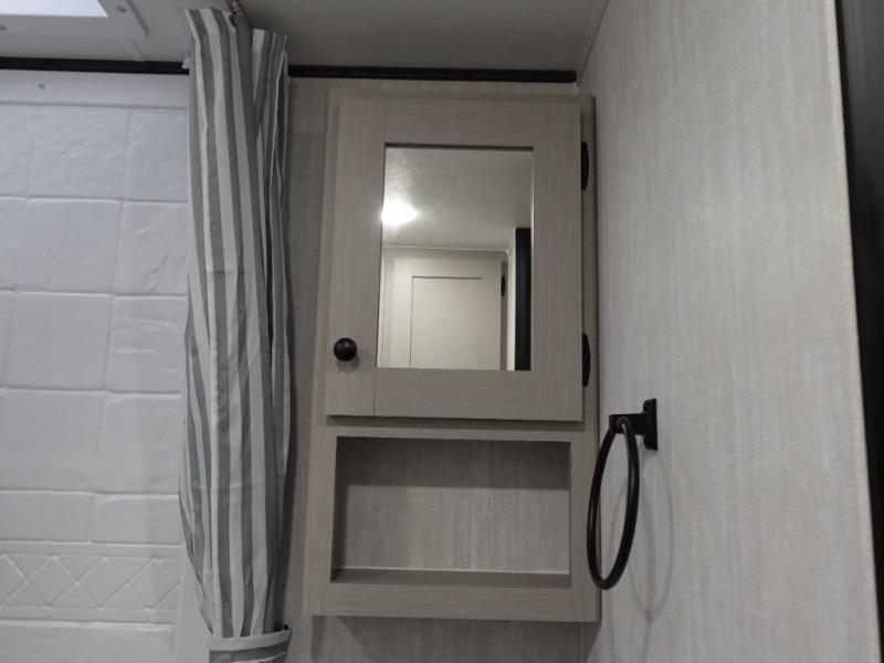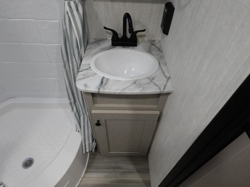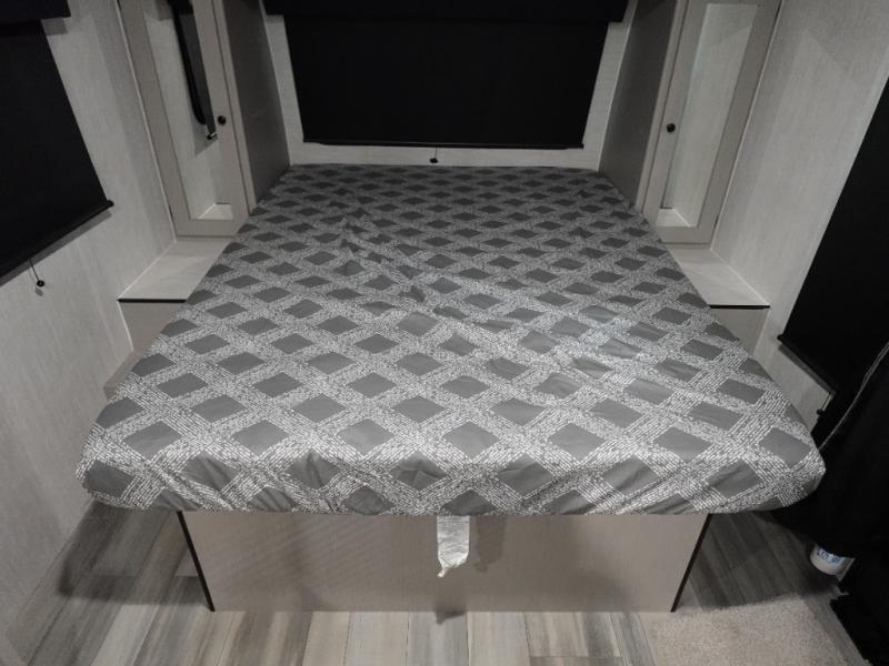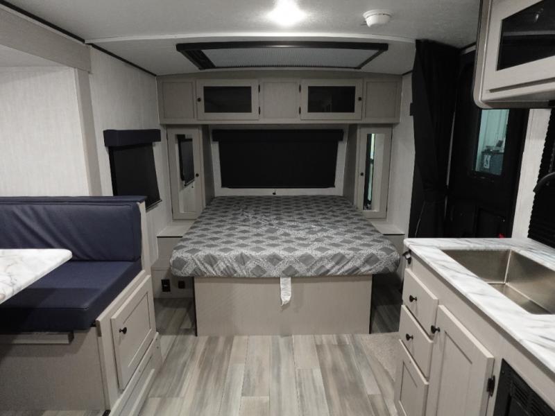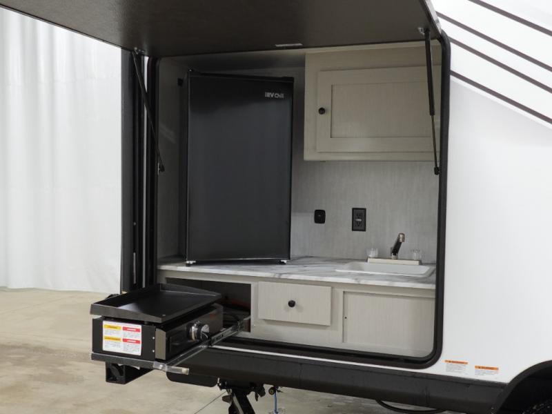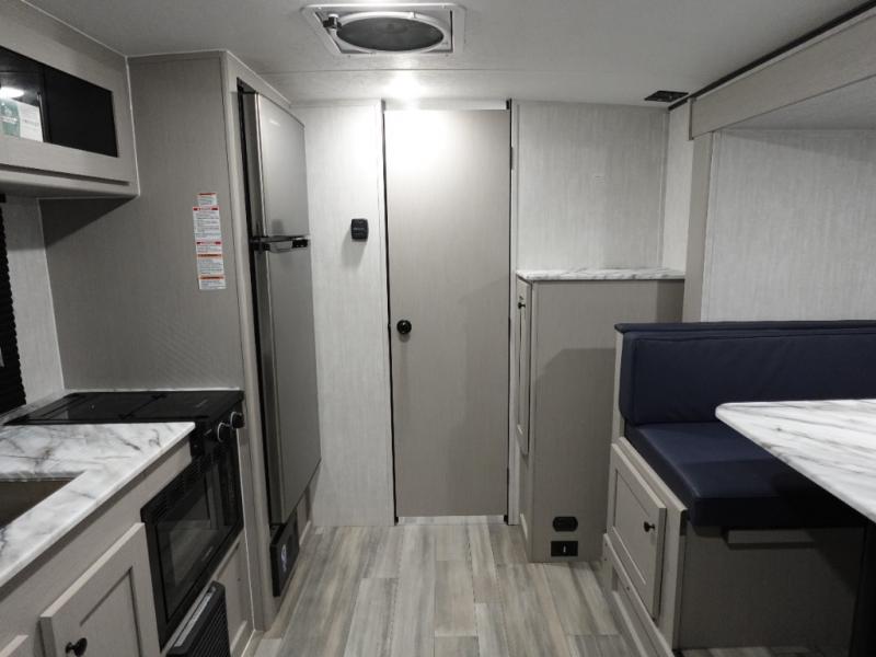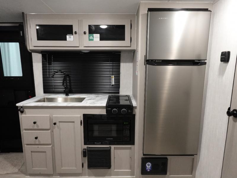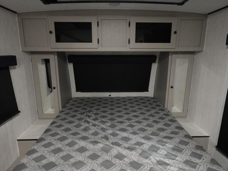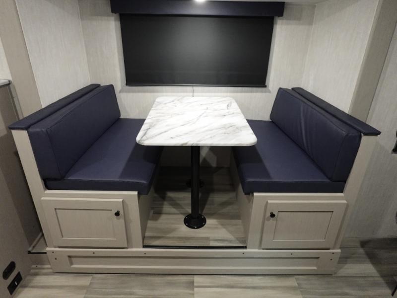 When you camp at RV parks, state parks or local campgrounds, you will love the easy setup after towing the trailer to your destination! The booth dinette slide and the power awning can quickly be set up so you can relax and unwind with your favorite person or people. You will have the choice of cooking inside with full amenities or outdoors on the outside kitchen, and inside you will have a pantry to store all your dry goods and a microwave to heat up items. The rear bathroom includes a wardrobe and allows you privacy when inside, and the front walk-around queen-size bed allows you to sleep comfortably after hiking, walking or fishing. And you will find more storage throughout for your clothing, plates, games and such, plus outside in the pass-through compartment.