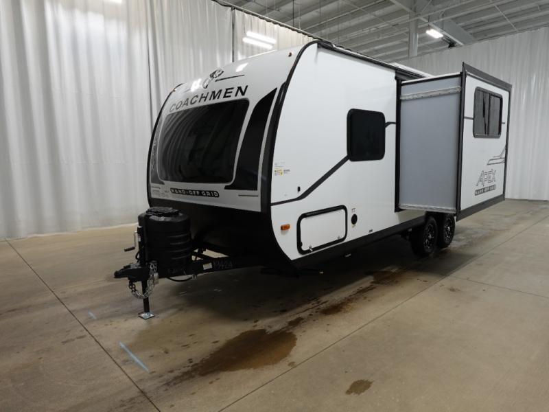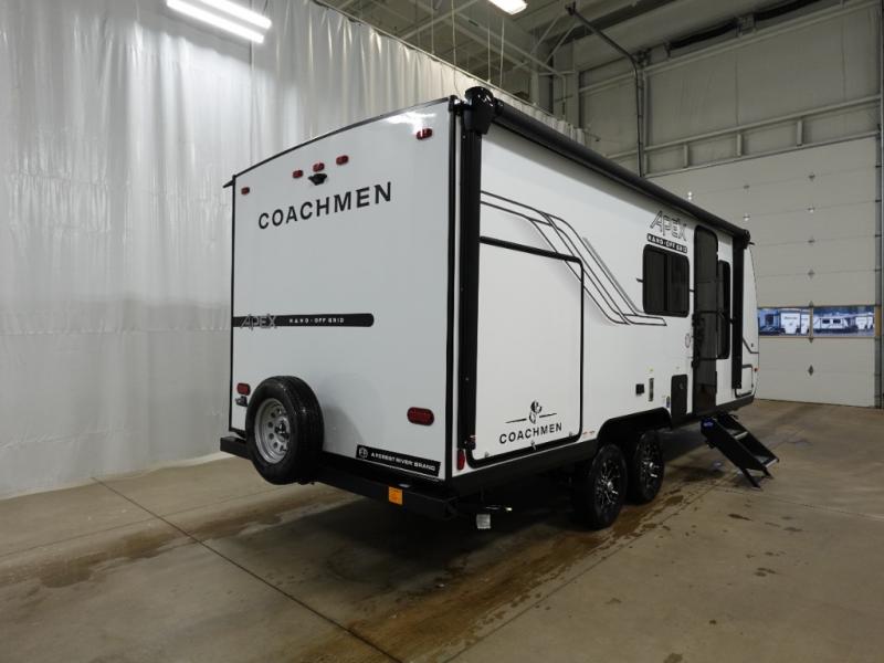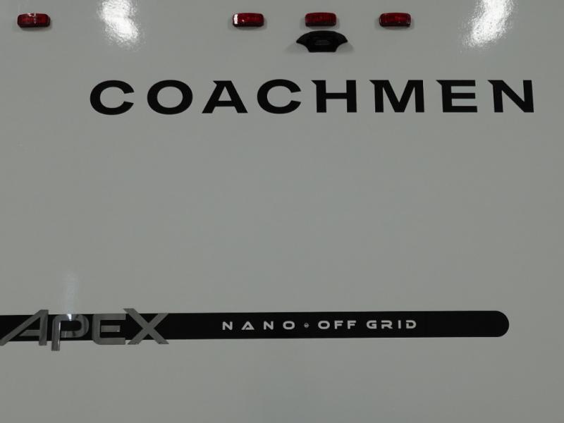 You will find comfort, convenience, and a sturdy construction with each of these Coachmen RV Apex Nano travel trailers! They are held together with an aluma-cage construction, an I-beam chassis, plus vacuum-bonded laminated dual Azdel fiberglass walls for double the protection against the elements. The 200-watt solar panel with a 30 amp control charger is included within the Off-Grid Package, along with two 20 lb. LP tanks, a high velocity power roof vent, plus 12V outlets to keep you powered up. More exterior feature include a hot/cold shower, four stabilizer jacks, a power awning with LED lighting, and magnetic baggage door catches to easily pack and unload your gear. You will love the interior of your Apex Nano with Congoleum residential flooring, one-piece seamless edge countertops, matte black hardware in the galley, and a hand-crafted wood medicine cabinet in the bath.