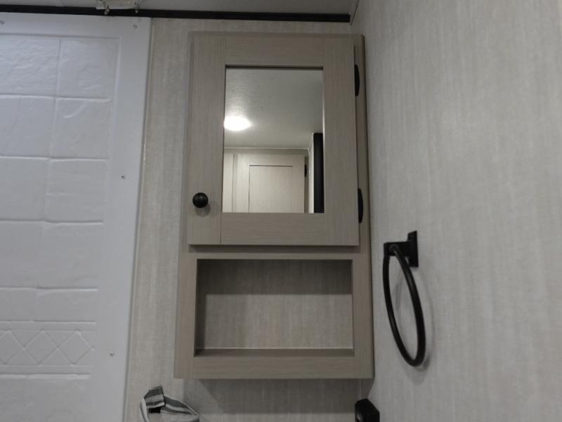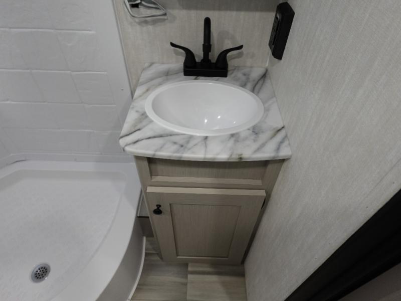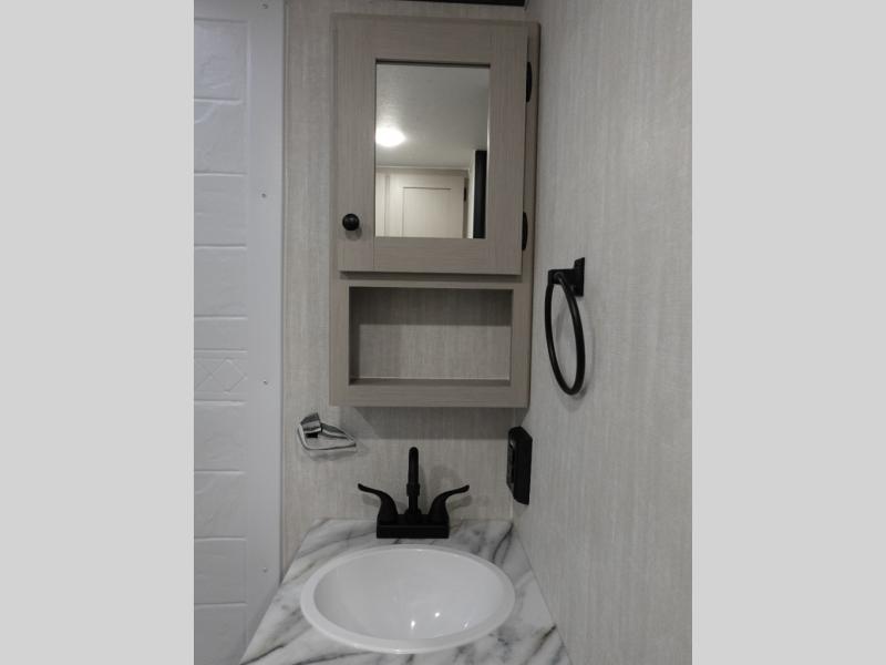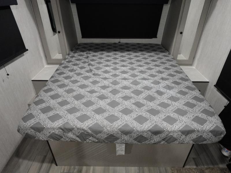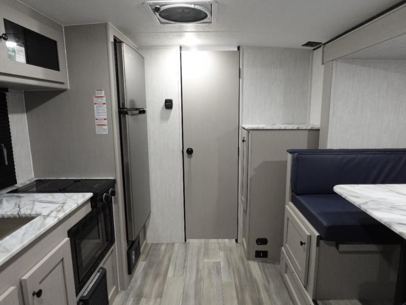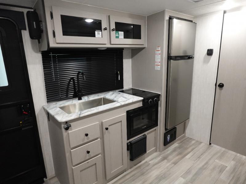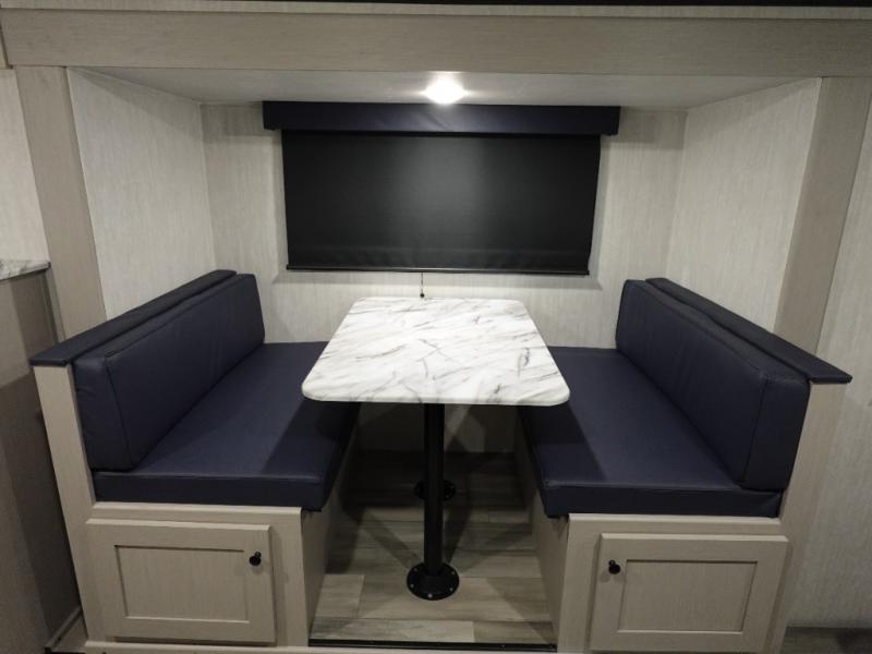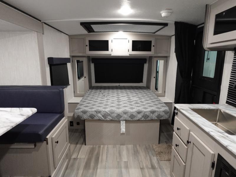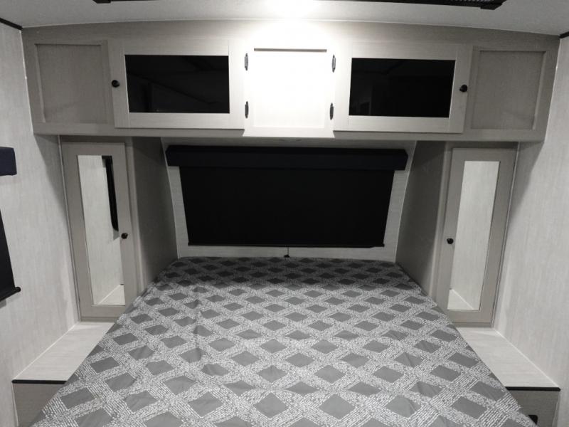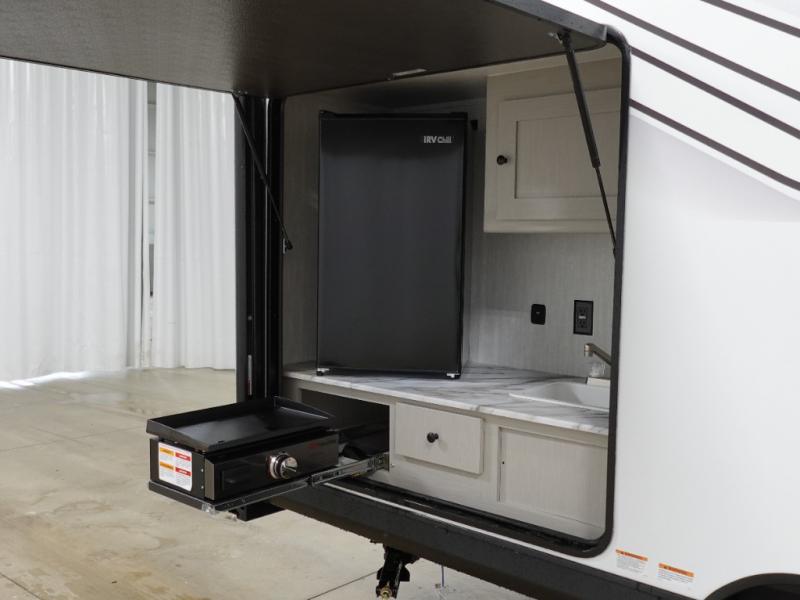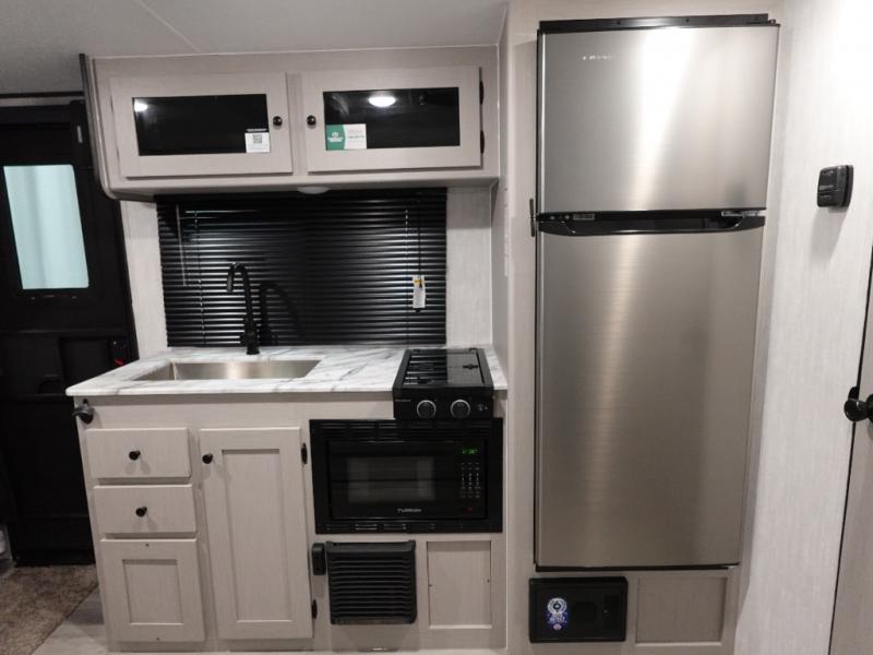 When you camp at RV parks, state parks or local campgrounds, you will love the easy setup after towing the trailer to your destination! The booth dinette slide and the power awning can quickly be set up so you can relax and unwind with your favorite person or people. You will have the choice of cooking inside with full amenities or outdoors on the outside kitchen, and inside you will have a pantry to store all your dry goods and a microwave to heat up items. The rear bathroom includes a wardrobe and allows you privacy when inside, and the front walk-around queen-size bed allows you to sleep comfortably after hiking, walking or fishing. And you will find more storage throughout for your clothing, plates, games and such, plus outside in the pass-through compartment.