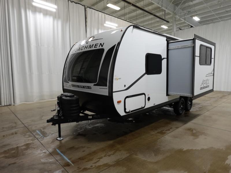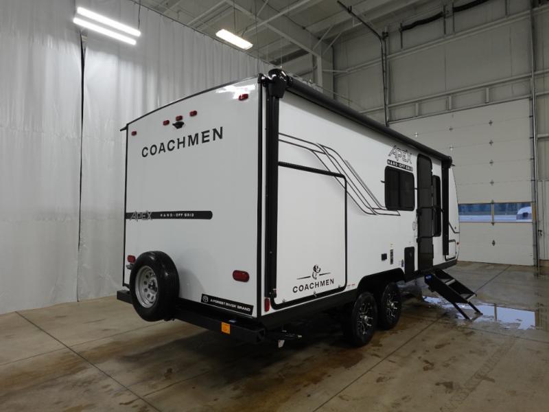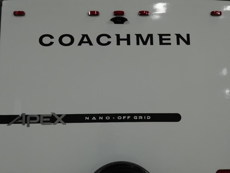 You will find comfort, convenience, and a sturdy construction with each of these Coachmen RV Apex Nano travel trailers! They are held together with an aluma-cage construction, an I-beam chassis, plus vacuum-bonded laminated dual Azdel fiberglass walls for double the protection against the elements. The 200-watt solar panel with a 30 amp control charger is included within the Off-Grid Package, along with two 20 lb. LP tanks, a high velocity power roof vent, plus 12V outlets to keep you powered up. More exterior feature include a hot/cold shower, four stabilizer jacks, a power awning with LED lighting, and magnetic baggage door catches to easily pack and unload your gear. You will love the interior of your Apex Nano with Congoleum residential flooring, one-piece seamless edge countertops, matte black hardware in the galley, and a hand-crafted wood medicine cabinet in the bath.