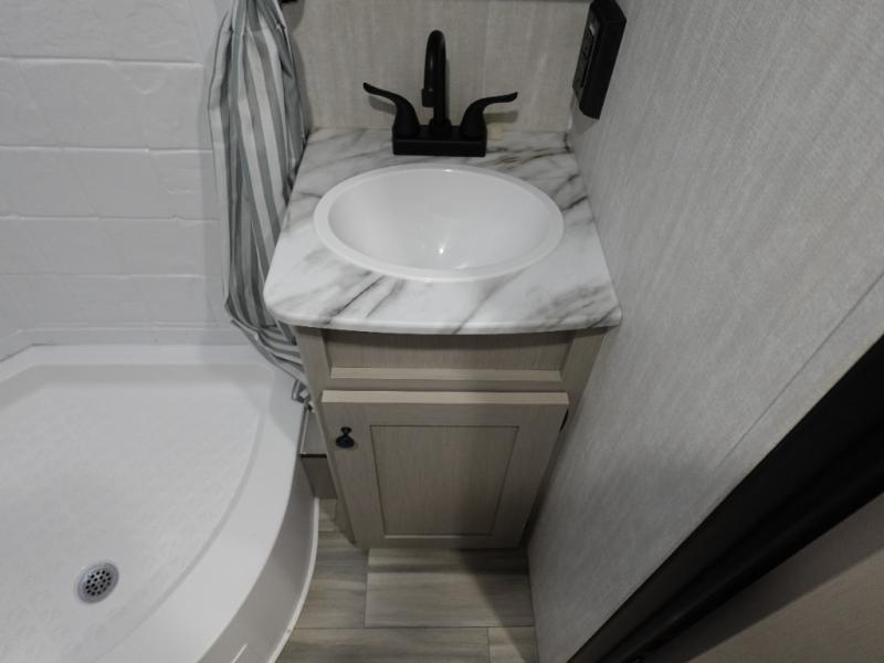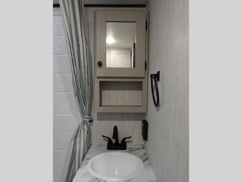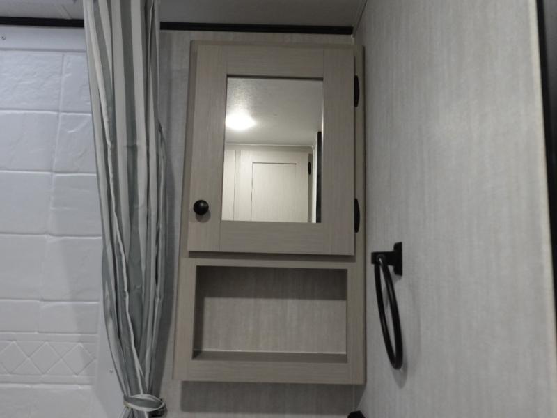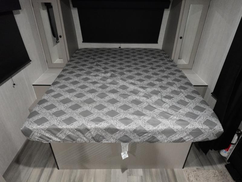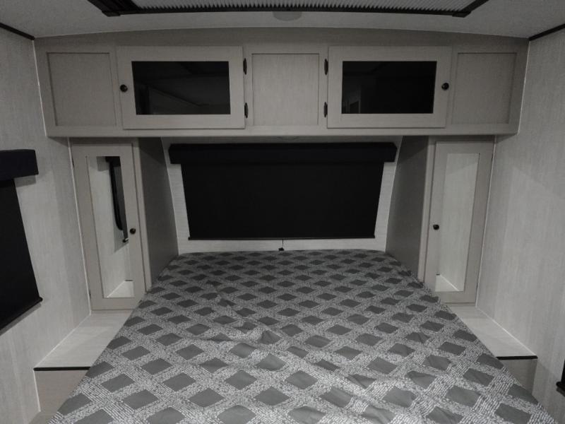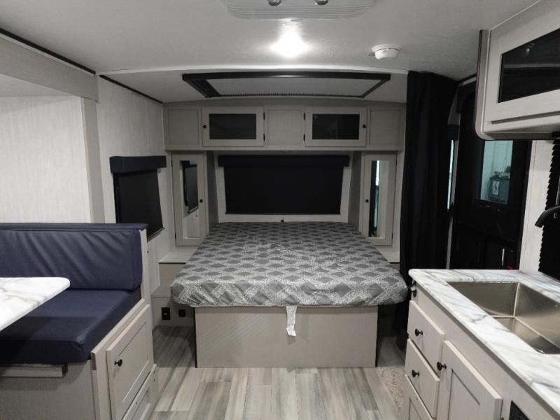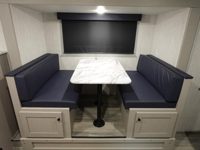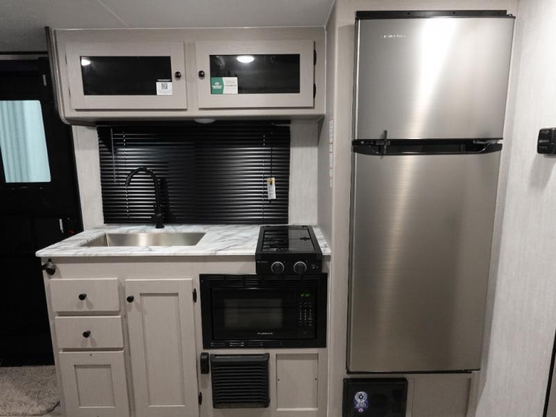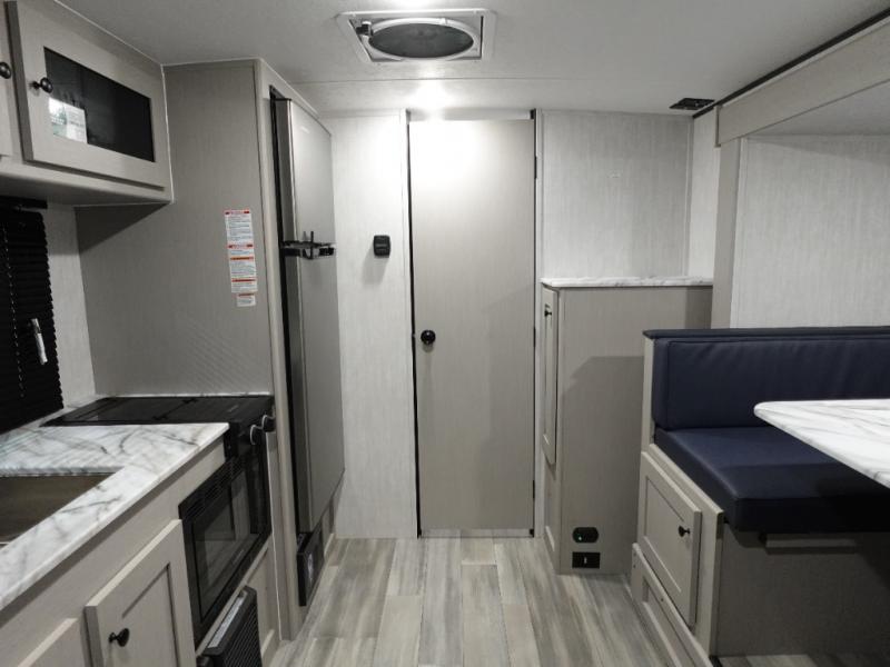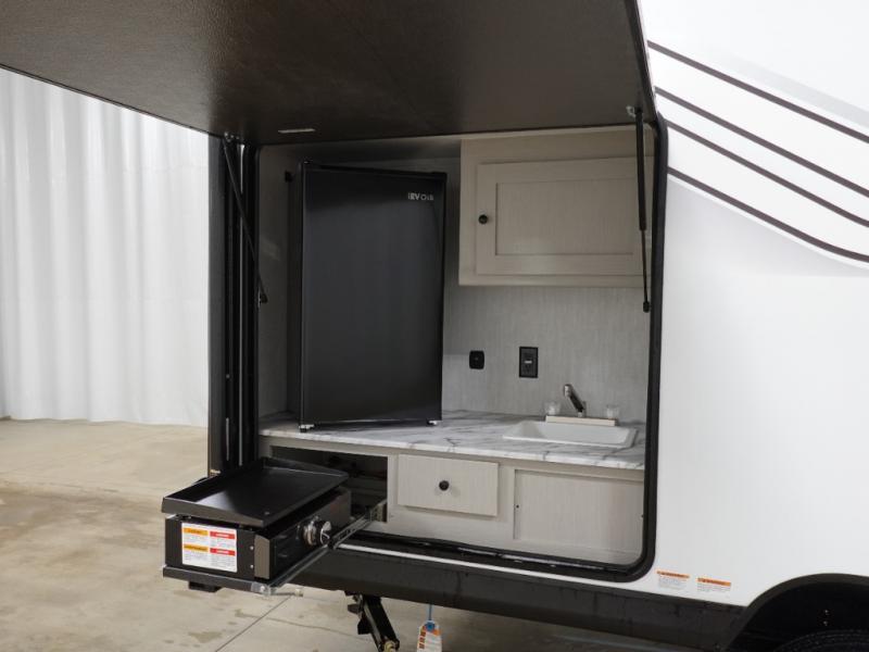 When you camp at RV parks, state parks or local campgrounds, you will love the easy setup after towing the trailer to your destination! The booth dinette slide and the power awning can quickly be set up so you can relax and unwind with your favorite person or people. You will have the choice of cooking inside with full amenities or outdoors on the outside kitchen, and inside you will have a pantry to store all your dry goods and a microwave to heat up items. The rear bathroom includes a wardrobe and allows you privacy when inside, and the front walk-around queen-size bed, allows you to sleep comfortably after hiking, walking or fishing. And you will find more storage throughout for your clothing, plates, games and such, plus outside in the pass-through compartment.