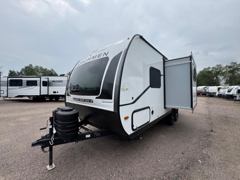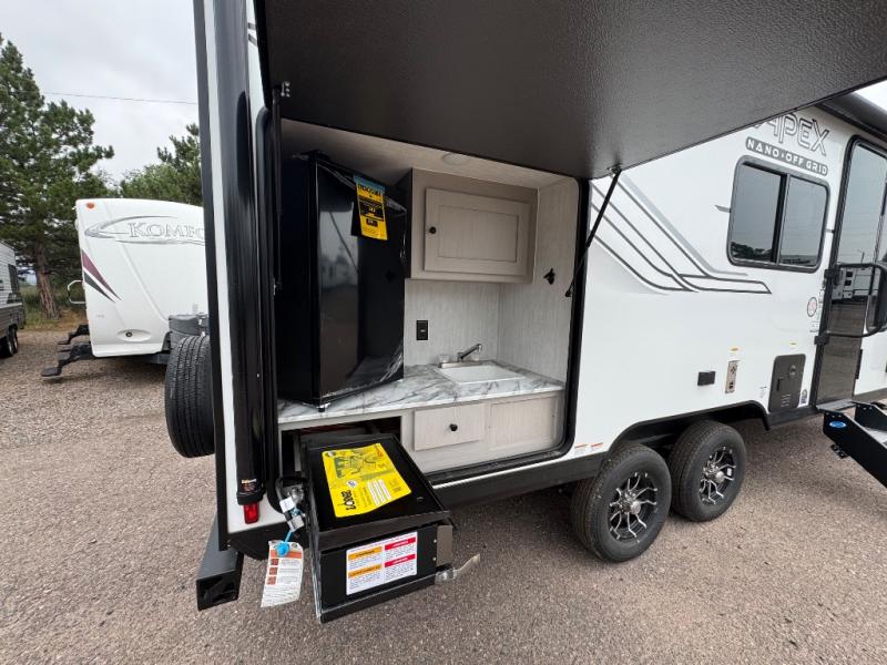 You will find comfort, convenience, and a sturdy construction with each of these Coachmen RV Apex Nano travel trailers! They are held together with an aluma-cage construction, an I-beam chassis, plus vacuum-bonded laminated dual Azdel fiberglass walls for double the protection against the elements. The 200-watt solar panel with a 30 amp control charger is included within the Off-Grid Package, along with two 20 lb. LP tanks, a high velocity power roof vent, plus 12V outlets to keep you powered up. More exterior feature include a hot/cold shower, four stabilizer jacks, a power awning with LED lighting, and magnetic baggage door catches to easily pack and unload your gear. You will love the interior of your Apex Nano with Congoleum residential flooring, one-piece seamless edge countertops, matte black hardware in the galley, and a hand-crafted wood medicine cabinet in the bath.