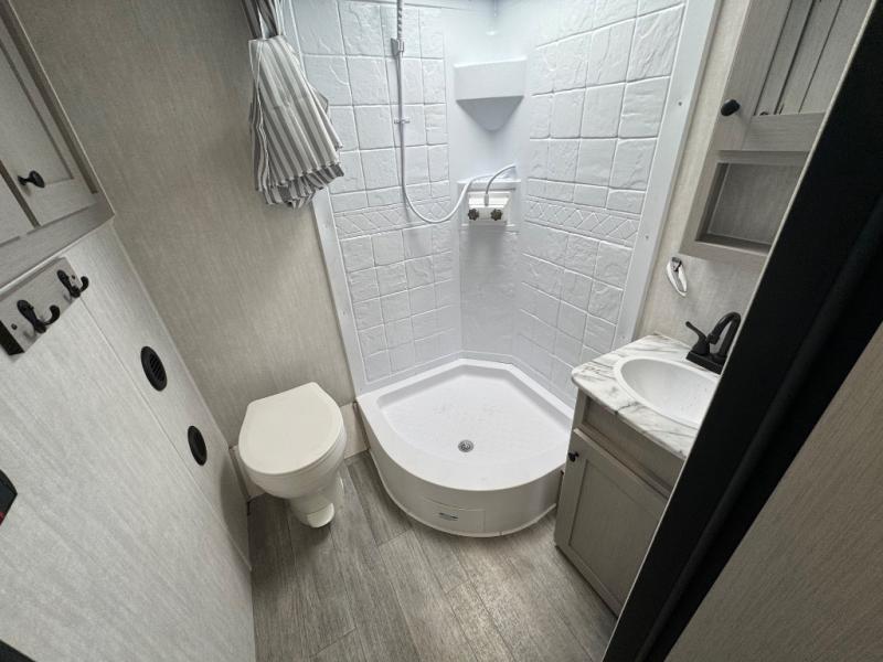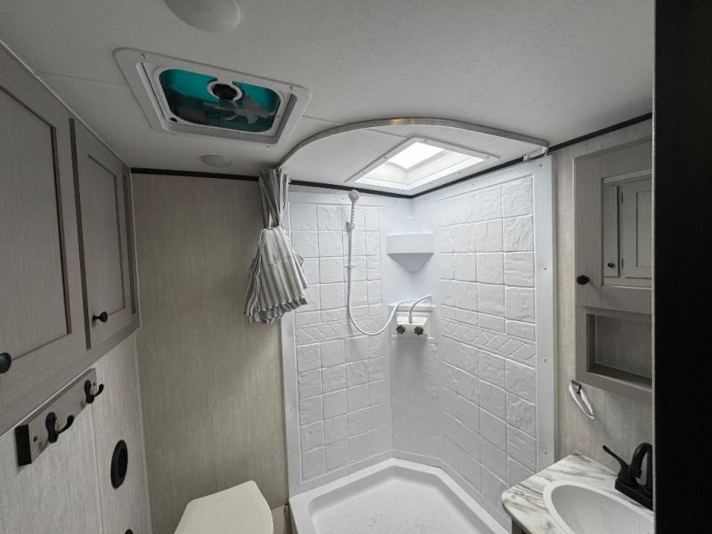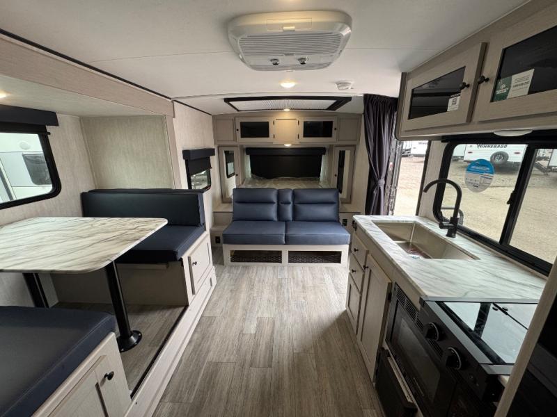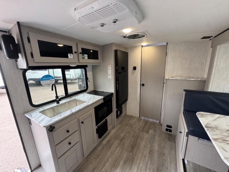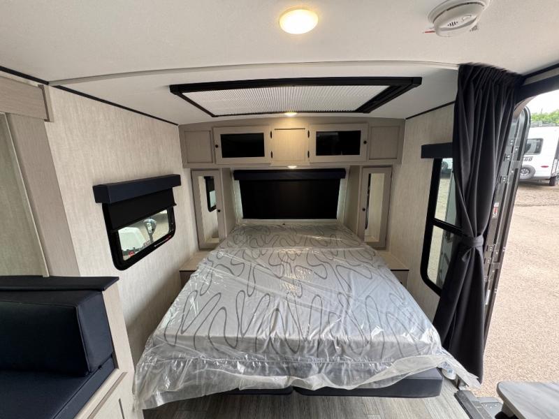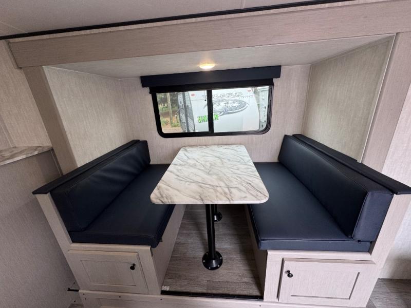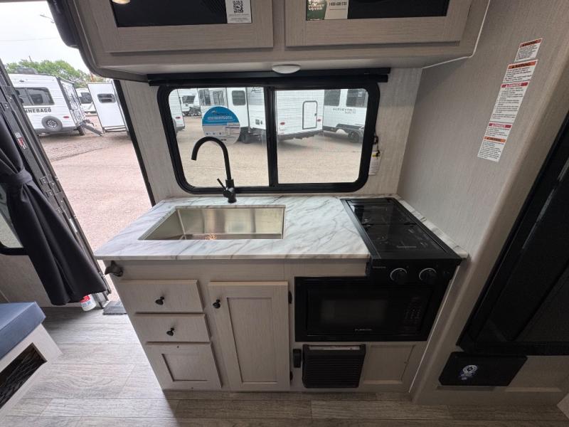 When you camp at RV parks, state parks or local campgrounds, you will love the easy setup after towing the trailer to your destination! The booth dinette slide and the power awning can quickly be set up so you can relax and unwind with your favorite person or people. You will have the choice of cooking inside with full amenities or outdoors on the outside kitchen, and inside you will have a pantry to store all your dry goods and a microwave to heat up items. The rear bathroom includes a wardrobe and allows you privacy when inside, and the front walk-around queen-size bed or the Murphy bed option, allows you to sleep comfortably after hiking, walking or fishing. And you will find more storage throughout for your clothing, plates, games and such, plus outside in the pass-through compartment.