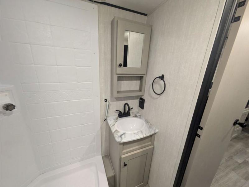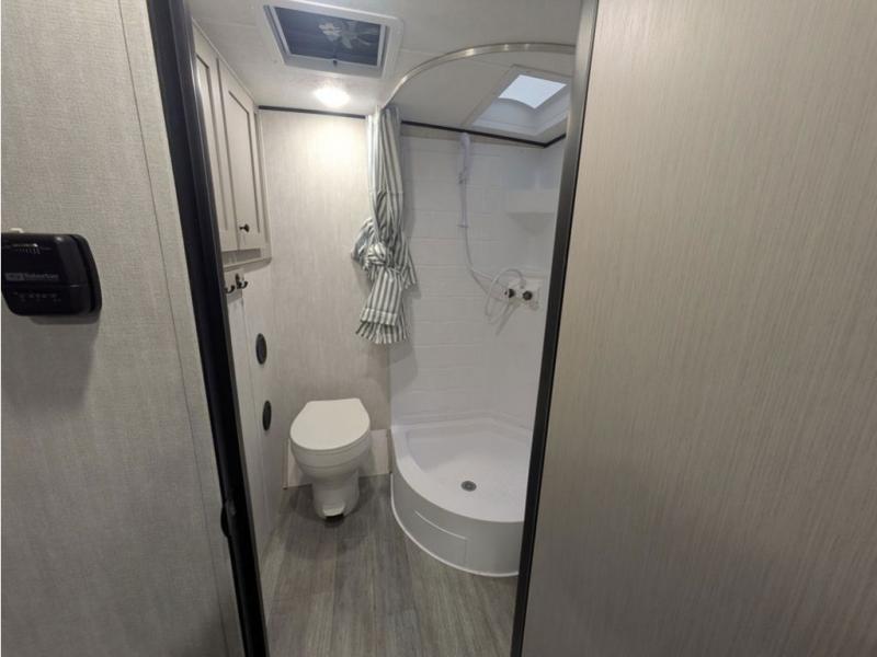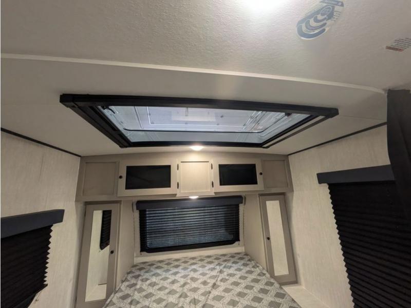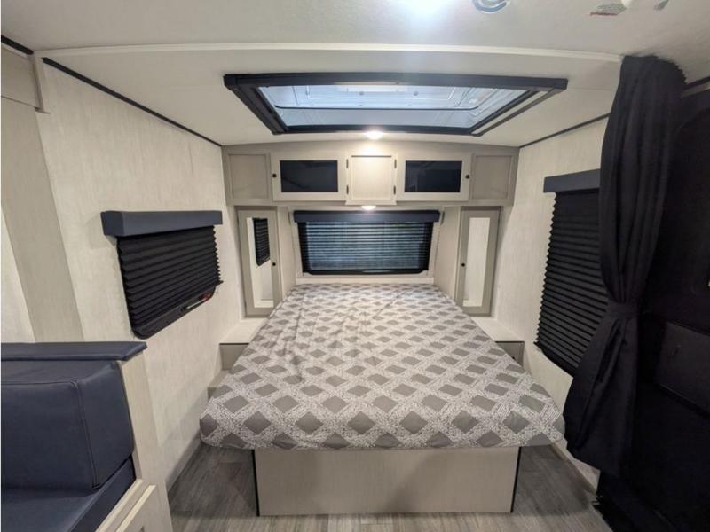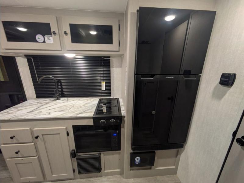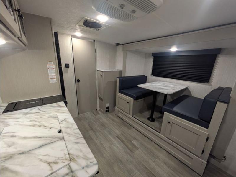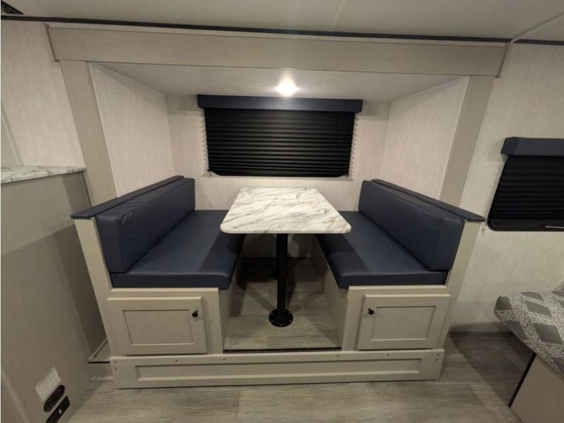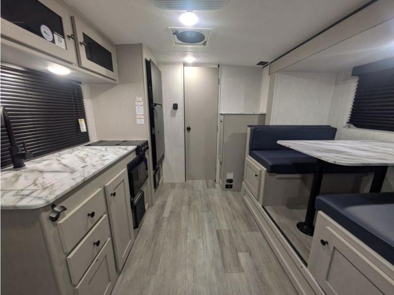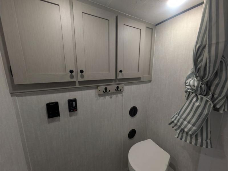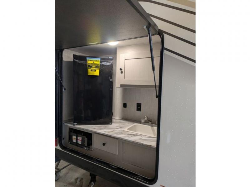 When you camp at RV parks, state parks or local campgrounds, you will love the easy setup after towing the trailer to your destination! The booth dinette slide and the power awning with LED lighting can quickly be set up so you can relax and unwind with your favorite person or people. You will have the choice of cooking inside with full amenities or outdoors on the outside kitchen, inside you will have a pantry to store all your dry goods and an air fryer microwave to heat up items. The rear bathroom includes a wardrobe and allows you privacy when inside, and the front walk-around queen-size bed or the Murphy bed option, allows you to sleep comfortably after hiking, walking or fishing. There are wardrobes at either side to allow for storing your clothes and essentials. And you will find more storage throughout for your clothing, plates, games and such, plus outside in the pass-through compartment.