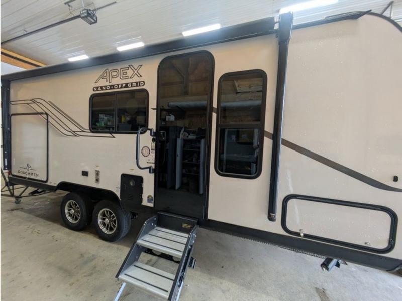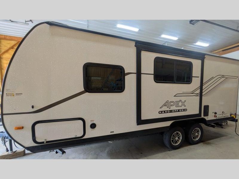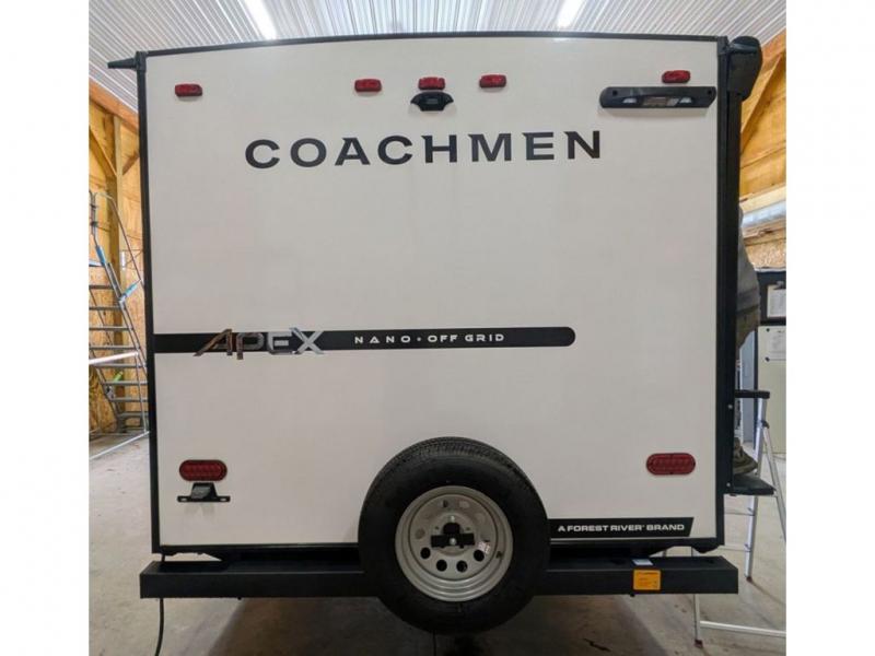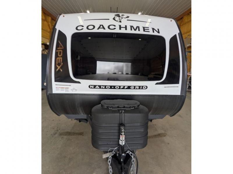 You will find comfort, convenience, and a sturdy construction with each of these Coachmen RV Apex Nano travel trailers! They are held together with an aluma-cage construction, an I-beam chassis, plus vacuum-bonded laminated dual Azdel fiberglass walls for double the protection against the elements. The 400-watt solar panel with a 30 amp control charger is included, along with two 20 lb. LP tanks, a high velocity power roof vent, plus 12V outlets to keep you powered up. More exterior features include a hot/cold shower, four stabilizer jacks, a power awning with LED lighting, and radius thumb latch baggage doors to easily pack and unload your gear. You will love the interior of your Apex Nano with Congoleum residential flooring, one-piece seamless edge countertops, matte black hardware in the galley, and a hand-crafted wood medicine cabinet in the bath.