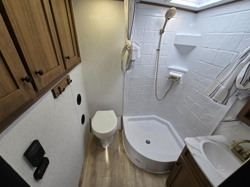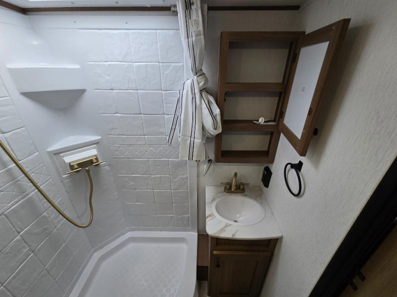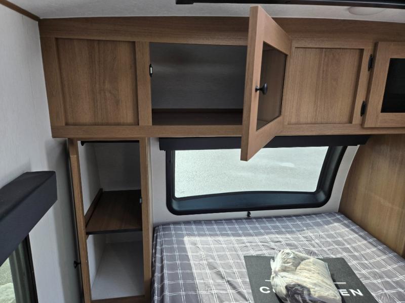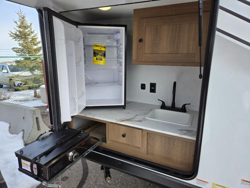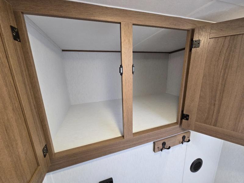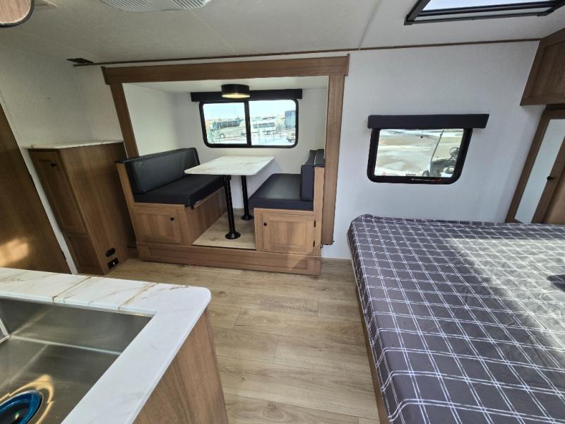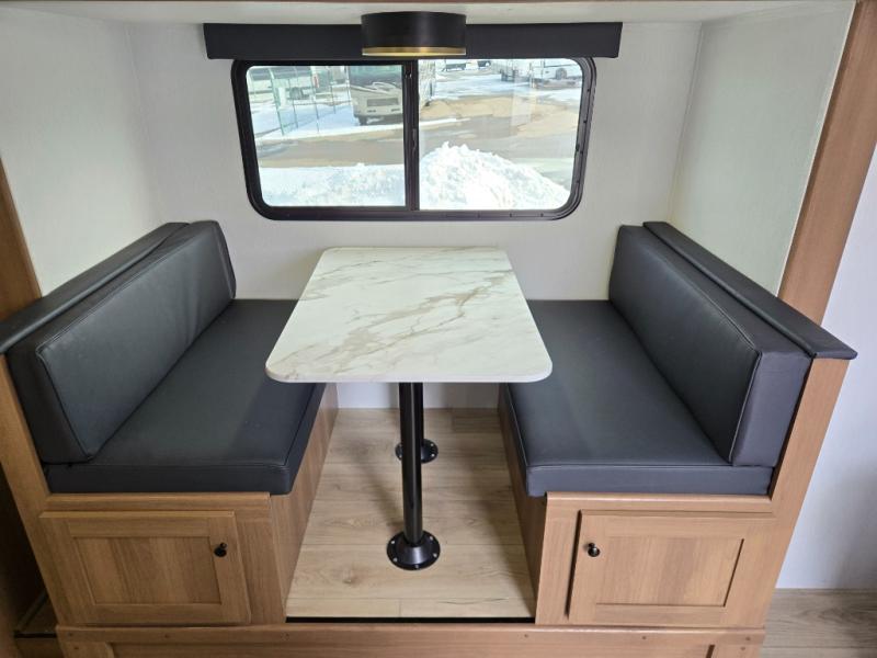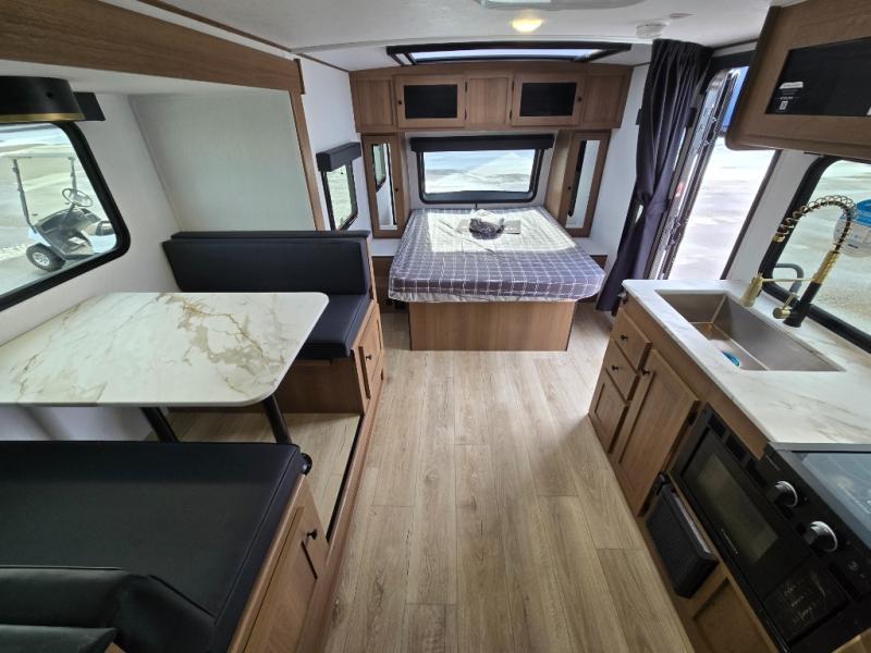When you camp at RV parks, state parks or local campgrounds, you will love the easy setup after towing the trailer to your destination! The booth dinette slide and the power awning with LED lighting can quickly be set up so you can relax and unwind with your favorite person or people. You will have the choice of cooking inside with full amenities or outdoors on the outside kitchen, inside you will have a pantry to store all your dry goods and an air fryer microwave to heat up items. The rear bathroom includes a wardrobe and allows you privacy when inside, and the front walk-around queen-size bed or the Murphy bed option, allows you to sleep comfortably after hiking, walking or fishing. There are wardrobes at either side to allow for storing your clothes and essentials. And you will find more storage throughout for your clothing, plates, games and such, plus outside in the pass-through compartment.