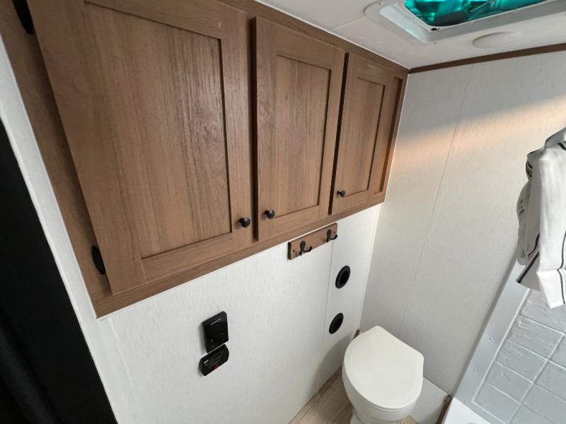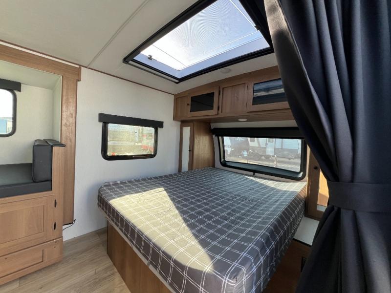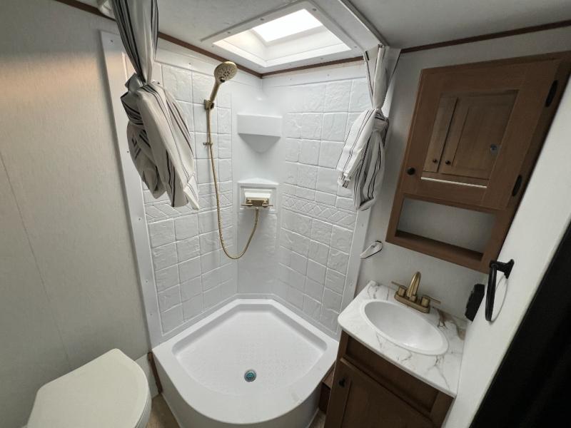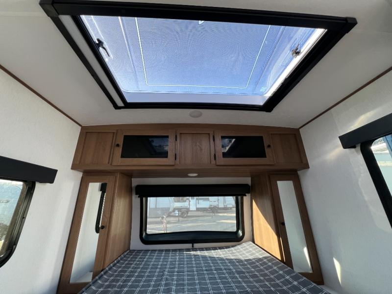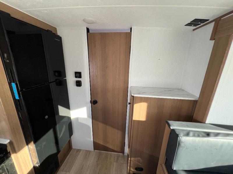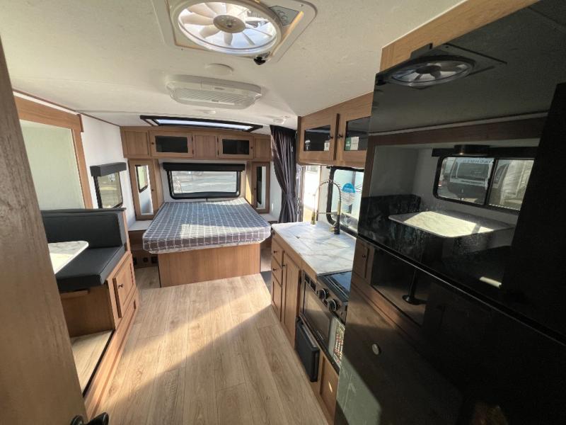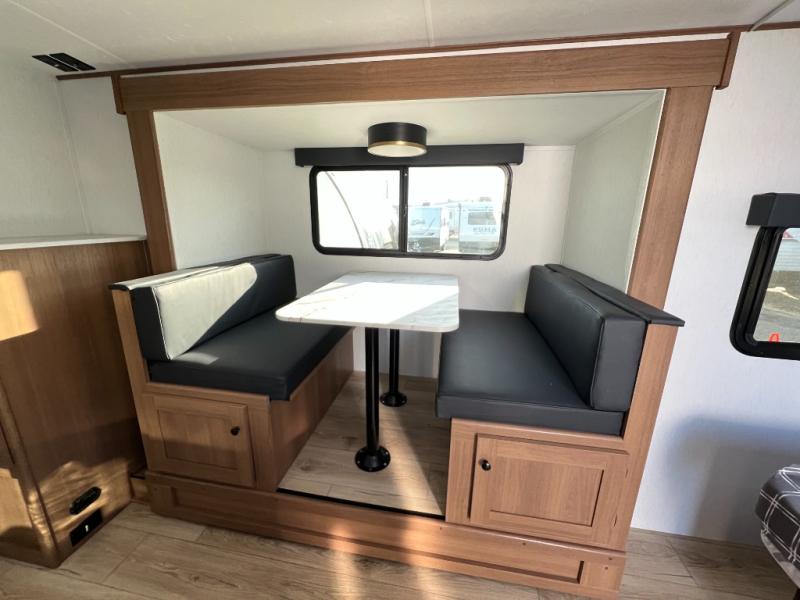 When you camp at RV parks, state parks or local campgrounds, you will love the easy setup after towing the trailer to your destination! The booth dinette slide and the power awning with LED lighting can quickly be set up so you can relax and unwind with your favorite person or people. You will have the choice of cooking inside with full amenities or outdoors on the outside kitchen, inside you will have a pantry to store all your dry goods and an air fryer microwave to heat up items. The rear bathroom includes a wardrobe and allows you privacy when inside, and the front walk-around queen-size bed or the Murphy bed option, allows you to sleep comfortably after hiking, walking or fishing. There are wardrobes at either side to allow for storing your clothes and essentials. And you will find more storage throughout for your clothing, plates, games and such, plus outside in the pass-through compartment.