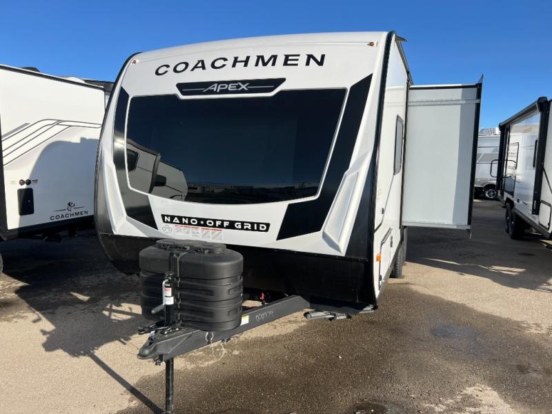 You will find comfort, convenience, and a sturdy construction with each of these Coachmen RV Apex Nano travel trailers! They are held together with an aluma-cage construction, an I-beam chassis, plus vacuum-bonded laminated dual Azdel fiberglass walls for double the protection against the elements. The 400-watt solar panel with a 30 amp control charger is included, along with two 20 lb. LP tanks, a high velocity power roof vent, plus 12V outlets to keep you powered up. More exterior features include a hot/cold shower, four stabilizer jacks, a power awning with LED lighting, and radius thumb latch baggage doors to easily pack and unload your gear. You will love the interior of your Apex Nano with Congoleum residential flooring, one-piece seamless edge countertops, matte black hardware in the galley, and a hand-crafted wood medicine cabinet in the bath.
