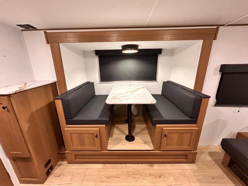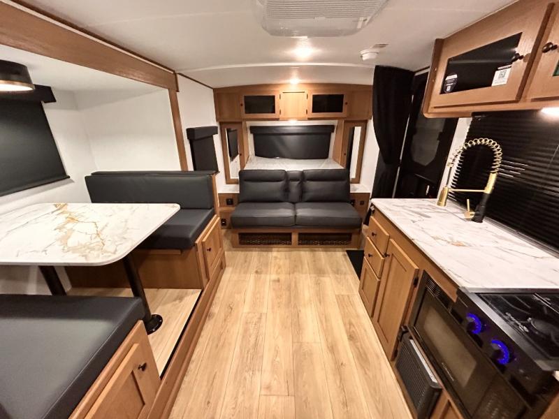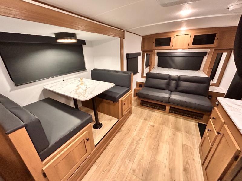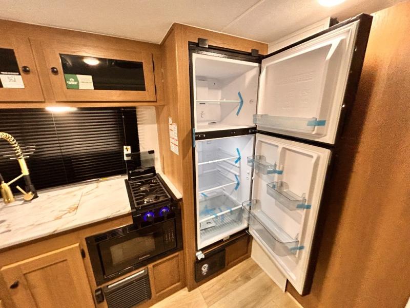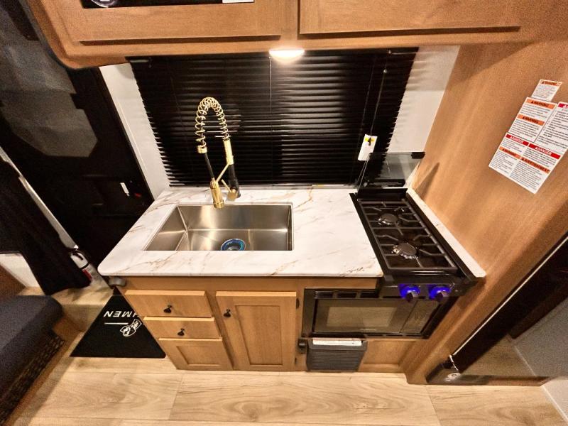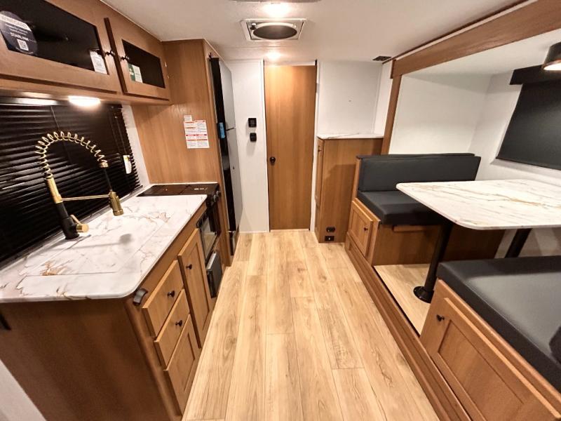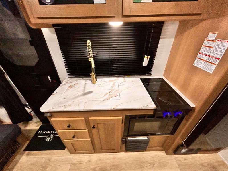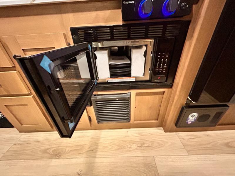 - DOOR, SOLID STEP, MAGNETIC BAGGAGE DOOR CATCH, HARD VALANCES W /ROLLER SHADES, LED INTERIOR LIGHTS, AIR FRYER MICROWAVE, 2-BURNER COOK-TOP, 10 CU FT 12V REFER, SINGLE SINK W/ COVER, ACCESS DOORS UNDER DINETTE, FRAME RECEIVE PREP (DBL AXLE