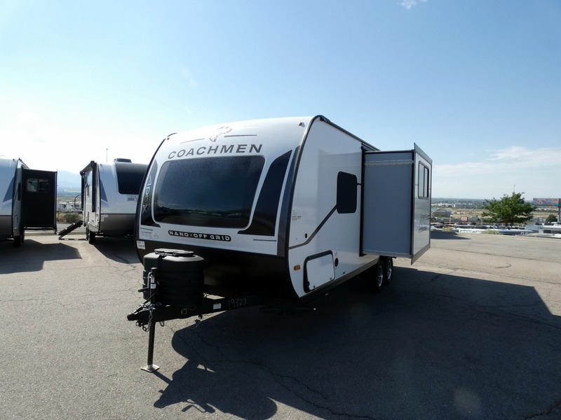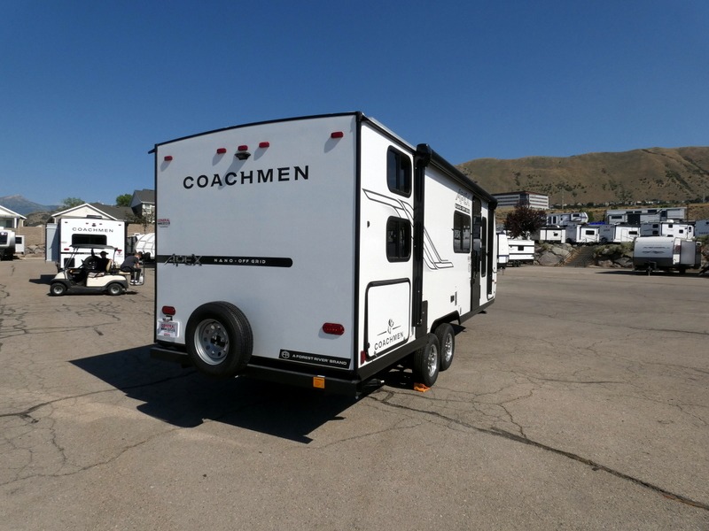 You will find comfort, convenience, and a sturdy construction with each of these Coachmen RV Apex Nano travel trailers! They are held together with an aluma-cage construction, an I-beam chassis, plus vacuum-bonded laminated dual Azdel fiberglass walls for double the protection against the elements. The 200-watt solar panel with a 30 amp control charger is included within the Off-Grid Package, along with two 20 lb. LP tanks, a high velocity power roof vent, plus 12V outlets to keep you powered up. More exterior feature include a hot/cold shower, four stabilizer jacks, a power awning with LED lighting, and magnetic baggage door catches to easily pack and unload your gear. You will love the interior of your Apex Nano with Congoleum residential flooring, one-piece seamless edge countertops, matte black hardware in the galley, and a hand-crafted wood medicine cabinet in the bath.