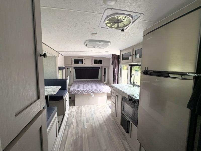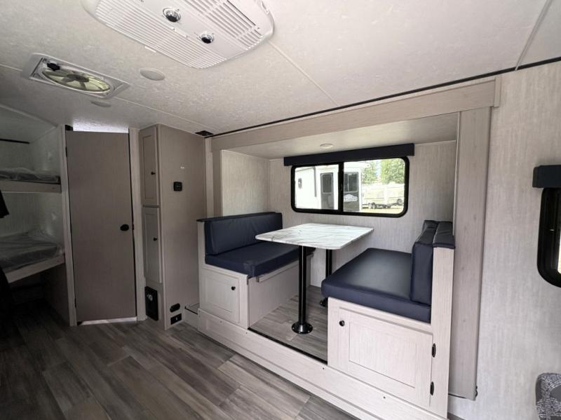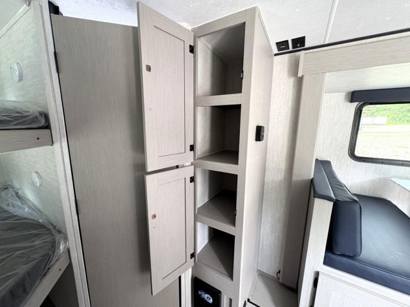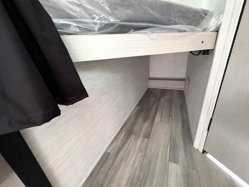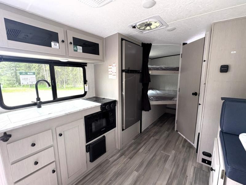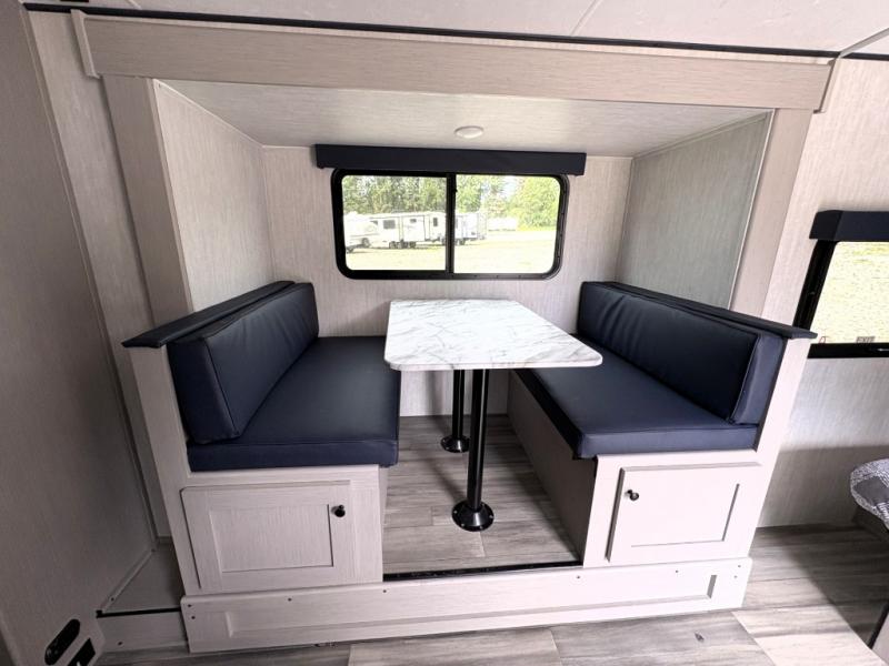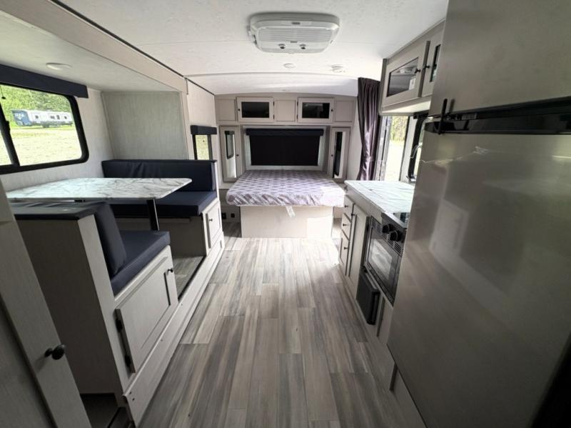 You and a few friends or family members can camp comfortably in this travel trailer! It features a front queen bed with wardrobes on either side to keep your clothes out of the way or you can switch it out for the optional Murphy bed for more versatility. Two others can sleep on the rear corner upper double bed and lower flip up double bed. After you have fried up some eggs on the two burner cooktop and heated up a piece of banana bread in the microwave, you can head to the booth dinette slide to enjoy it. There is even a pantry to store your coffee grounds and snacks. Now that your bellies are full, you can freshen up in the rear corner bathroom with the tub/shower.