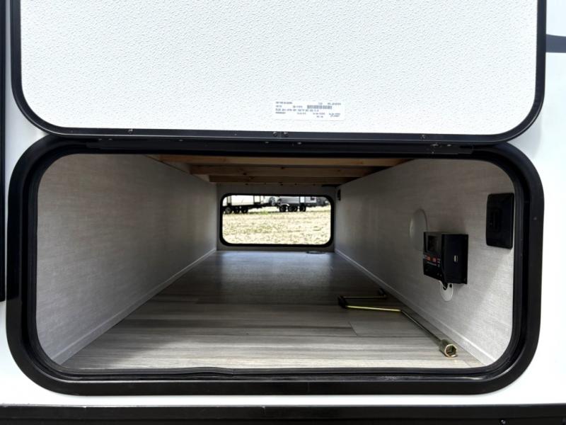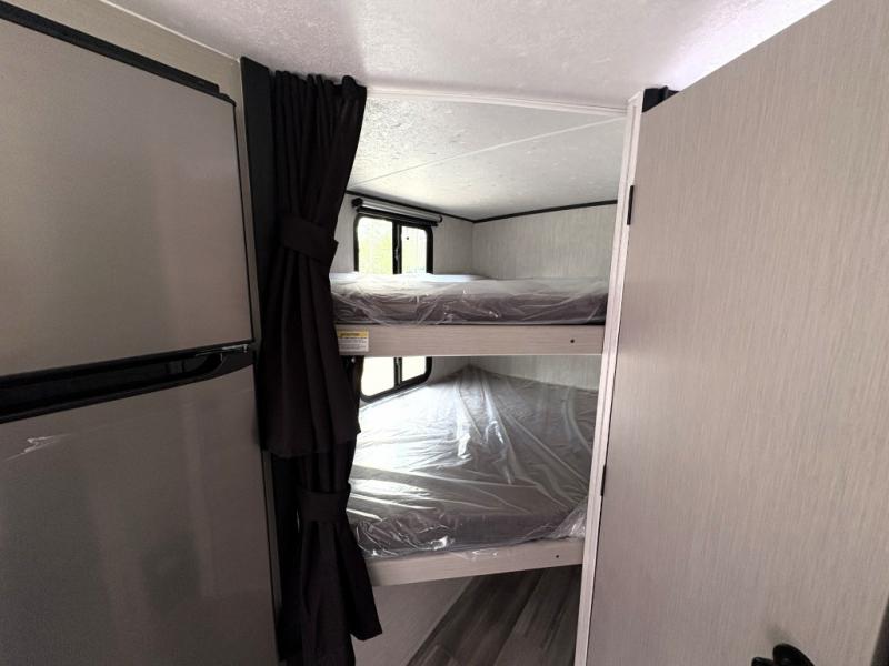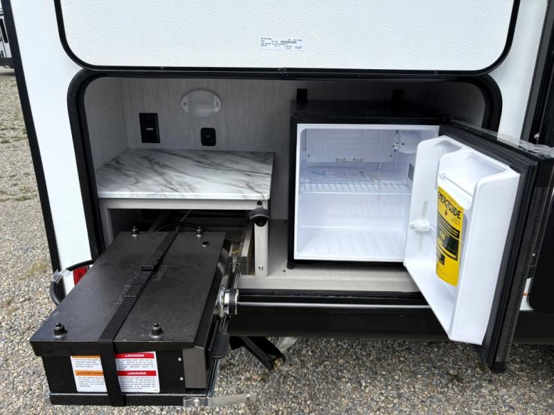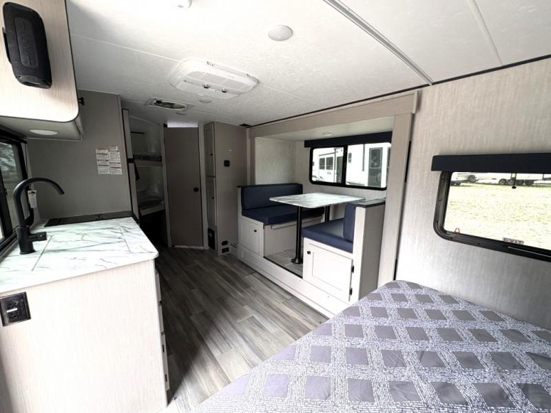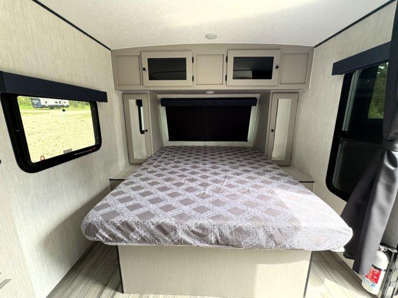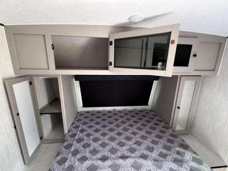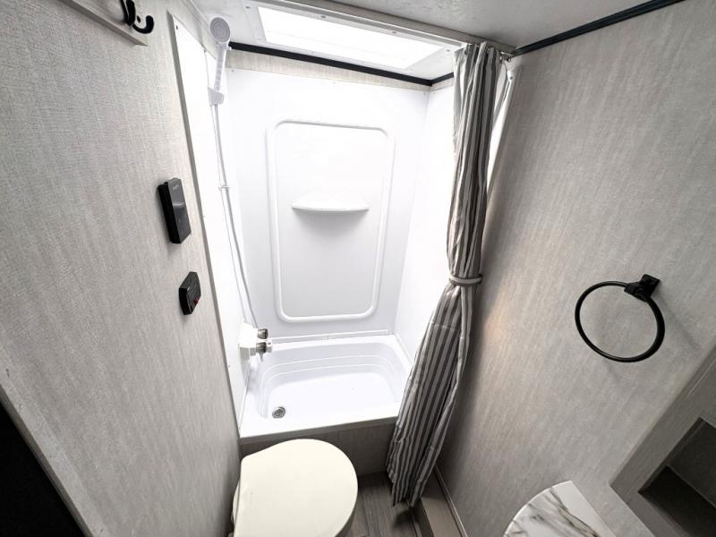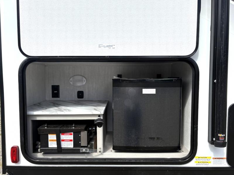 You and a few friends or family members can camp comfortably in this travel trailer! It features a front queen bed with wardrobes on either side to keep your clothes out of the way or you can switch it out for the optional Murphy bed for more versatility. Two others can sleep on the rear corner upper double bed and lower flip up double bed. After you have fried up some eggs on the two burner cooktop and heated up a piece of banana bread in the microwave, you can head to the booth dinette slide to enjoy it. There is even a pantry to store your coffee grounds and snacks. Now that your bellies are full, you can freshen up in the rear corner bathroom with the tub/shower.