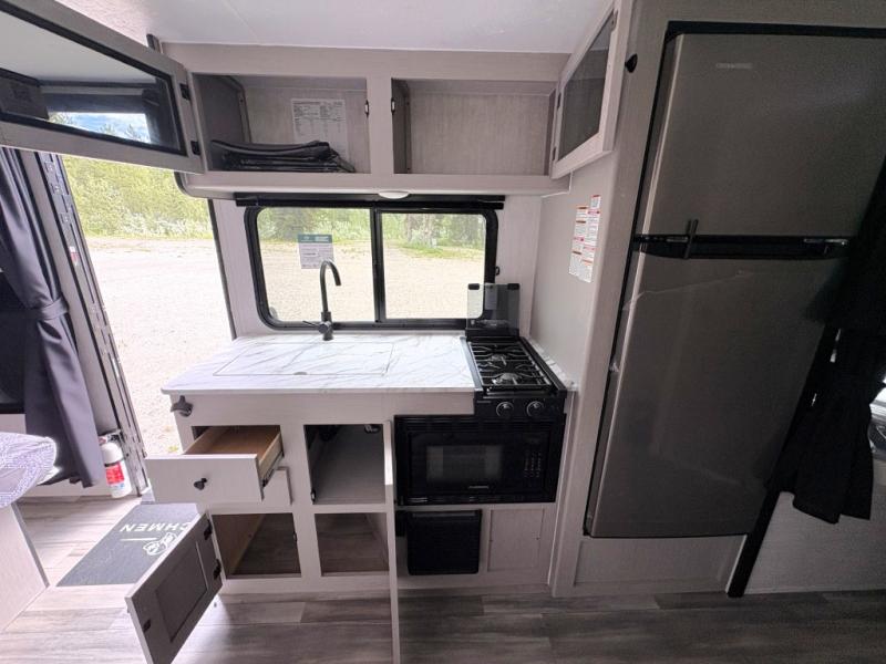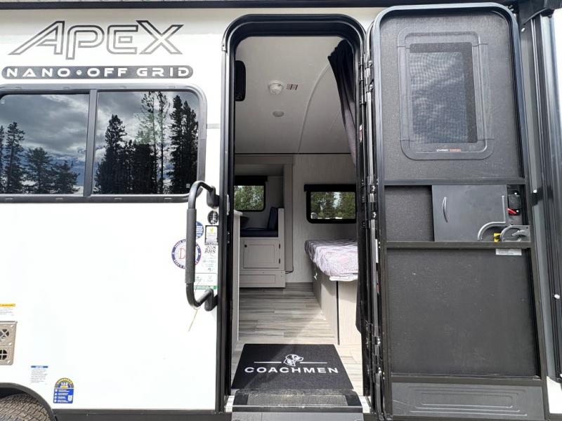 You will find comfort, convenience, and a sturdy construction with each of these Coachmen RV Apex Nano travel trailers! They are held together with an aluma-cage construction, an I-beam chassis, plus vacuum-bonded laminated dual Azdel fiberglass walls for double the protection against the elements. The 200-watt solar panel with a 30 amp control charger is included within the Off-Grid Package, along with two 20 lb. LP tanks, a high velocity power roof vent, plus 12V outlets to keep you powered up. More exterior feature include a hot/cold shower, four stabilizer jacks, a power awning with LED lighting, and magnetic baggage door catches to easily pack and unload your gear. You will love the interior of your Apex Nano with Congoleum residential flooring, one-piece seamless edge countertops, matte black hardware in the galley, and a hand-crafted wood medicine cabinet in the bath.