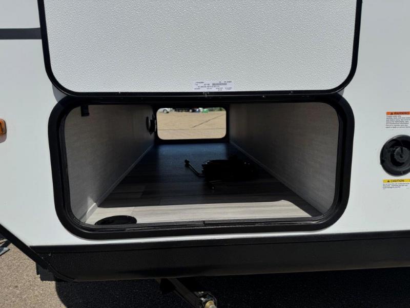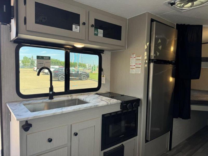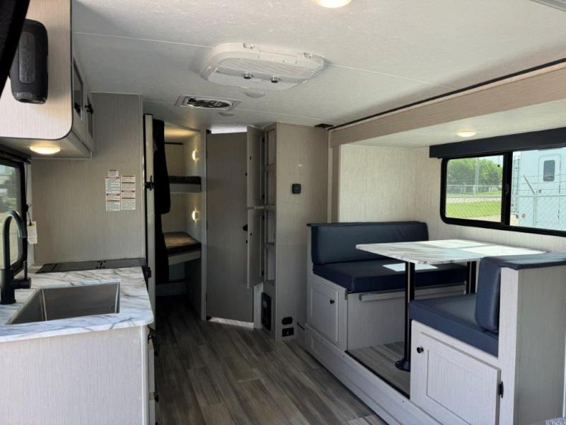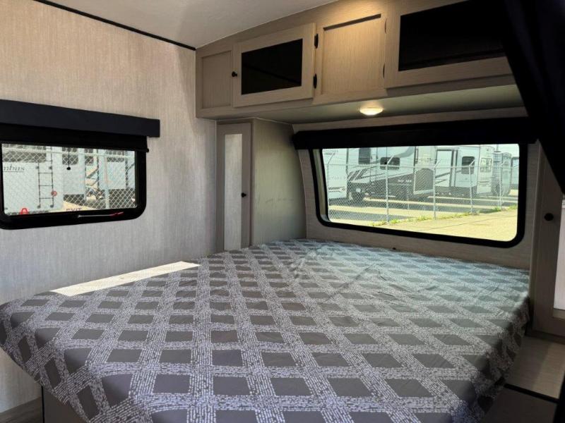 You and a few friends or family members can camp comfortably in this travel trailer! It features a front queen bed with wardrobes on either side to keep your clothes out of the way or you can switch it out for the optional Murphy bed for more versatility. Two others can sleep on the rear corner upper double bed and lower flip up double bed. After you have fried up some eggs on the two burner cooktop and heated up a piece of banana bread in the microwave, you can head to the booth dinette slide to enjoy it. There is even a pantry to store your coffee grounds and snacks. Now that your bellies are full, you can freshen up in the rear corner bathroom with the tub/shower.