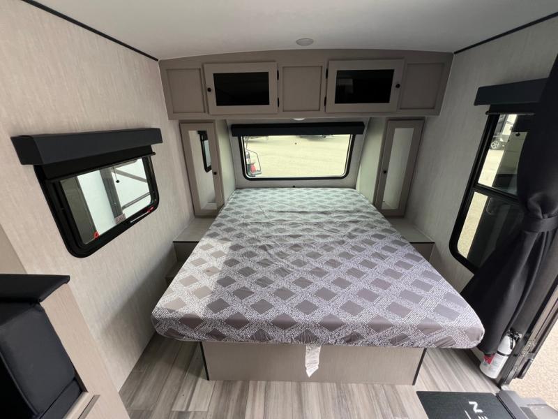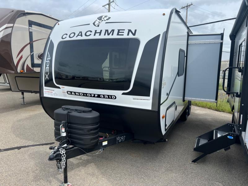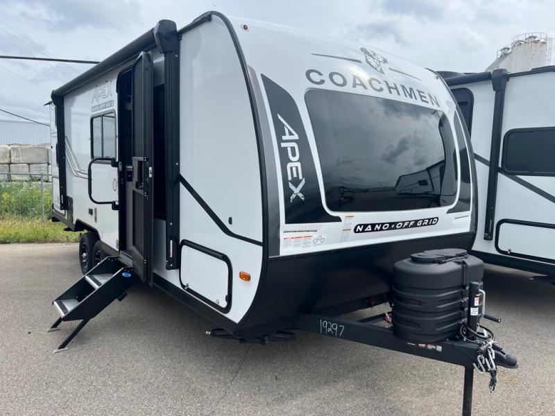 You will find comfort, convenience, and a sturdy construction with each of these Coachmen RV Apex Nano travel trailers! They are held together with an aluma-cage construction, an I-beam chassis, plus vacuum-bonded laminated dual Azdel fiberglass walls for double the protection against the elements. The 200-watt solar panel with a 30 amp control charger is included within the Off-Grid Package, along with two 20 lb. LP tanks, a high velocity power roof vent, plus 12V outlets to keep you powered up. More exterior feature include a hot/cold shower, four stabilizer jacks, a power awning with LED lighting, and magnetic baggage door catches to easily pack and unload your gear. You will love the interior of your Apex Nano with Congoleum residential flooring, one-piece seamless edge countertops, matte black hardware in the galley, and a hand-crafted wood medicine cabinet in the bath.