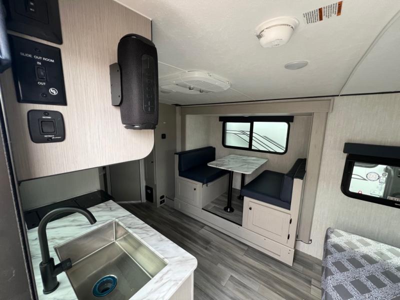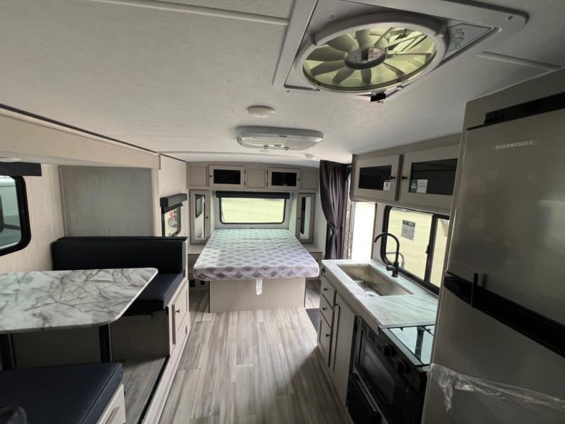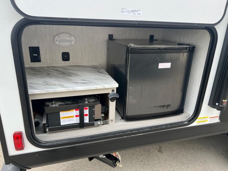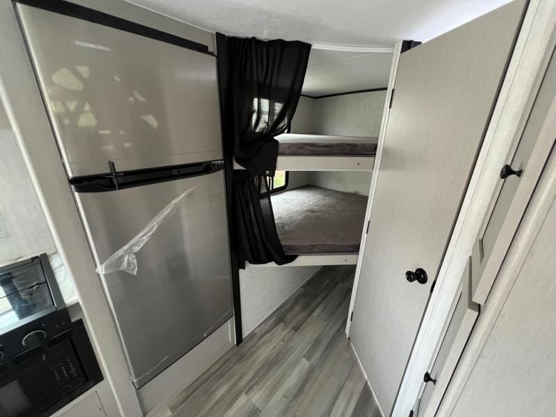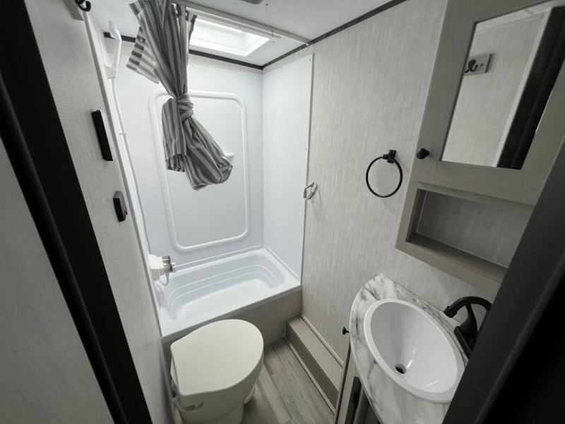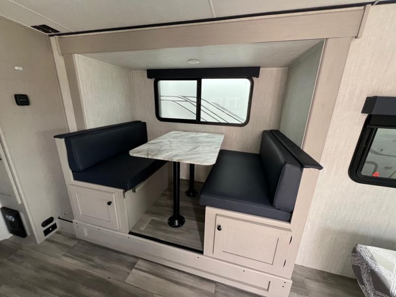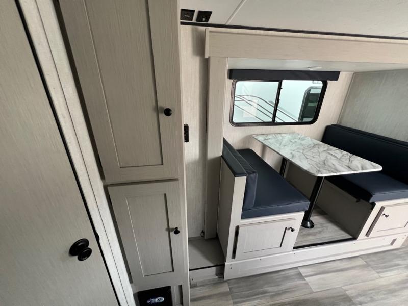 You and a few friends or family members can camp comfortably in this travel trailer! It features a front queen bed with wardrobes on either side to keep your clothes out of the way or you can switch it out for the optional Murphy bed for more versatility. Two others can sleep on the rear corner upper double bed and lower flip up double bed. After you have fried up some eggs on the two burner cooktop and heated up a piece of banana bread in the microwave, you can head to the booth dinette slide to enjoy it. There is even a pantry to store your coffee grounds and snacks. Now that your bellies are full, you can freshen up in the rear corner bathroom with the tub/shower.