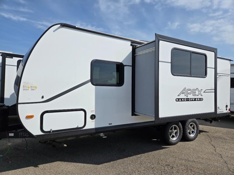 You will find comfort, convenience, and a sturdy construction with each of these Coachmen RV Apex Nano travel trailers! They are held together with an aluma-cage construction, an I-beam chassis, plus vacuum-bonded laminated dual Azdel fiberglass walls for double the protection against the elements. The 200-watt solar panel with a 30 amp control charger is included within the Off-Grid Package, along with two 20 lb. LP tanks, a high velocity power roof vent, plus 12V outlets to keep you powered up. More exterior feature include a hot/cold shower, four stabilizer jacks, a power awning with LED lighting, and magnetic baggage door catches to easily pack and unload your gear. You will love the interior of your Apex Nano with Congoleum residential flooring, one-piece seamless edge countertops, matte black hardware in the galley, and a hand-crafted wood medicine cabinet in the bath.