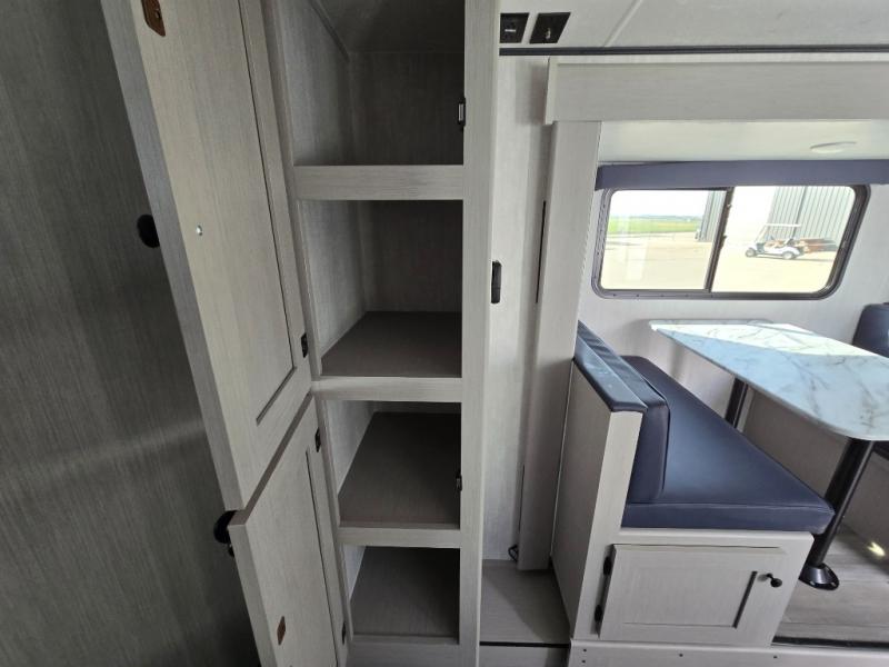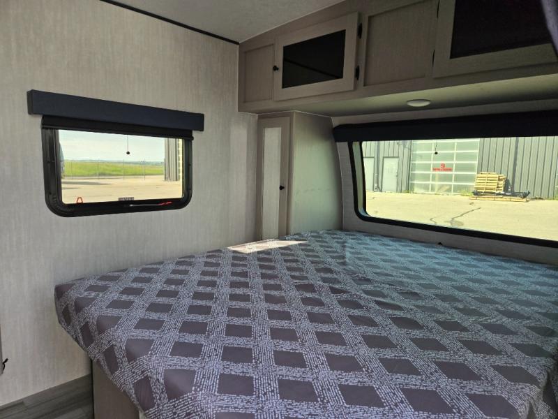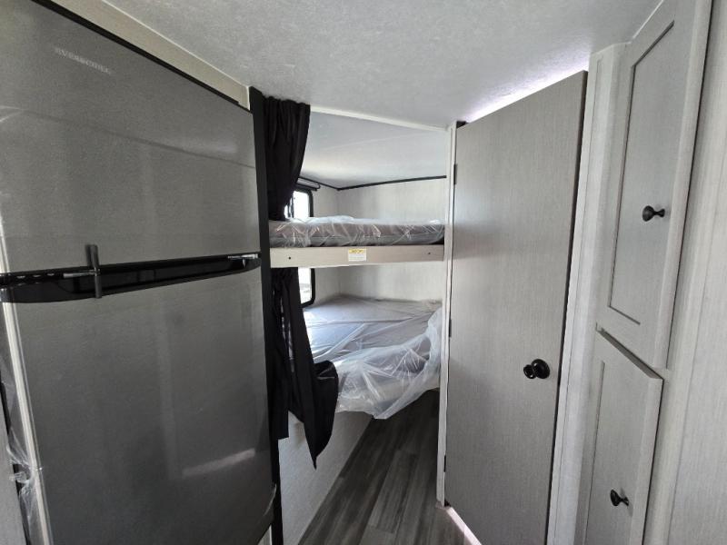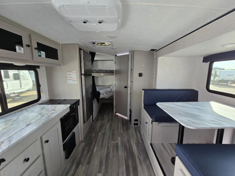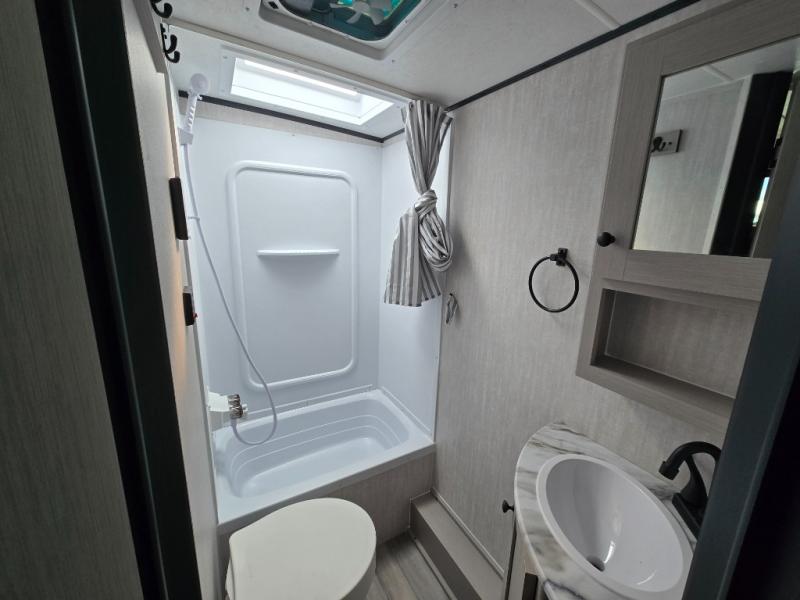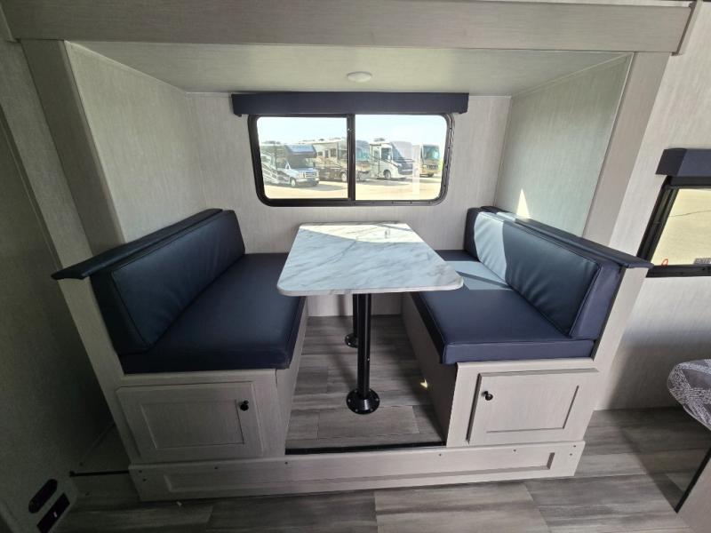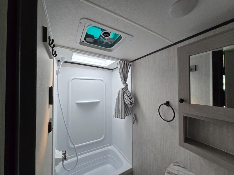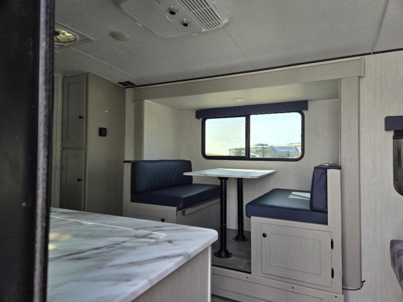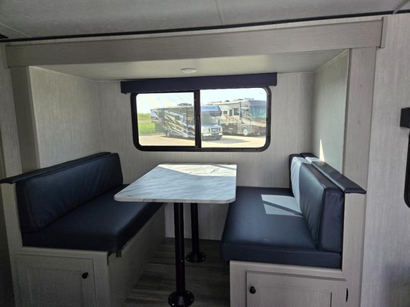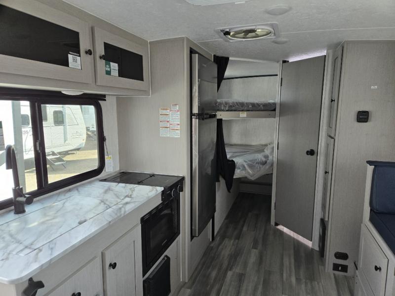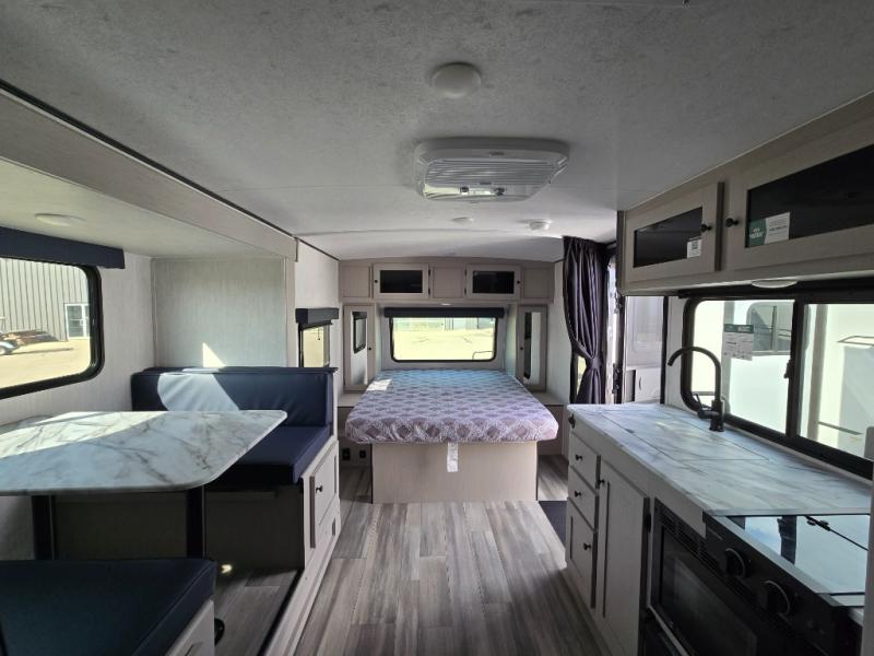 You and a few friends or family members can camp comfortably in this travel trailer! It features a front queen bed with wardrobes on either side to keep your clothes out of the way or you can switch it out for the optional Murphy bed for more versatility. Two others can sleep on the rear corner upper double bed and lower flip up double bed. After you have fried up some eggs on the two burner cooktop and heated up a piece of banana bread in the microwave, you can head to the booth dinette slide to enjoy it. There is even a pantry to store your coffee grounds and snacks. Now that your bellies are full, you can freshen up in the rear corner bathroom with the tub/shower.