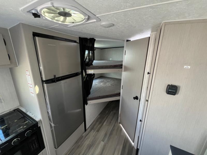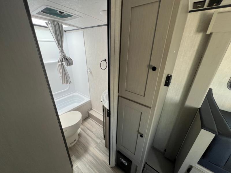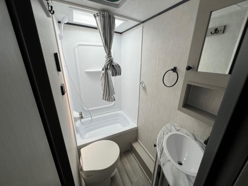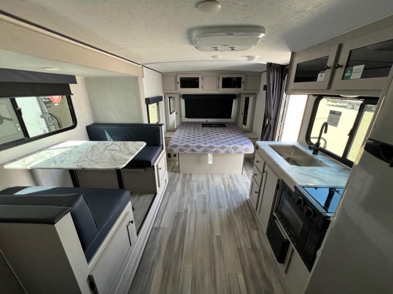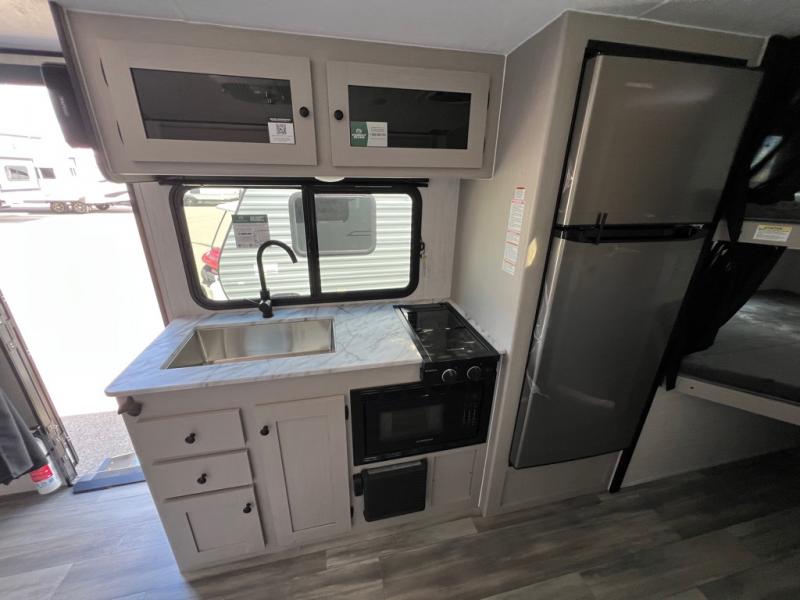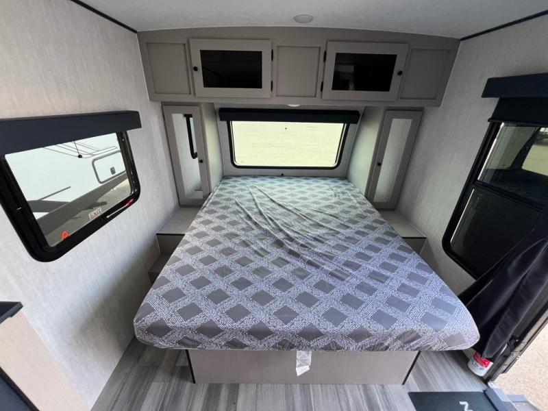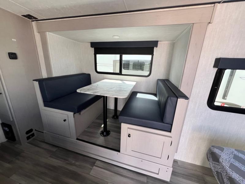You and a few friends or family members can camp comfortably in this travel trailer! It features a front queen bed with wardrobes on either side to keep your clothes out of the way or you can switch it out for the optional Murphy bed for more versatility. Two others can sleep on the rear corner upper double bed and lower flip up double bed. After you have fried up some eggs on the two burner cooktop and heated up a piece of banana bread in the microwave, you can head to the booth dinette slide to enjoy it. There is even a pantry to store your coffee grounds and snacks. Now that your bellies are full, you can freshen up in the rear corner bathroom with the tub/shower.