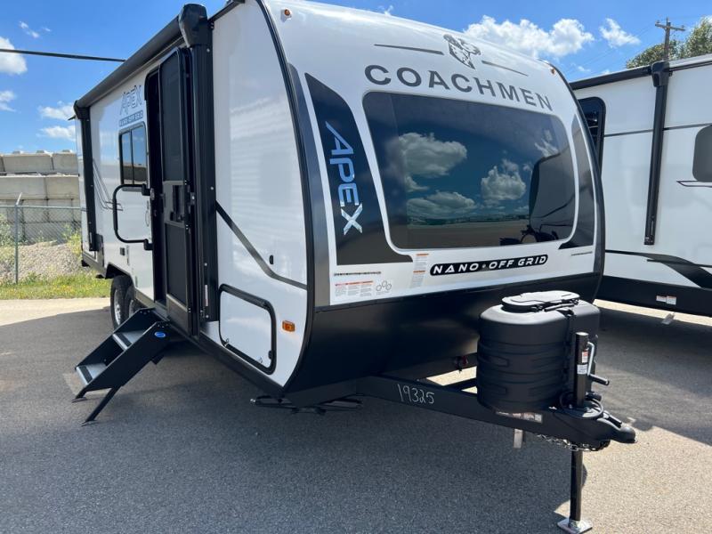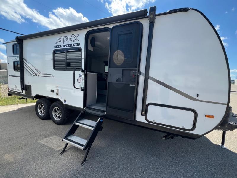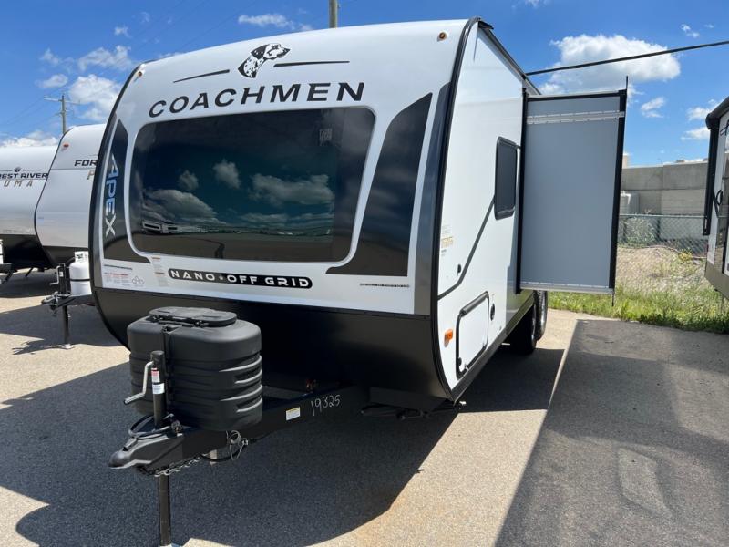 You will find comfort, convenience, and a sturdy construction with each of these Coachmen RV Apex Nano travel trailers! They are held together with an aluma-cage construction, an I-beam chassis, plus vacuum-bonded laminated dual Azdel fiberglass walls for double the protection against the elements. The 200-watt solar panel with a 30 amp control charger is included within the Off-Grid Package, along with two 20 lb. LP tanks, a high velocity power roof vent, plus 12V outlets to keep you powered up. More exterior feature include a hot/cold shower, four stabilizer jacks, a power awning with LED lighting, and magnetic baggage door catches to easily pack and unload your gear. You will love the interior of your Apex Nano with Congoleum residential flooring, one-piece seamless edge countertops, matte black hardware in the galley, and a hand-crafted wood medicine cabinet in the bath.