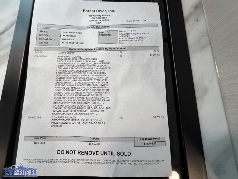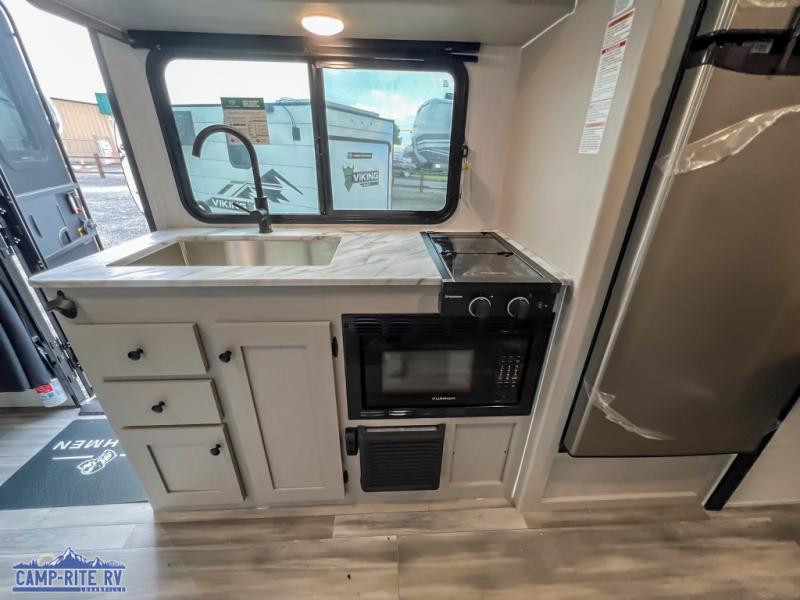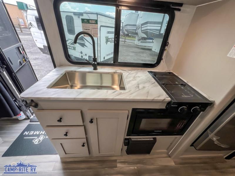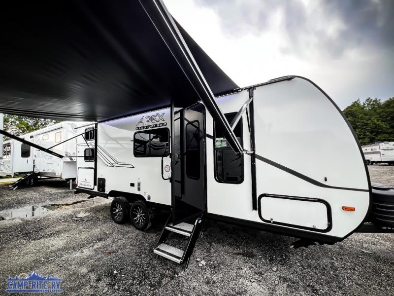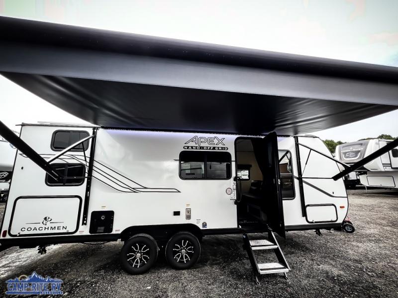 You will find comfort, convenience, and a sturdy construction with each of these Coachmen RV Apex Nano travel trailers! They are held together with an aluma-cage construction, an I-beam chassis, plus vacuum-bonded laminated dual Azdel fiberglass walls for double the protection against the elements. The 200-watt solar panel with a 30 amp control charger is included within the Off-Grid Package, along with two 20 lb. LP tanks, a high velocity power roof vent, plus 12V outlets to keep you powered up. More exterior feature include a hot/cold shower, four stabilizer jacks, a power awning with LED lighting, and magnetic baggage door catches to easily pack and unload your gear. You will love the interior of your Apex Nano with Congoleum residential flooring, one-piece seamless edge countertops, matte black hardware in the galley, and a hand-crafted wood medicine cabinet in the bath.