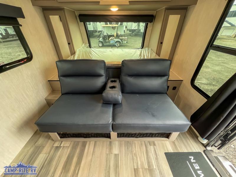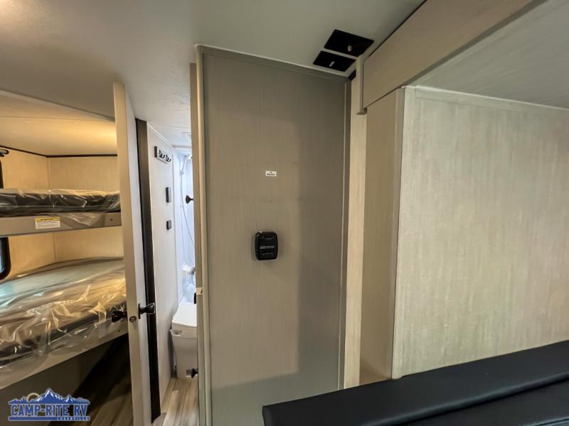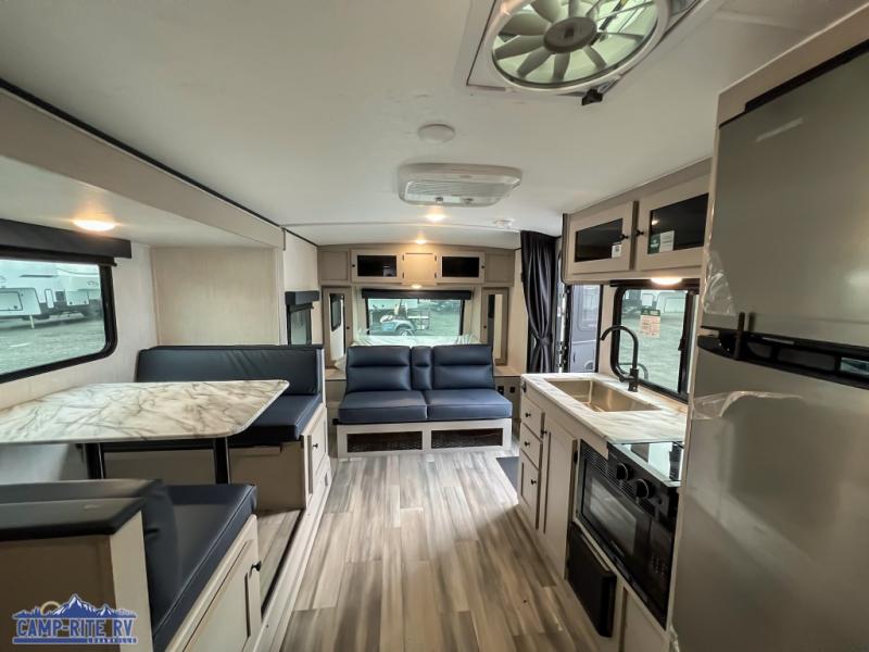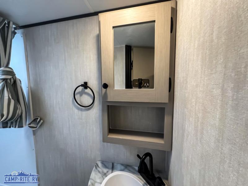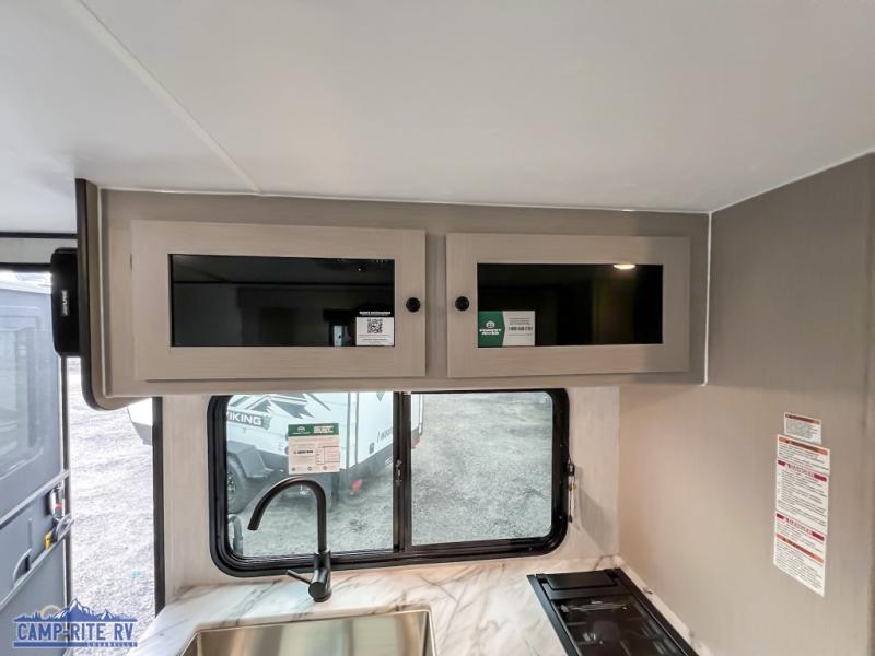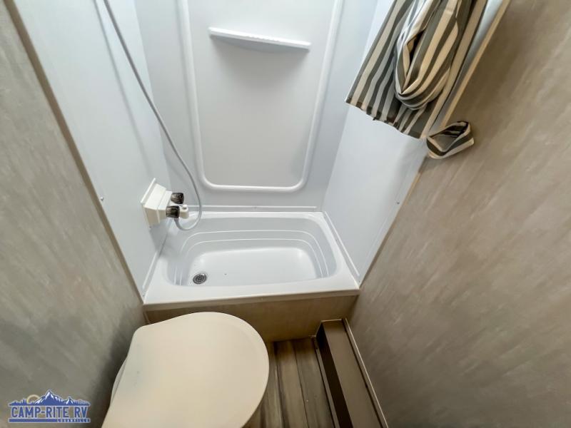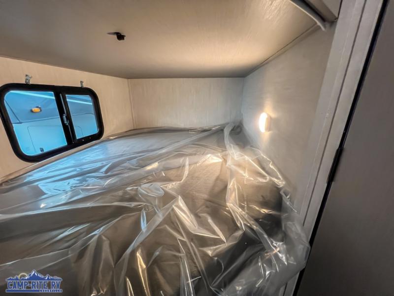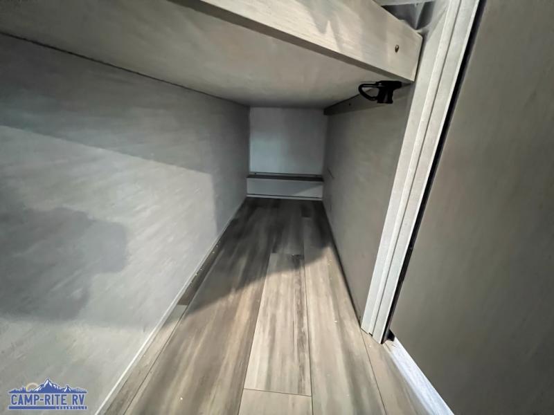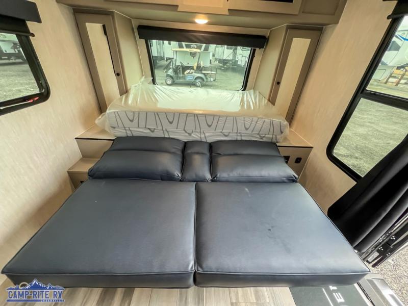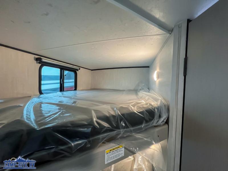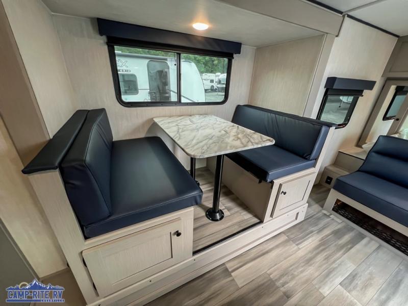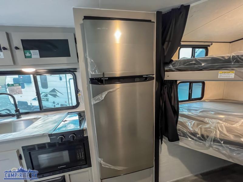 You and a few friends or family members can camp comfortably in this travel trailer! It features a front queen bed with wardrobes on either side to keep your clothes out of the way or you can switch it out for the optional Murphy bed for more versatility. Two others can sleep on the rear corner upper double bed and lower flip up double bed. After you have fried up some eggs on the two burner cooktop and heated up a piece of banana bread in the microwave, you can head to the booth dinette slide to enjoy it. There is even a pantry to store your coffee grounds and snacks. Now that your bellies are full, you can freshen up in the rear corner bathroom with the tub/shower.