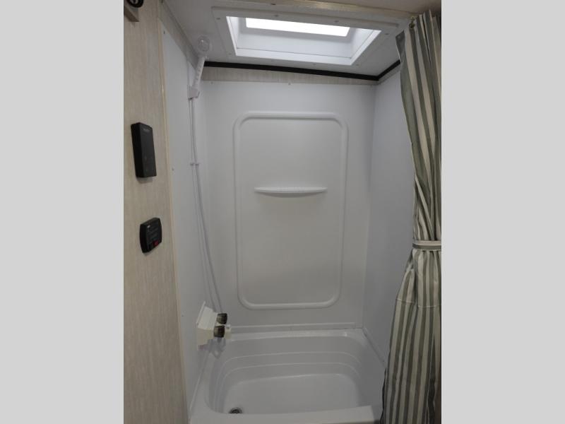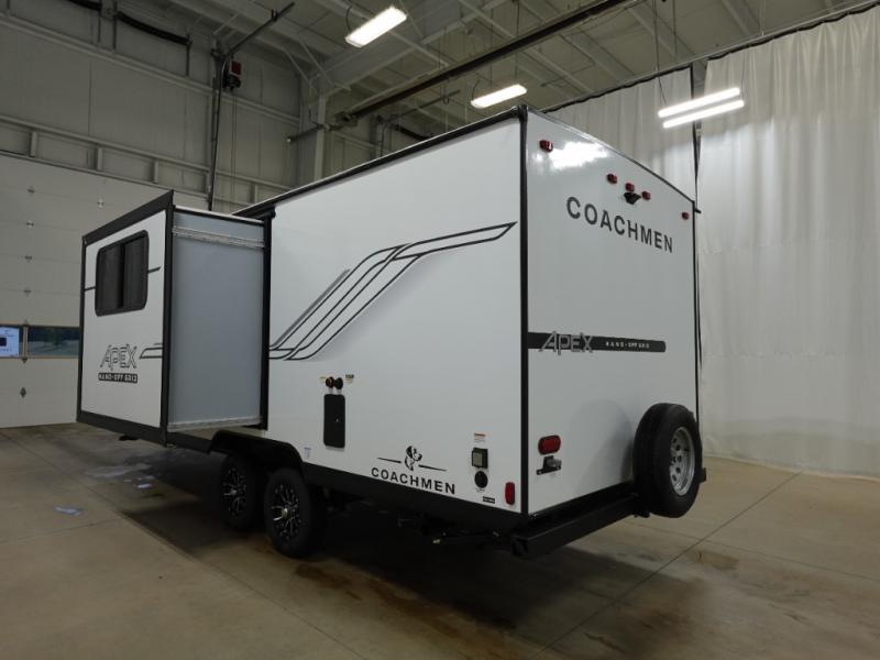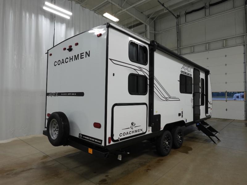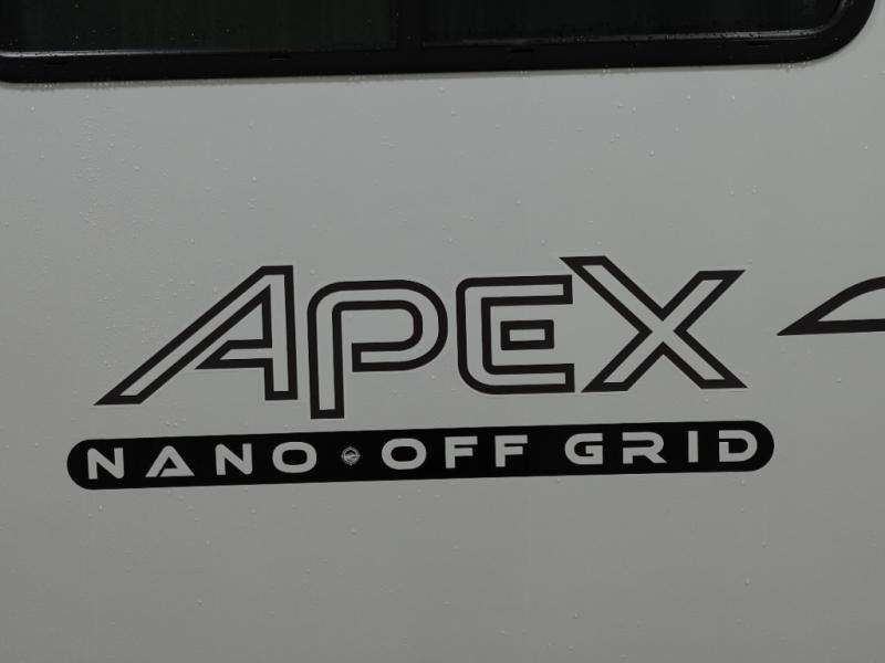 You will find comfort, convenience, and a sturdy construction with each of these Coachmen RV Apex Nano travel trailers! They are held together with an aluma-cage construction, an I-beam chassis, plus vacuum-bonded laminated dual Azdel fiberglass walls for double the protection against the elements. The 200-watt solar panel with a 30 amp control charger is included within the Off-Grid Package, along with two 20 lb. LP tanks, a high velocity power roof vent, plus 12V outlets to keep you powered up. More exterior feature include a hot/cold shower, four stabilizer jacks, a power awning with LED lighting, and magnetic baggage door catches to easily pack and unload your gear. You will love the interior of your Apex Nano with Congoleum residential flooring, one-piece seamless edge countertops, matte black hardware in the galley, and a hand-crafted wood medicine cabinet in the bath.
