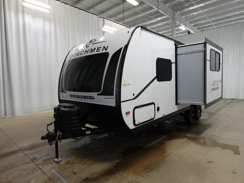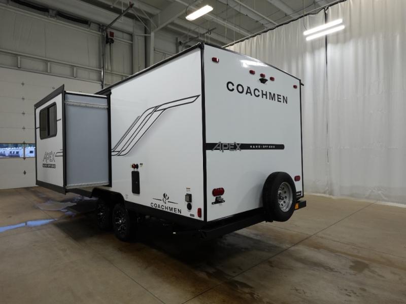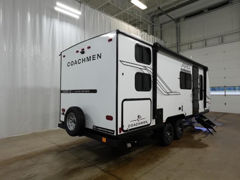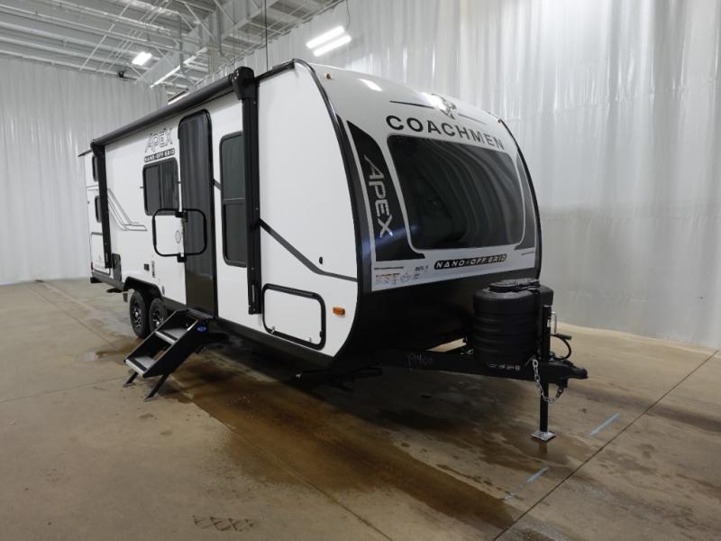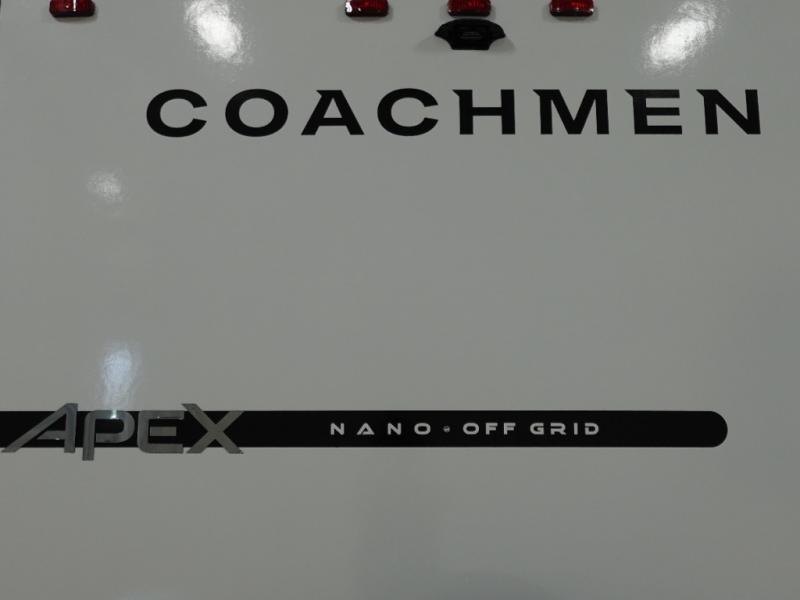 You will find comfort, convenience, and a sturdy construction with each of these Coachmen RV Apex Nano travel trailers! They are held together with an aluma-cage construction, an I-beam chassis, plus vacuum-bonded laminated dual Azdel fiberglass walls for double the protection against the elements. The 200-watt solar panel with a 30 amp control charger is included within the Off-Grid Package, along with two 20 lb. LP tanks, a high velocity power roof vent, plus 12V outlets to keep you powered up. More exterior feature include a hot/cold shower, four stabilizer jacks, a power awning with LED lighting, and magnetic baggage door catches to easily pack and unload your gear. You will love the interior of your Apex Nano with Congoleum residential flooring, one-piece seamless edge countertops, matte black hardware in the galley, and a hand-crafted wood medicine cabinet in the bath.